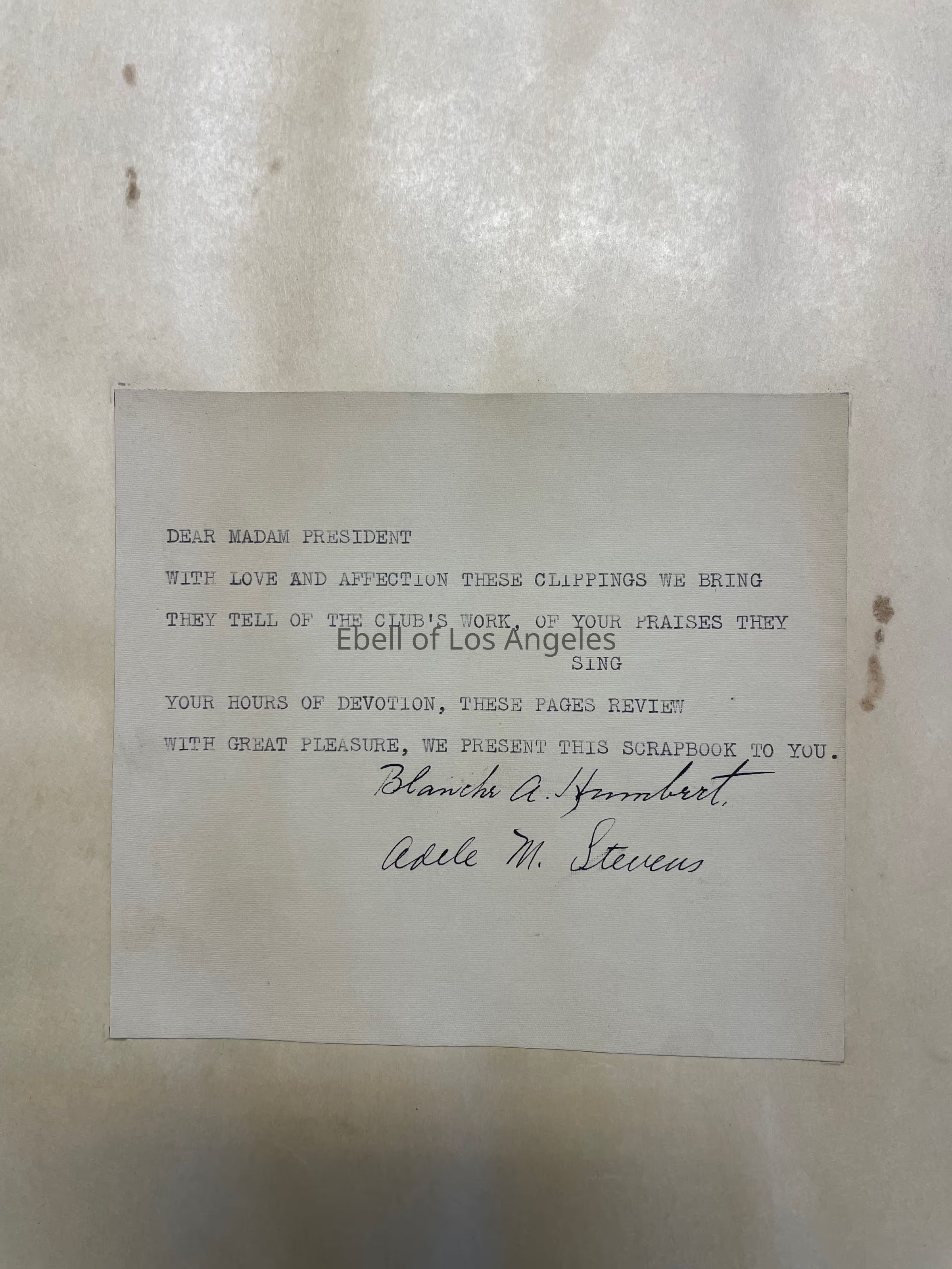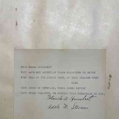 Created by Blanche A. Humbert and Adele M. Stevens during presidency of Mrs. George Harris Cook (possibly Grace Virginia Buck).Collection