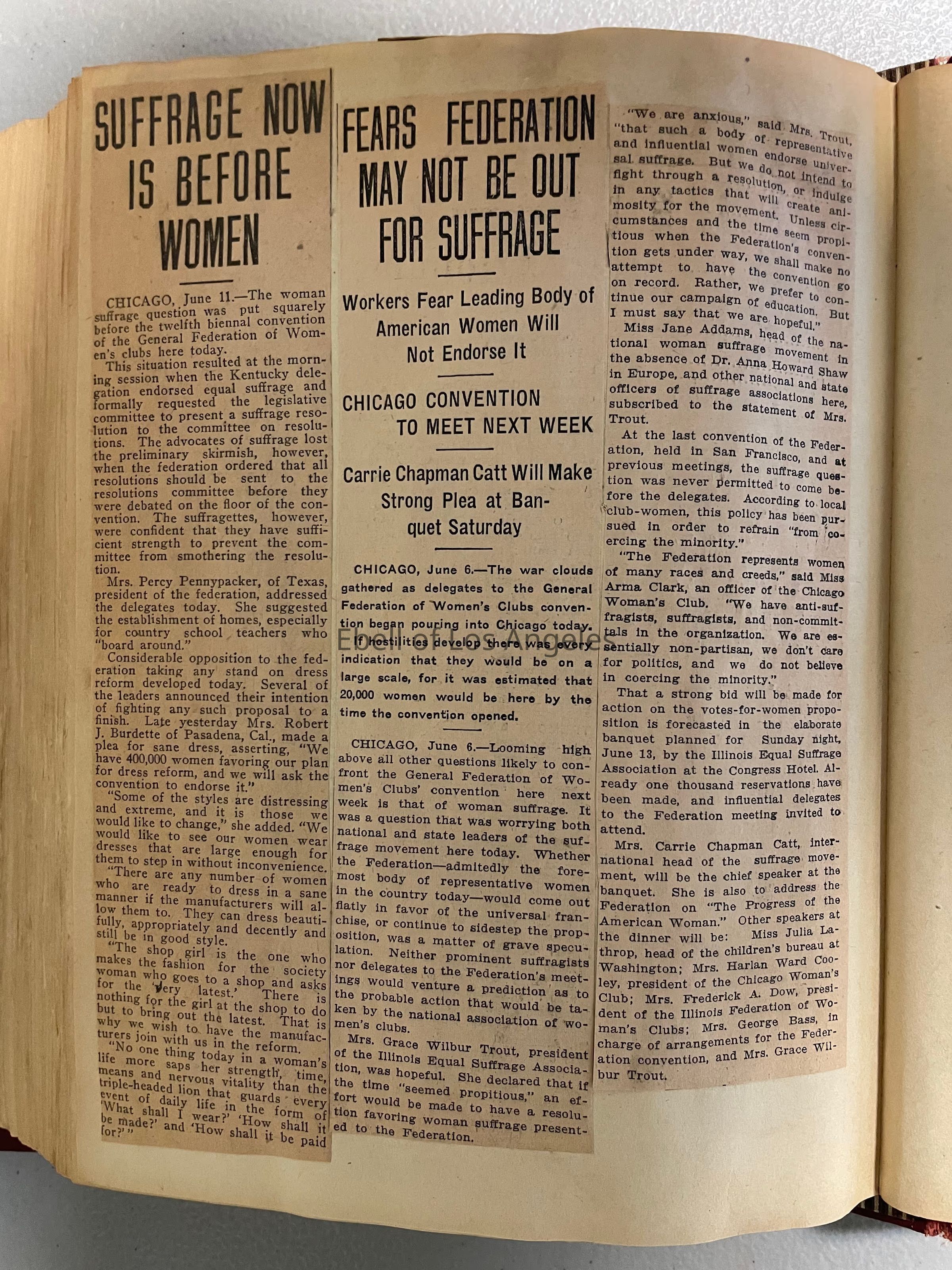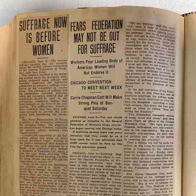 Bulk of scrapbook contains pages cut from 1913-1914 yearbook and bulletins interspersed with newspaper clippings. Includes articles on women's suffrage. One article in the back is dated 1912.