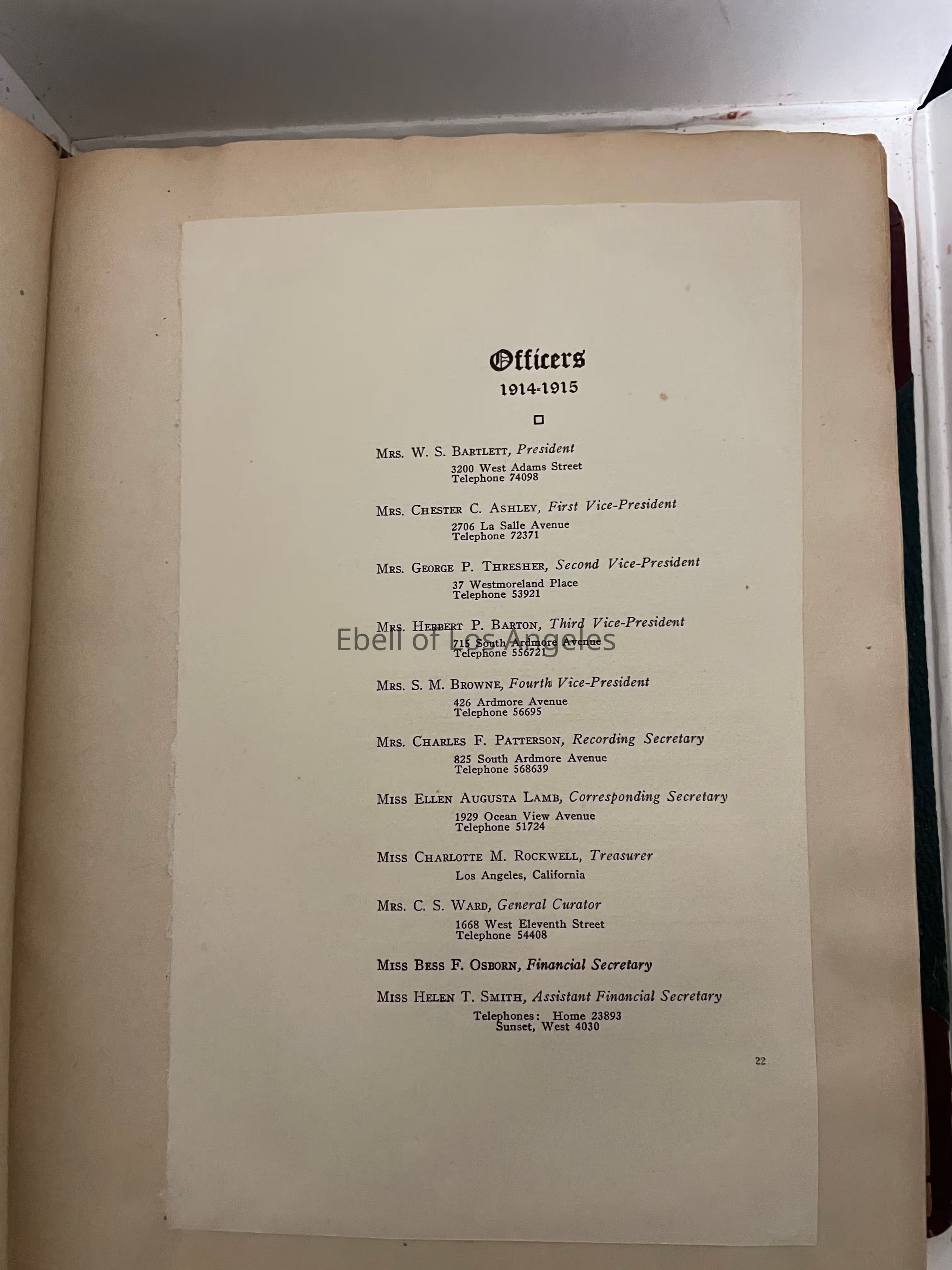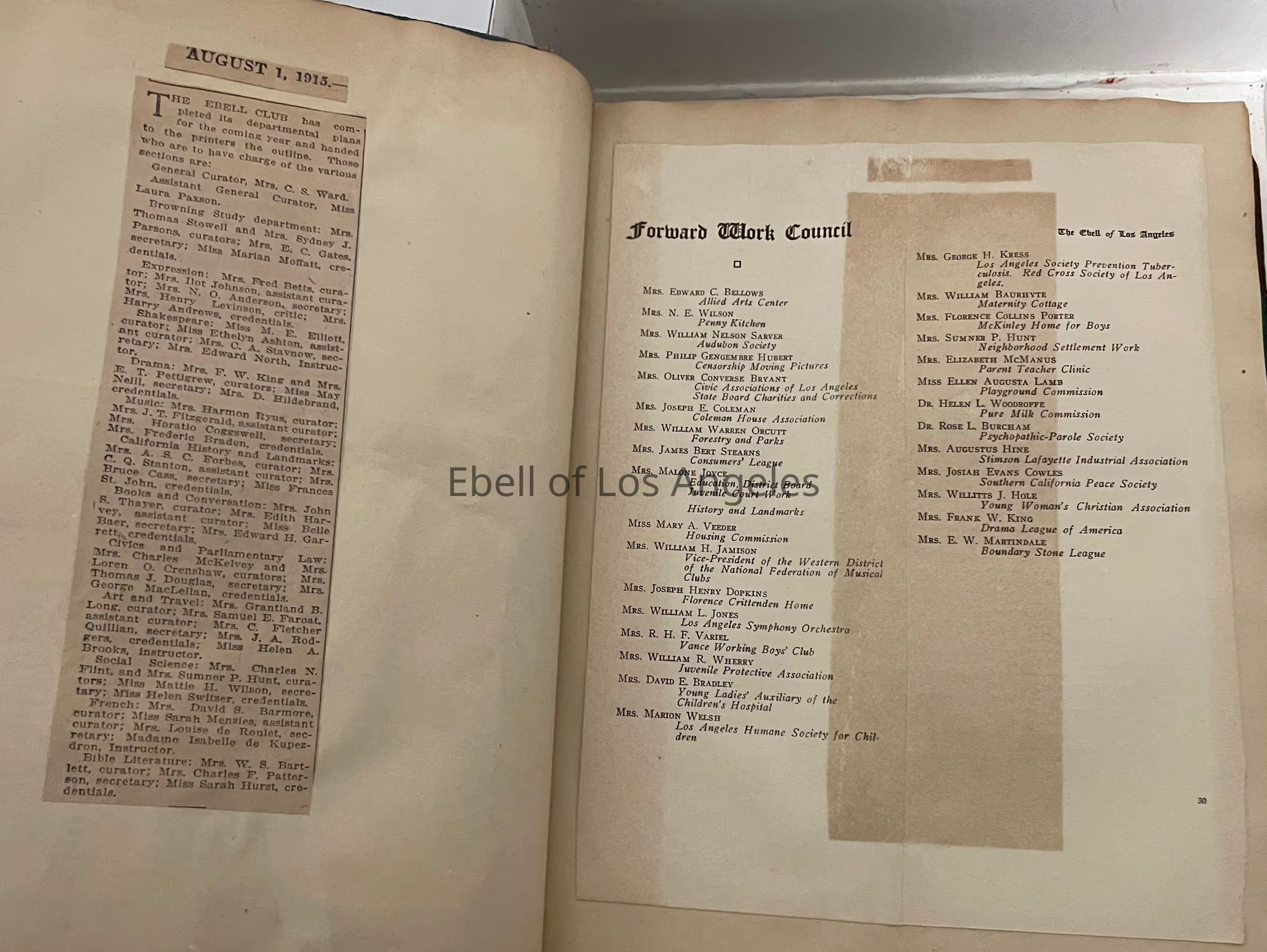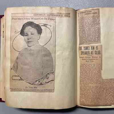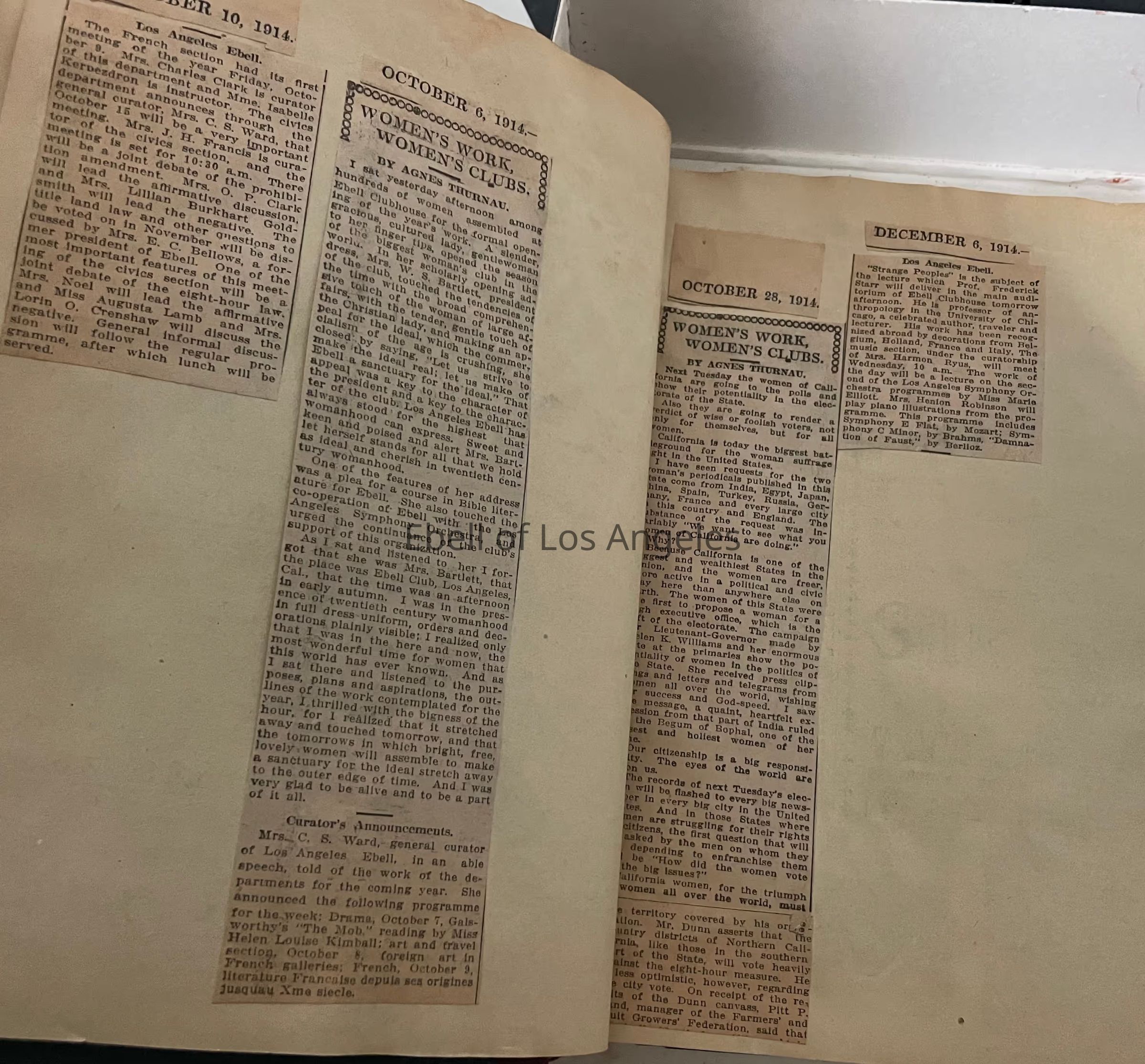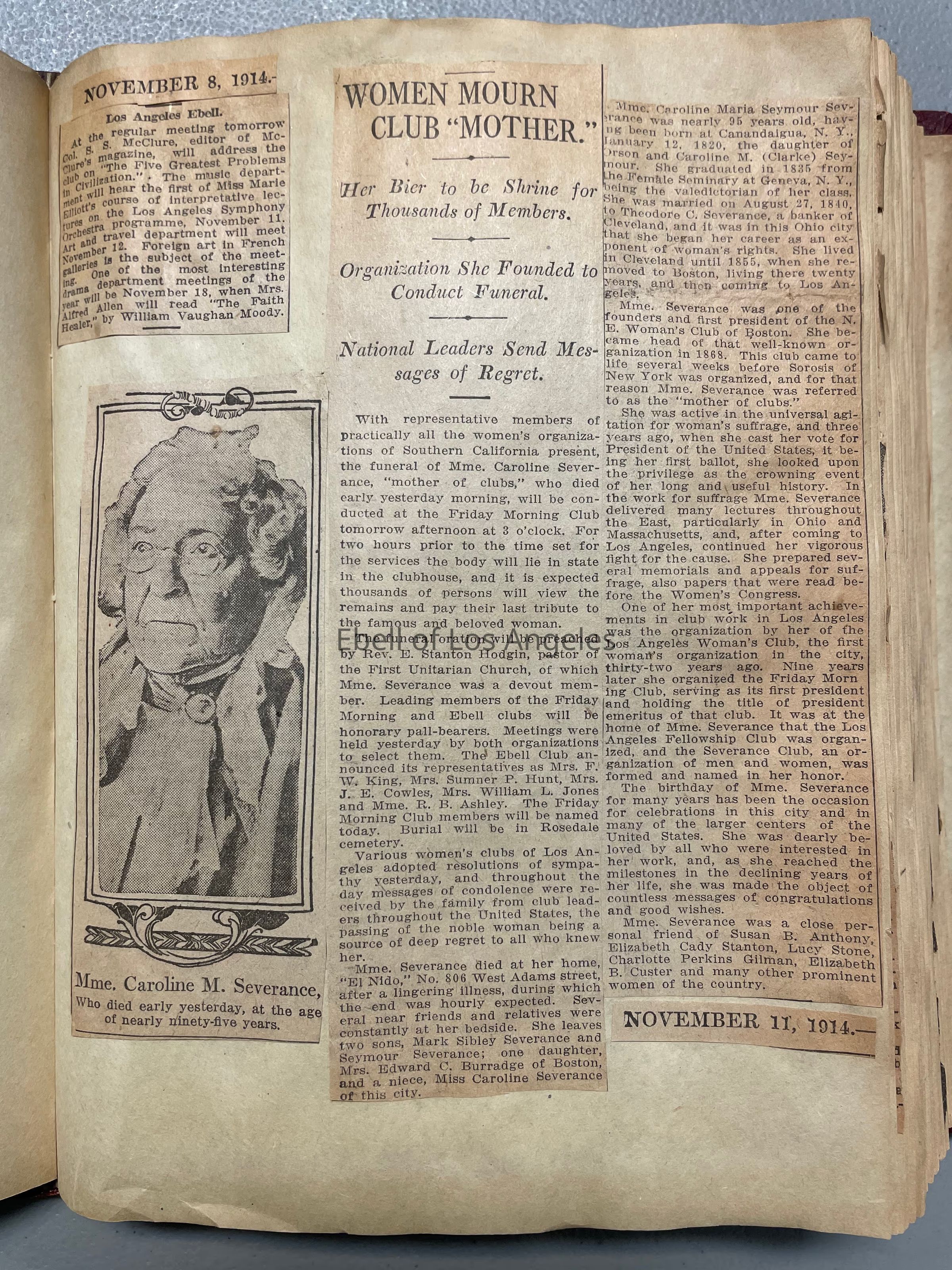 Bulk of scrapbook contains pages cut from 1914-15 yearbook and bulletins interspersed with newspaper clippings. Includes November 11, 1914 obituary for Caroline M. Severance, articles on guest lecturer, Dr. Yamei Kin, and one 1902 article on Clara Burdette.Collection