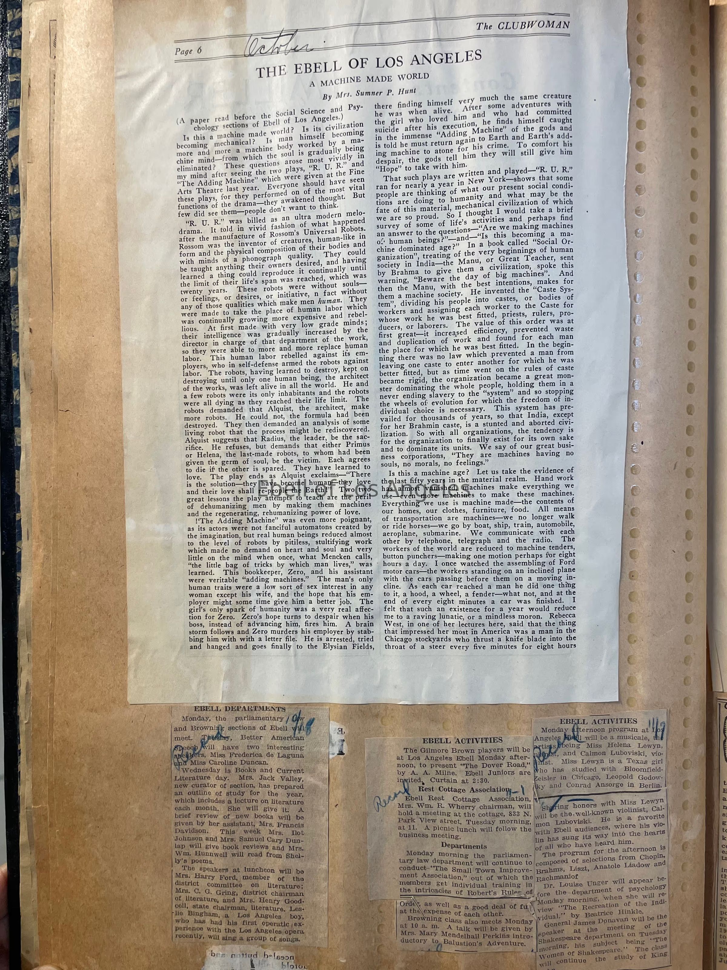 A scrapbook of clippings from newspapers, Ebell bulletins, and the periodical The Clubwoman. Also includes programs and correspondence. The contents of the scrapbook cover the years 1924 to 1925.Context
