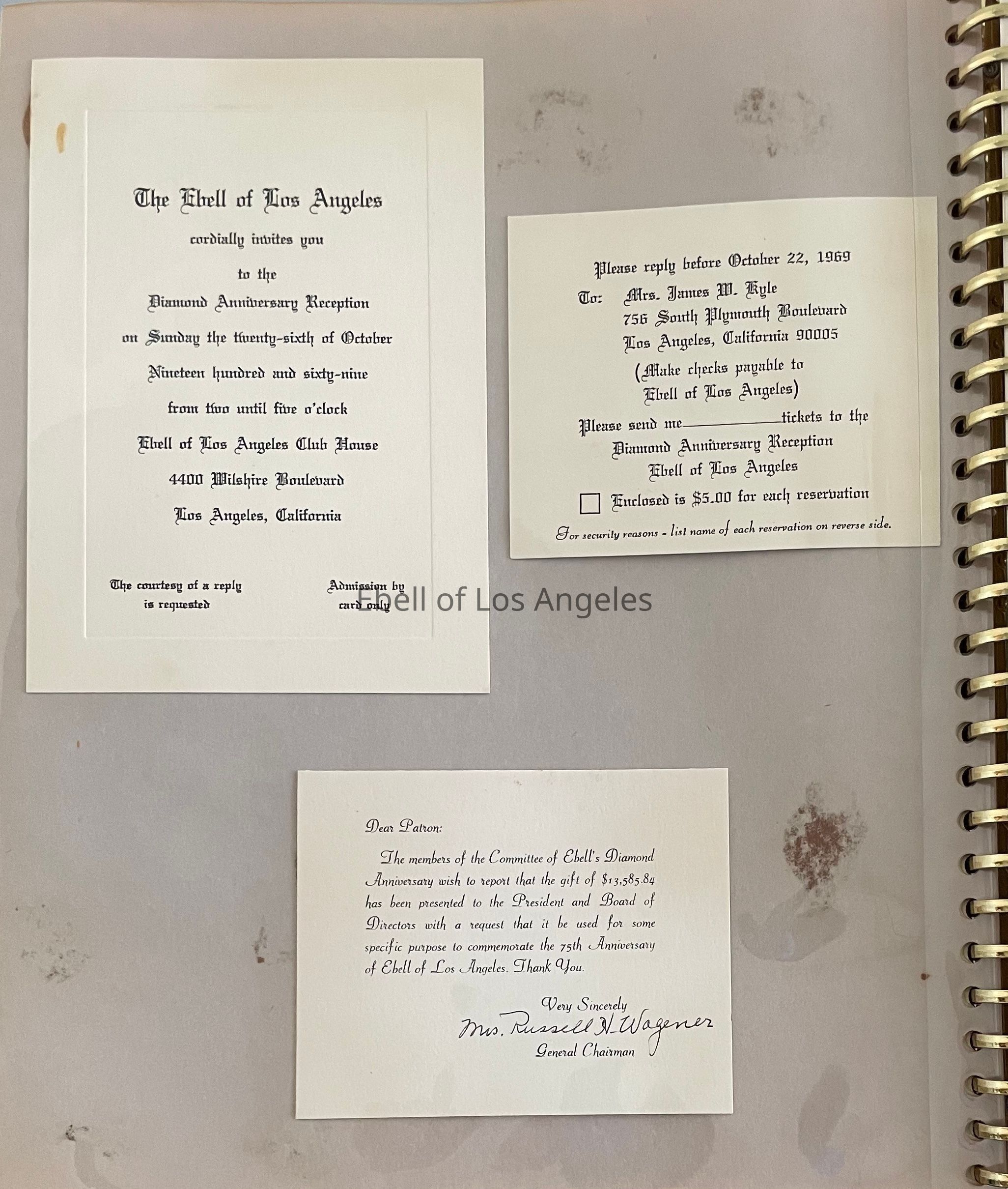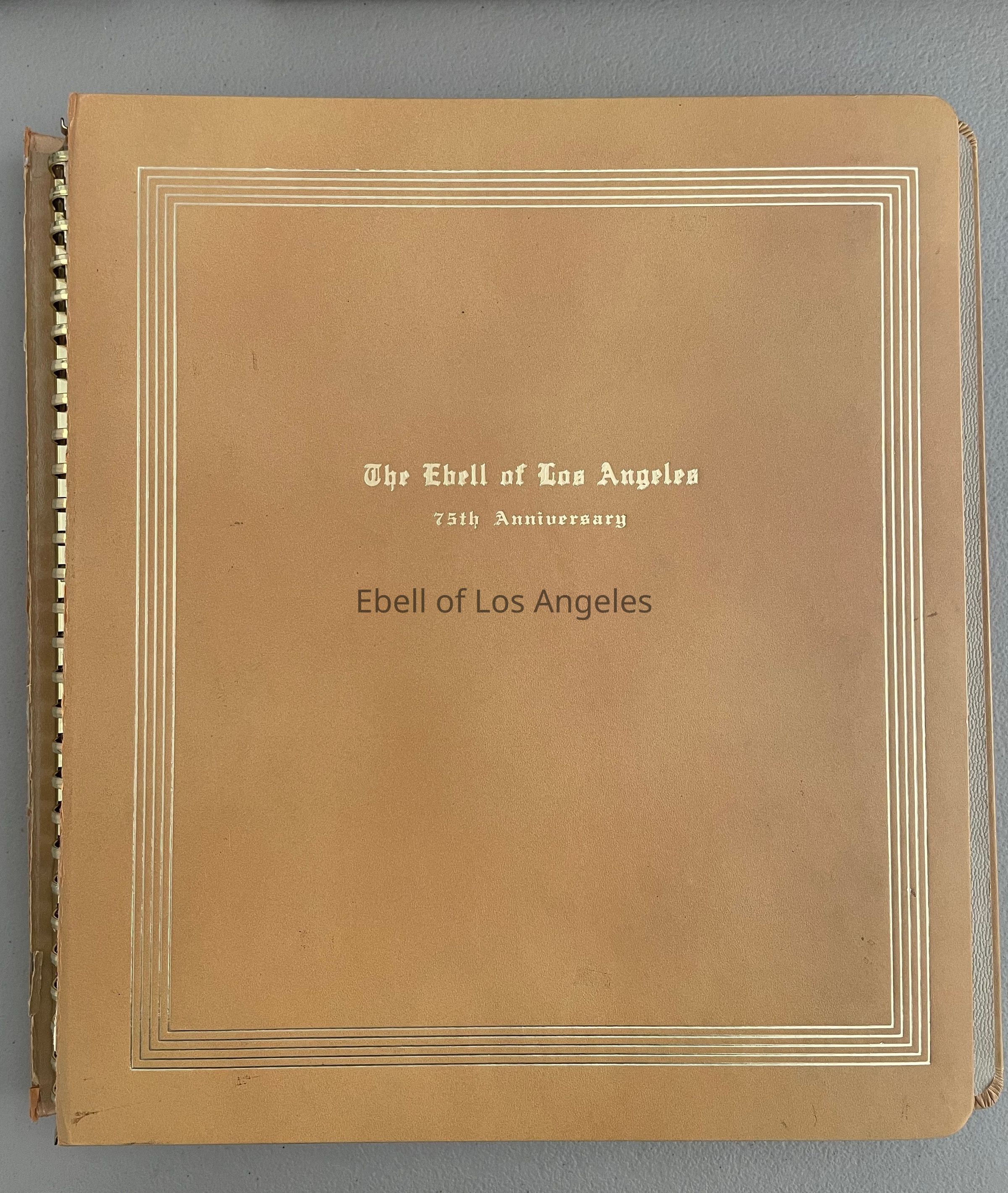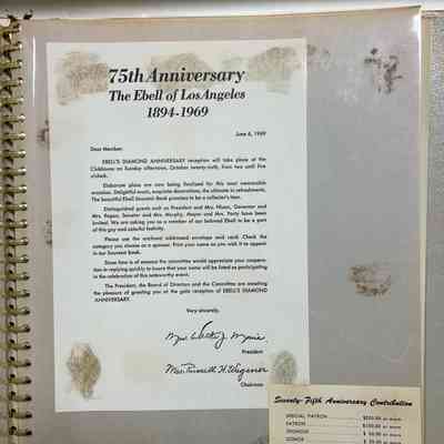 A scrapbook of news clippings, programs, announcements, telegram, napkins, calendar, and photos regarding the 75th Anniversary of the Ebell of Los Angeles in 1969. Includes photo of the Ebell Float for the "Tally-Ho" Fiesta de Los Angeles Parade and letter from the Los Angeles Public Library regarding Albro frescoes.Collection
