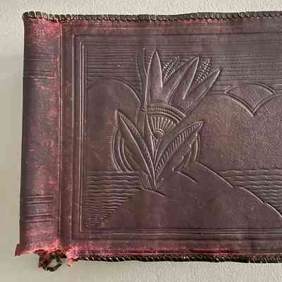 Wool hat with decoratively stitched turned up brim with bow and wide leather band on crown