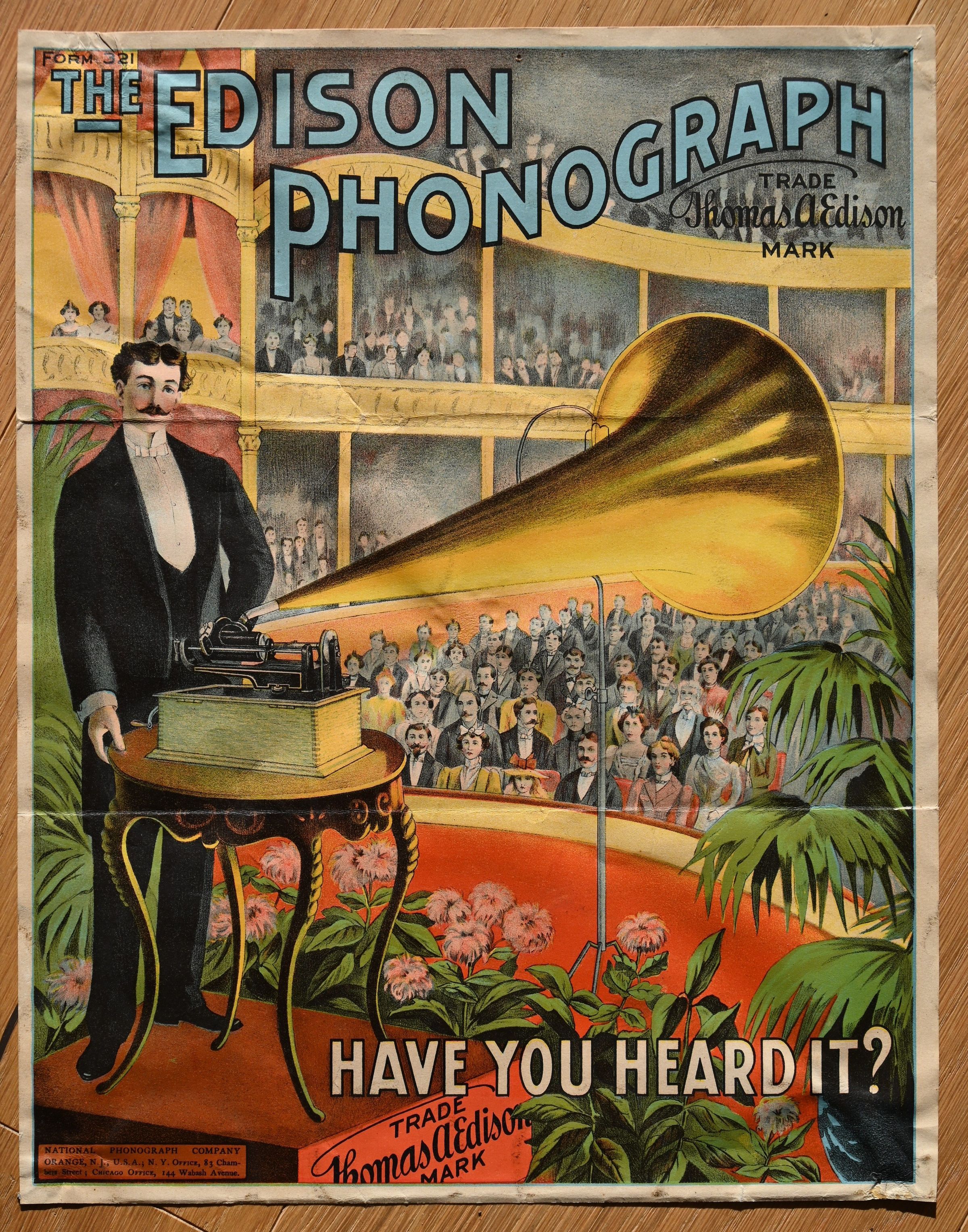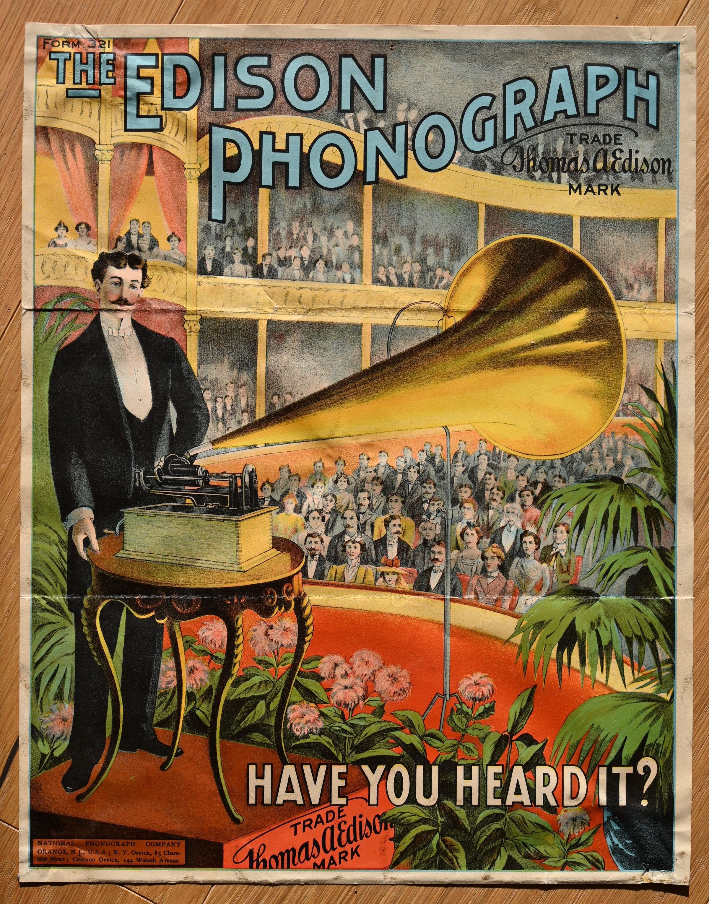 At the lower left, the imprint reads: “National Phonograph Company, Orange, N.J., U.S.A.; N.Y. Office, 83 Chambers Street; Chicago Office, 144 Wabash Avenue.” This refers to the official sales offices and documents the growing presence of Edison’s company in the United States.