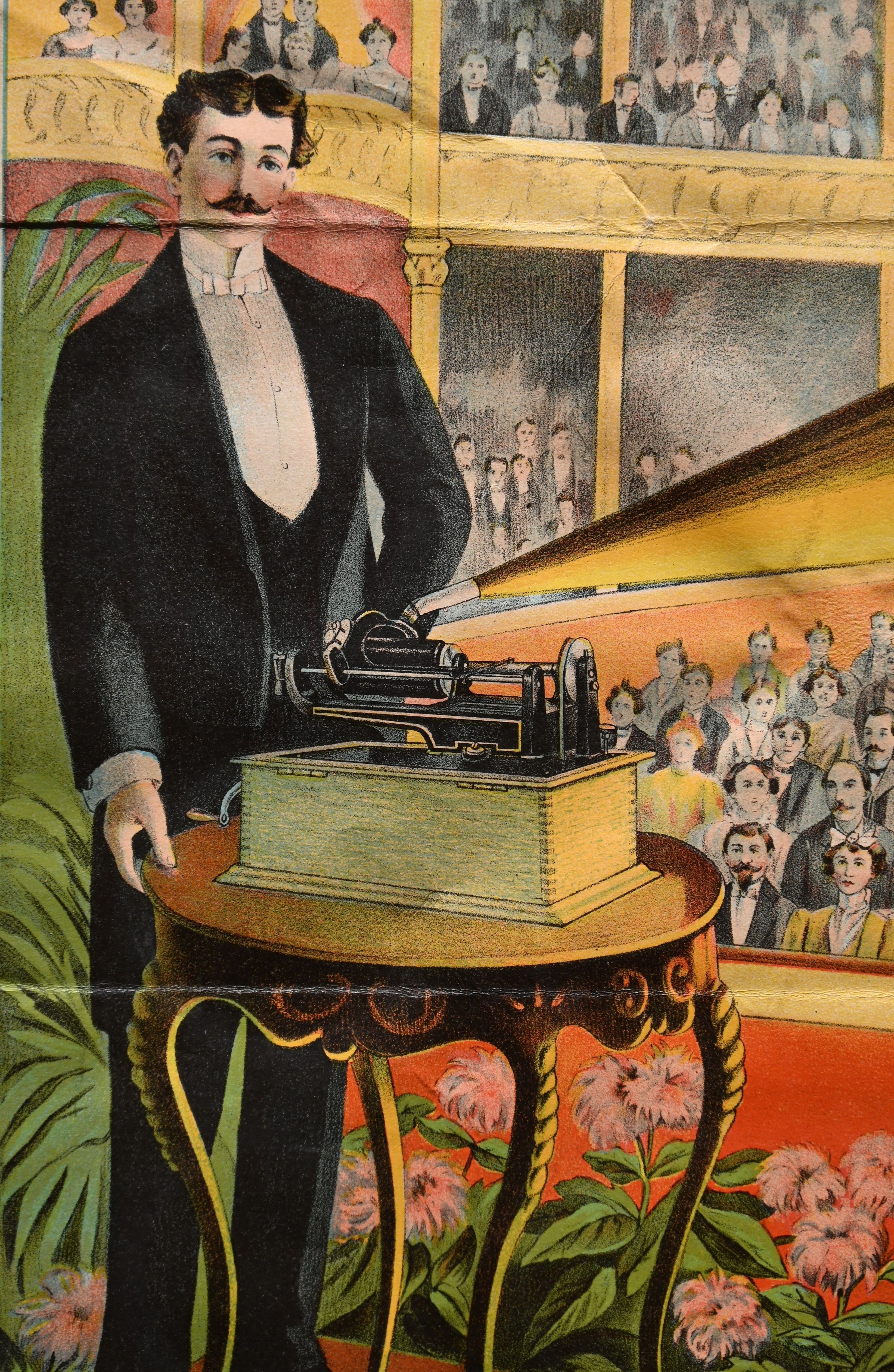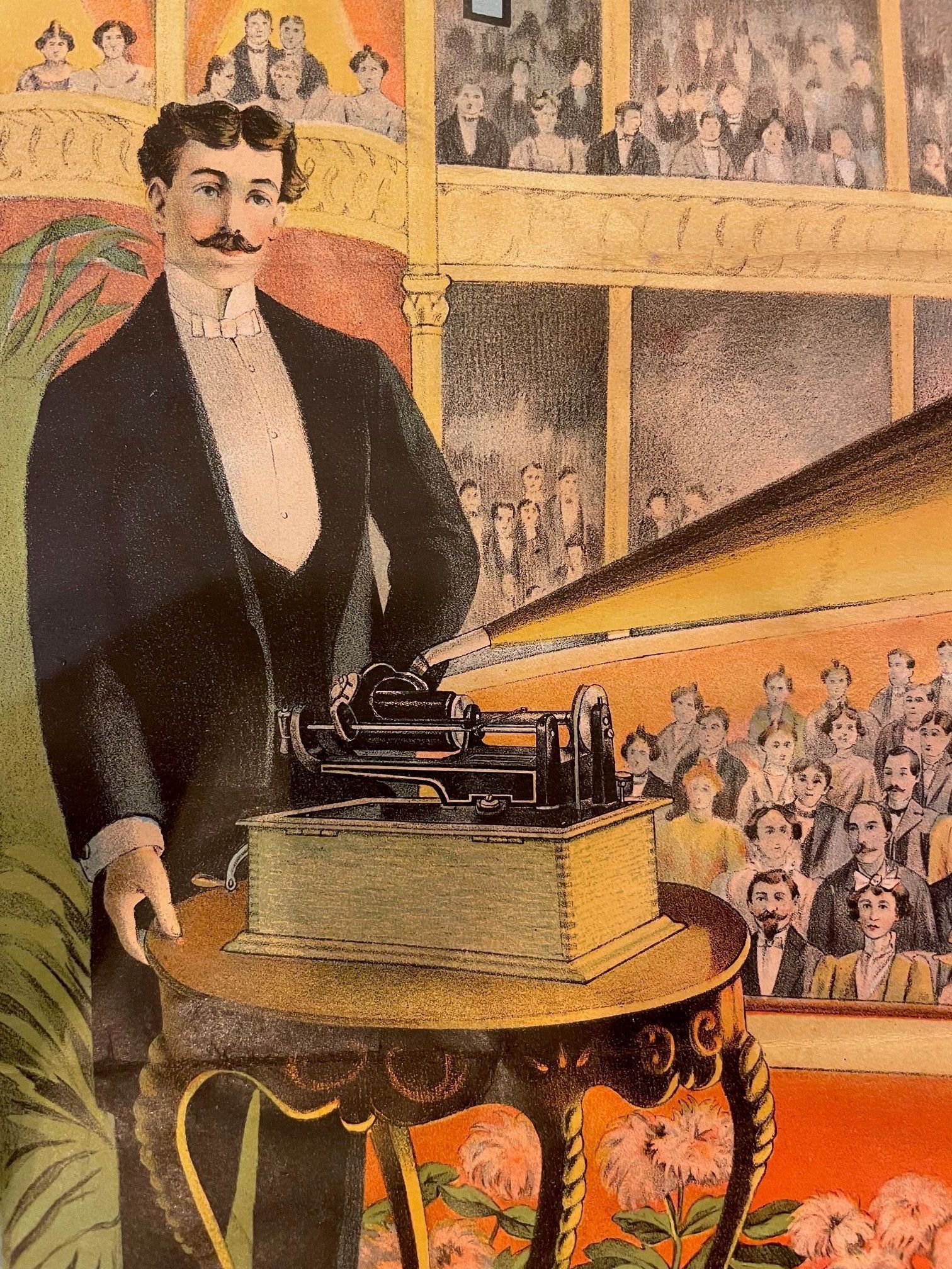 Detailed illustration of stage and audience – a reminder that the phonograph was not only used in private homes but also for public demonstrations and entertainment in halls.