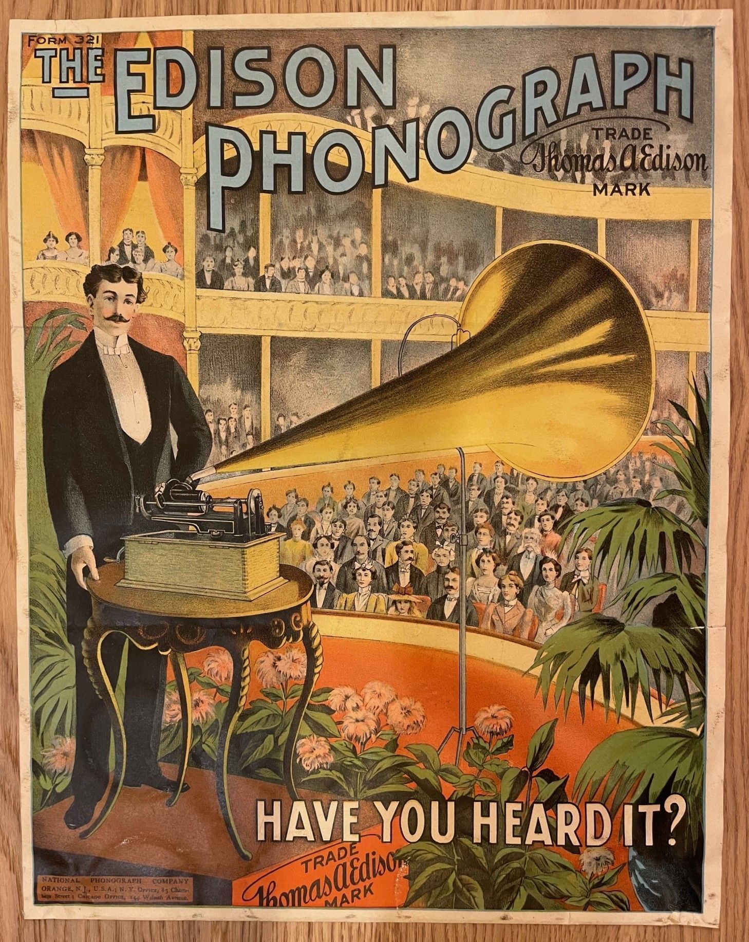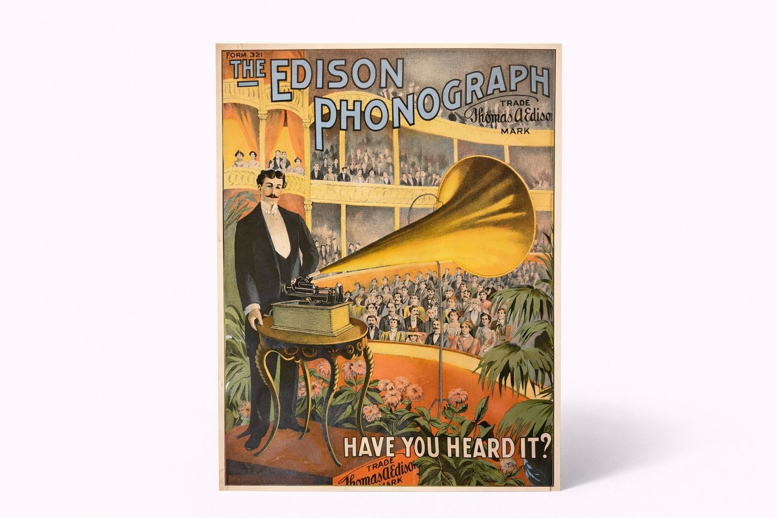 This colorful advertising poster promotes the Edison Home Phonograph – one of the most successful Edison models around 1900. It shows an elegant demonstrator on stage presenting the new invention to a large audience. With the slogan “Have you heard it?” the National Phonograph Company highlighted the sensational new possibility of reproducing music and speech mechanically at any time.