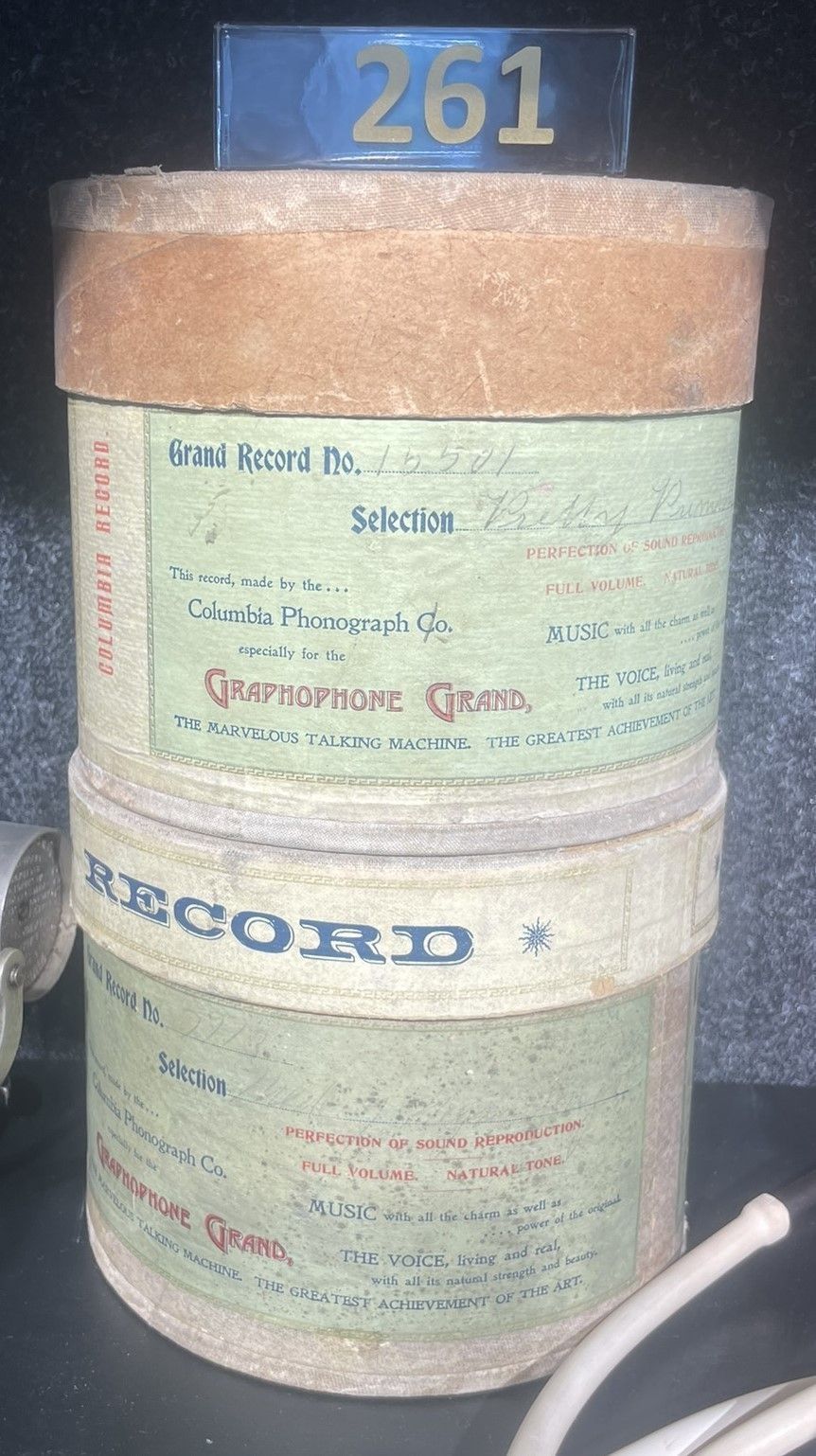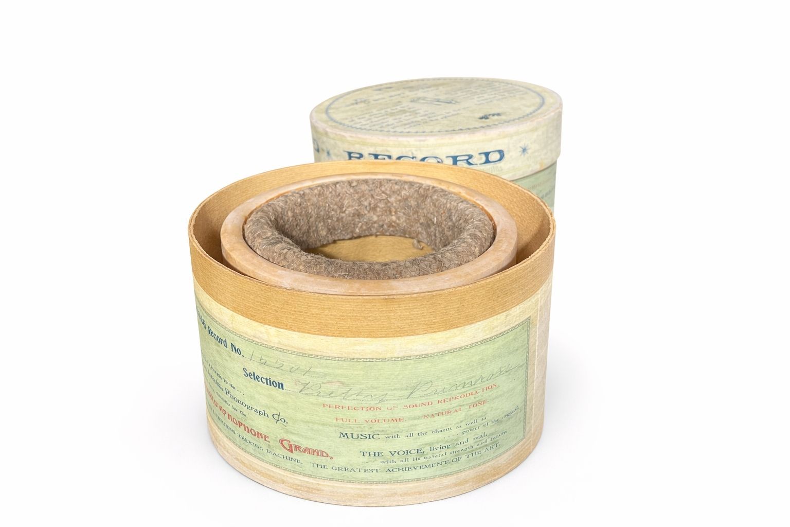 These large-format Grand Records were produced by Columbia especially for the exhibition machines of the Graphophone Grand series. Almost twice the size of ordinary standard cylinders (2-inch diameter), they were designed to provide significantly greater volume and extended playing time.