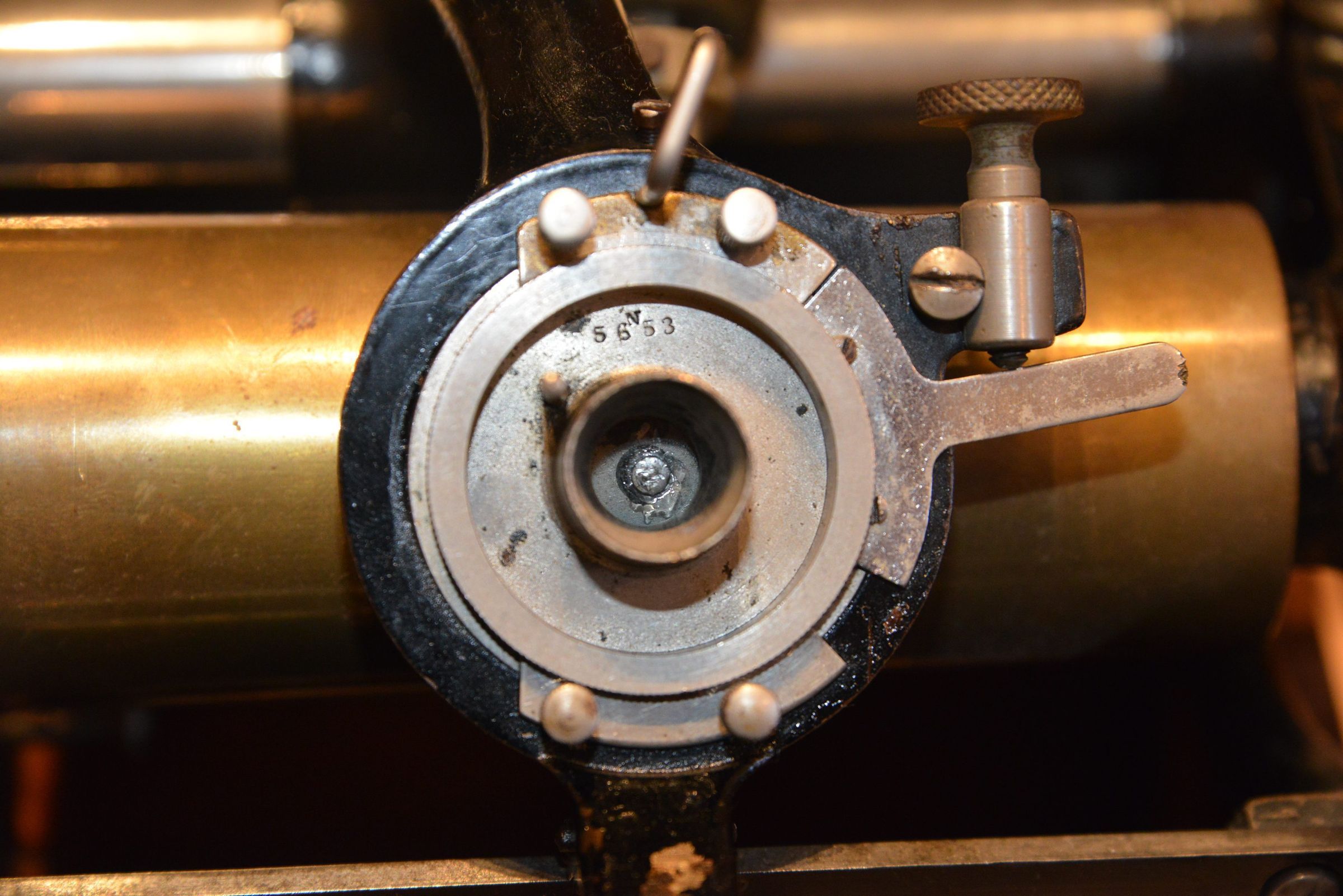 The motor powered the rotating cylinder, while a vertically mounted governor—distinctively placed on top of the bedplate—regulated speed. This unusual but highly visible configuration allowed for precise speed control and is a key identifying feature of the Class M.
