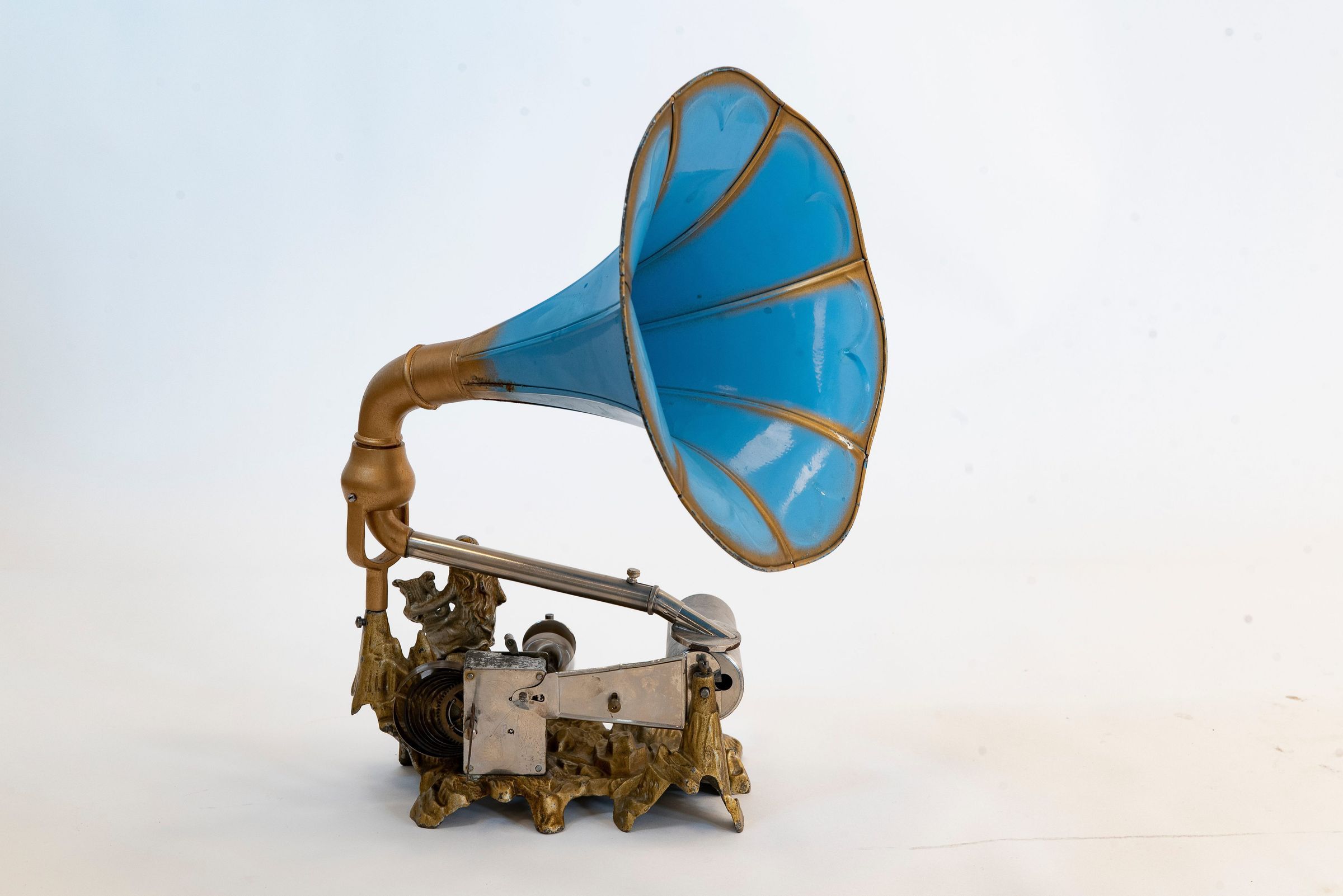 The Edisonium houses a particularly well-preserved example with a colorfully enameled horn and complete working mechanism – a fine representative of Berlin’s casting and design craftsmanship from the golden age of phonograph art.