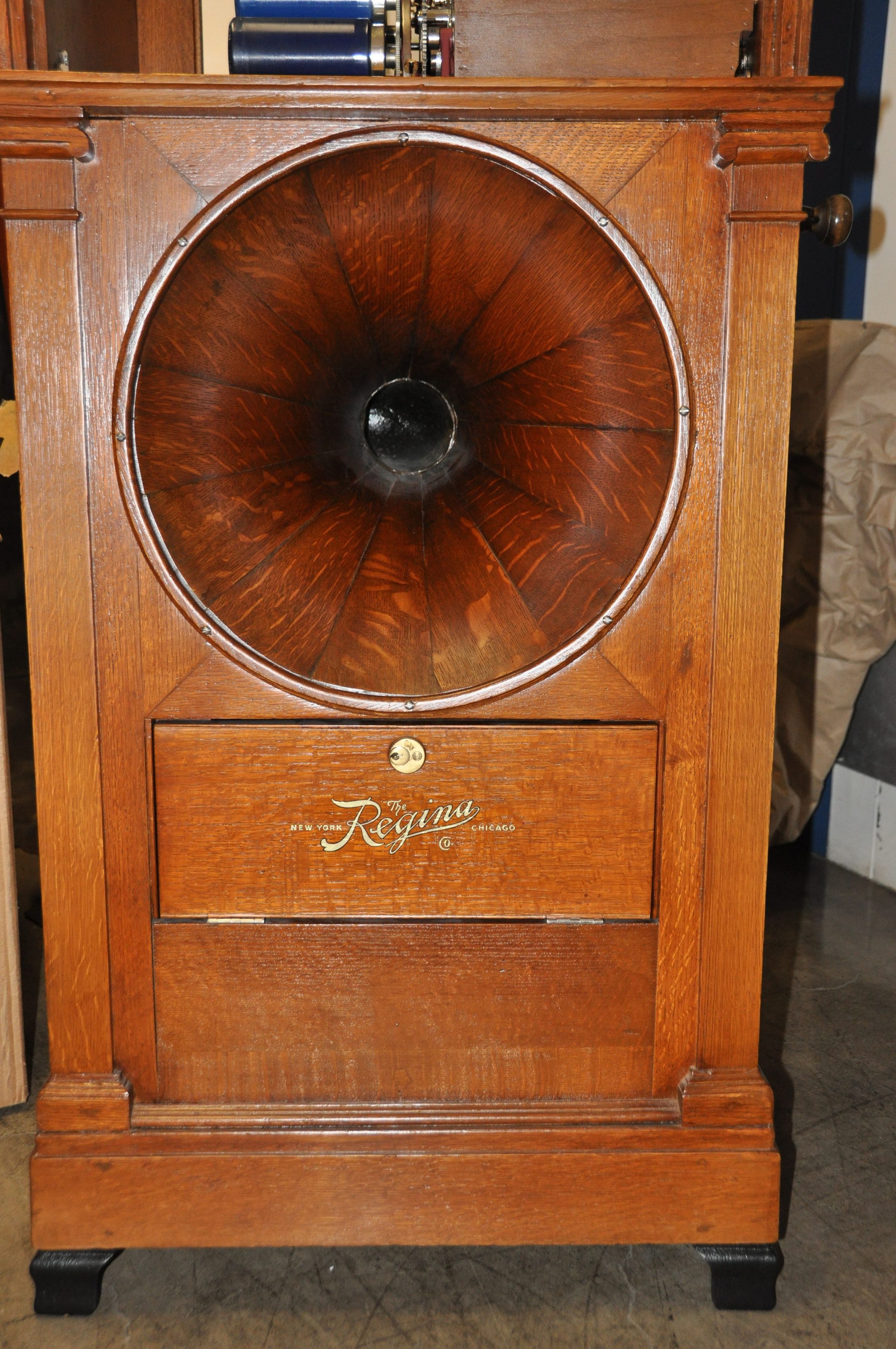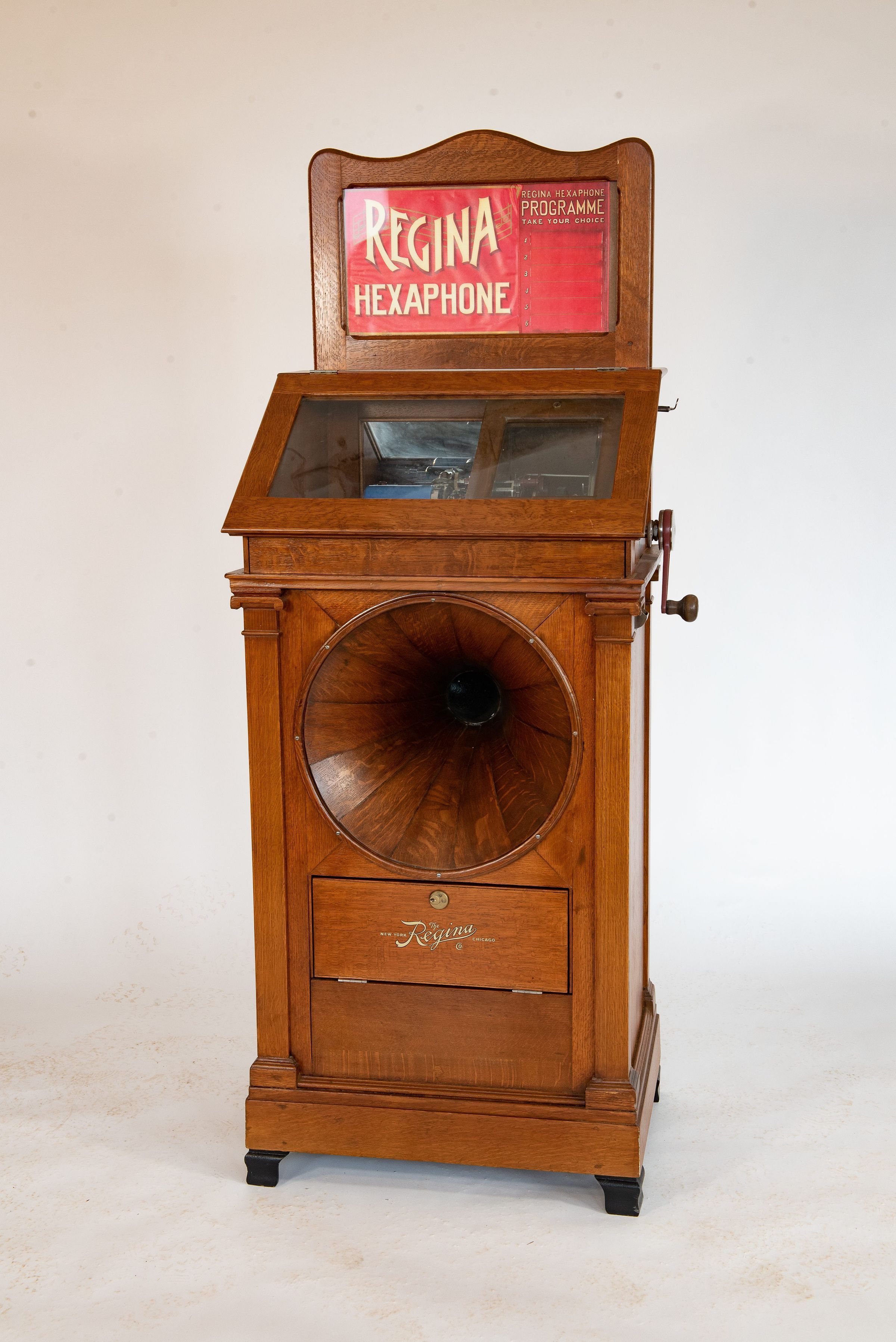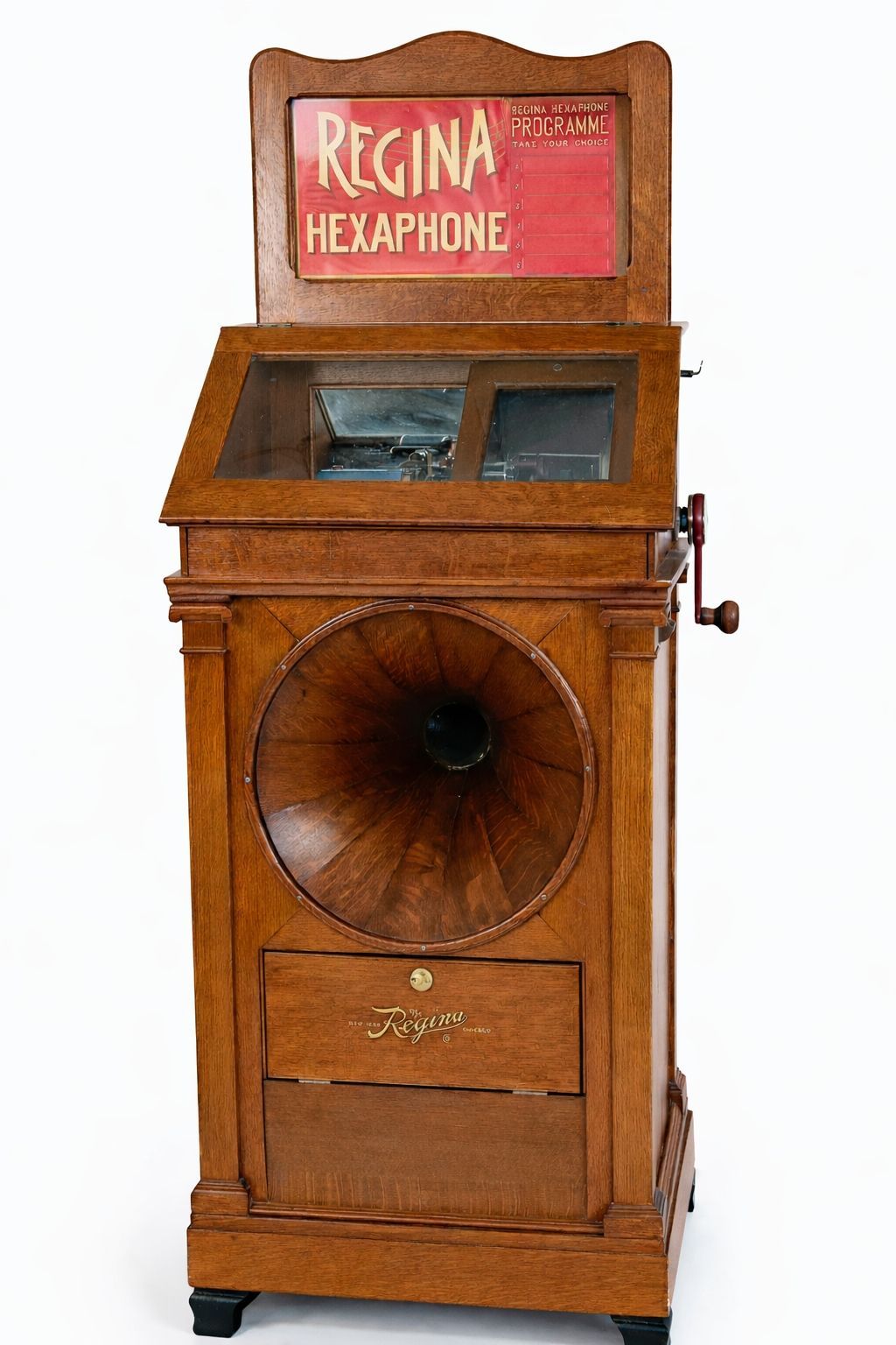 The Regina Hexaphone was a successful, rugged, and field‑proven coin‑operated phonograph that served as an early form of the jukebox. The Regina Company, originally renowned for high‑quality disc music boxes, began producing coin‑operated cylinder machines around 1907. By 1914, the Hexaphone could hold up to six Edison “Blue Amberol” cylinders, which the user could select after inserting a coin.