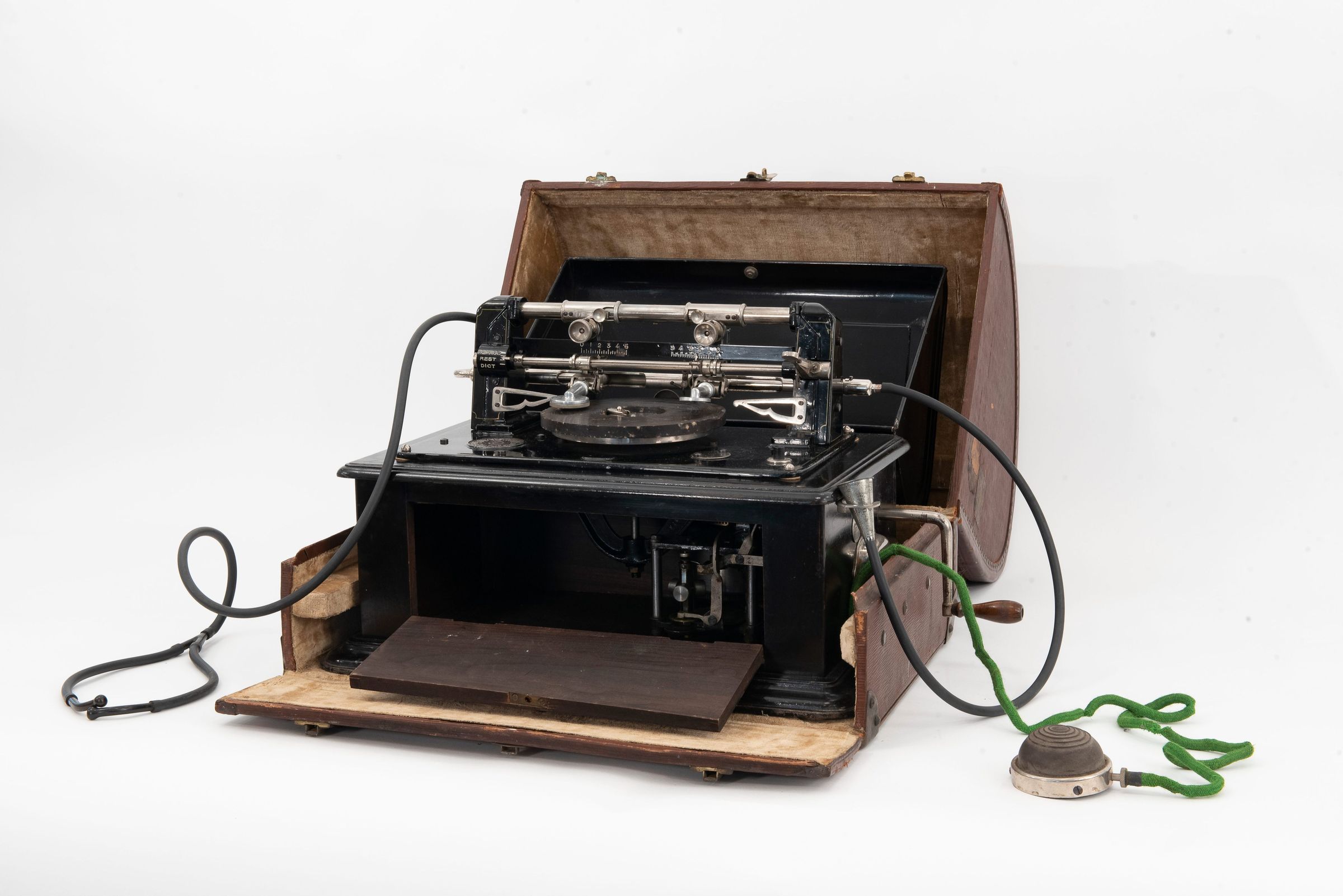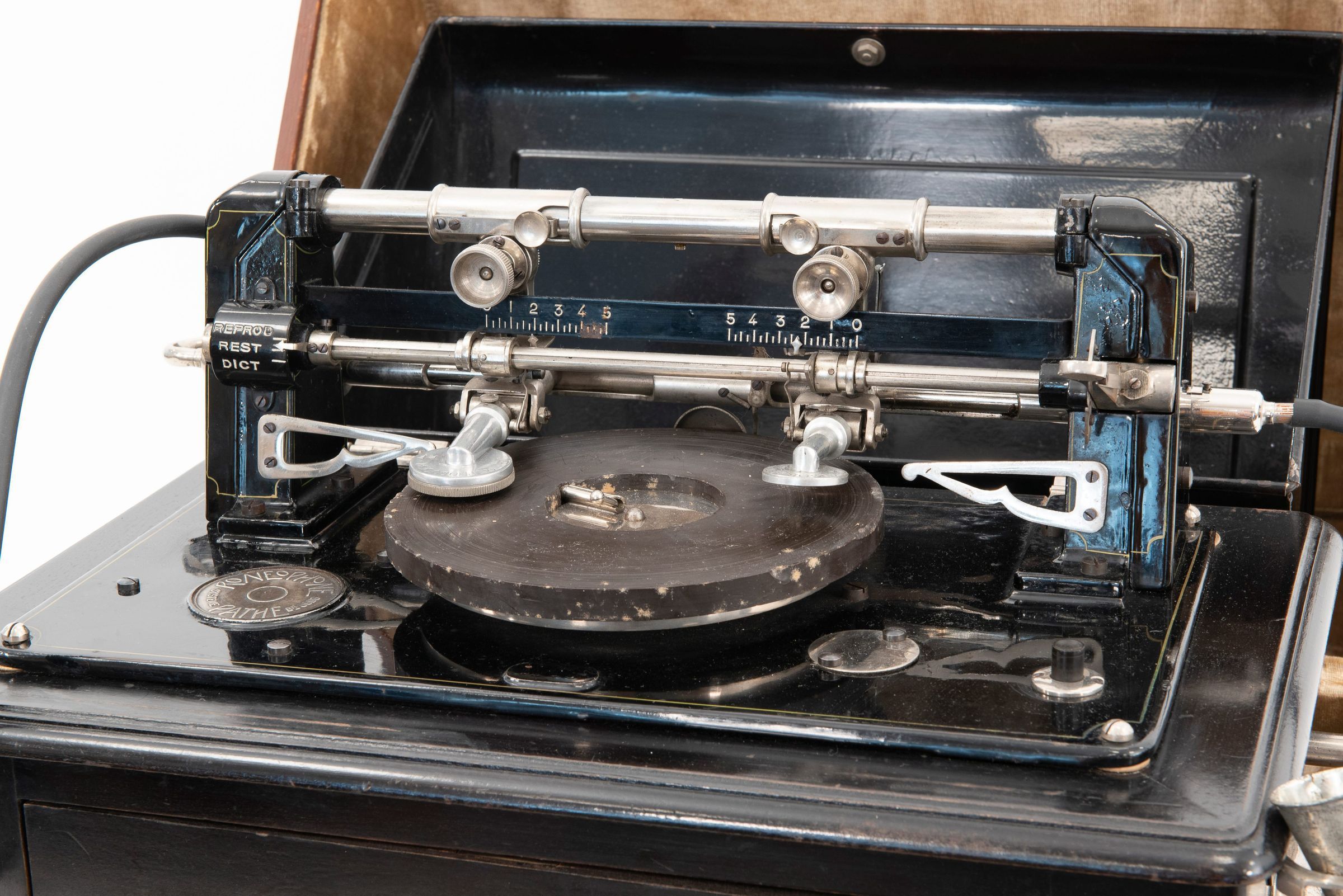 A rare French office dictation machine in a metal housing, here preserved complete with its original carrying case and foot control.
