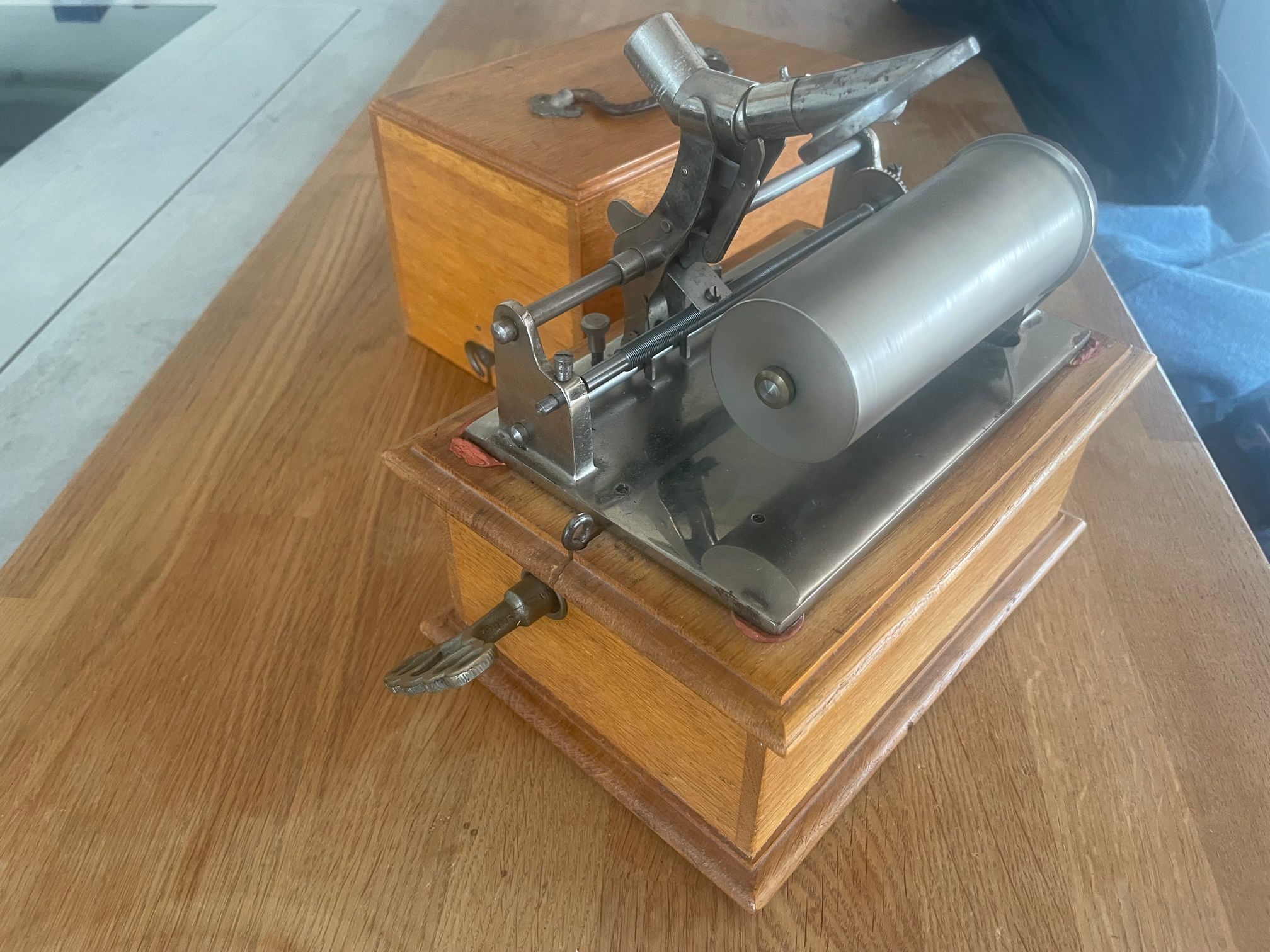 The Model 1900/1 shown here represents the upgraded version of the original “Ideal.” The most notable change was the wooden motor housing, which protected the spring motor, reduced operating noise, and gave the machine a more elegant, furniture-like appearance.