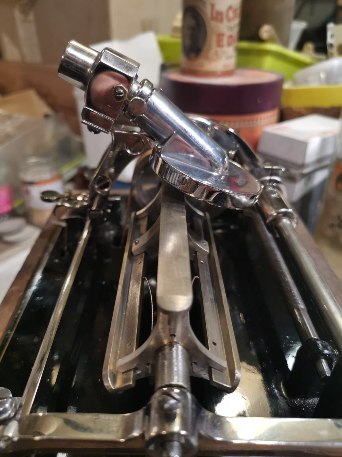 As was typical for early Excelsior machines, the cylinder holder is not constructed as a closed mandrel. Instead, a patent-circumventing design was employed that allowed the playback of wax cylinders without directly infringing Edison’s protected constructions. This technical solution is characteristic of the earliest phase of German phonograph development.