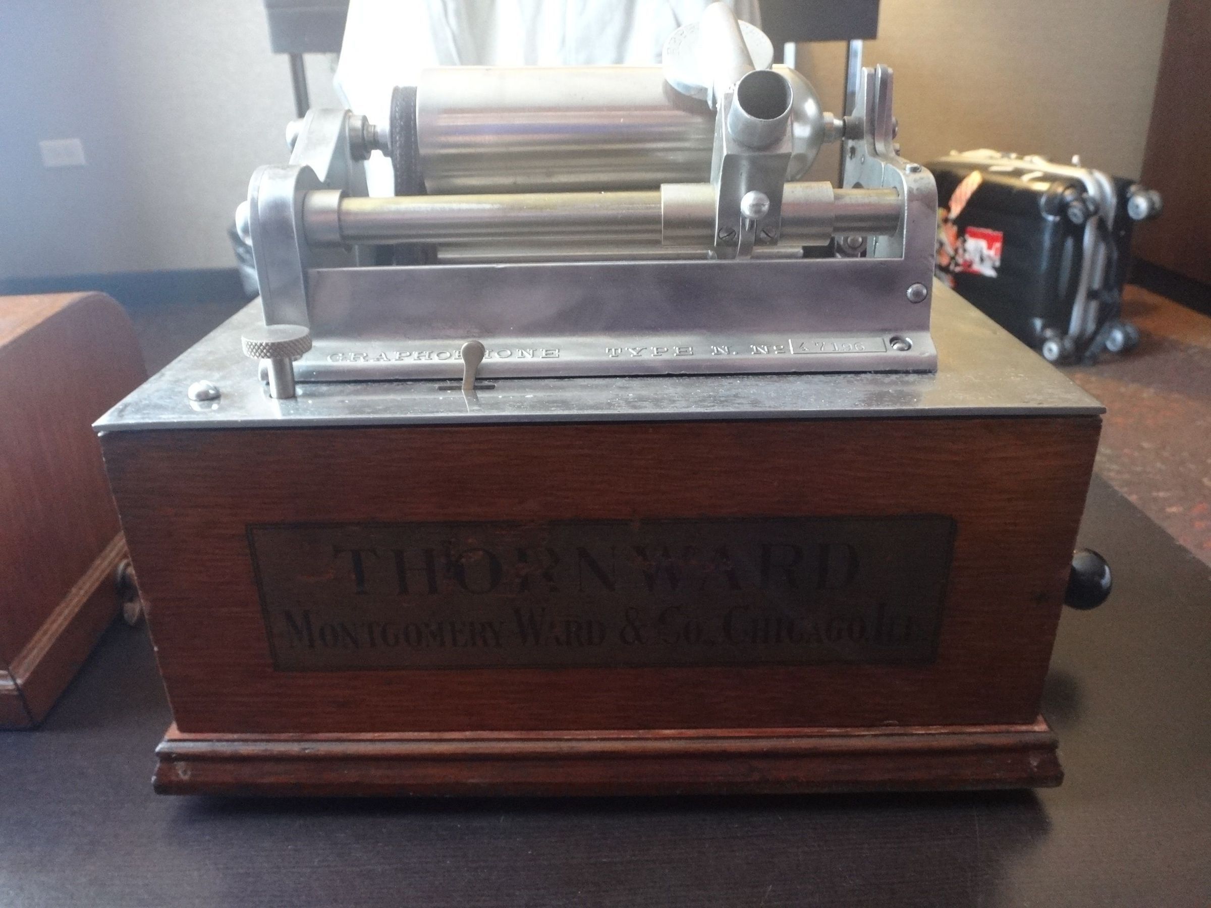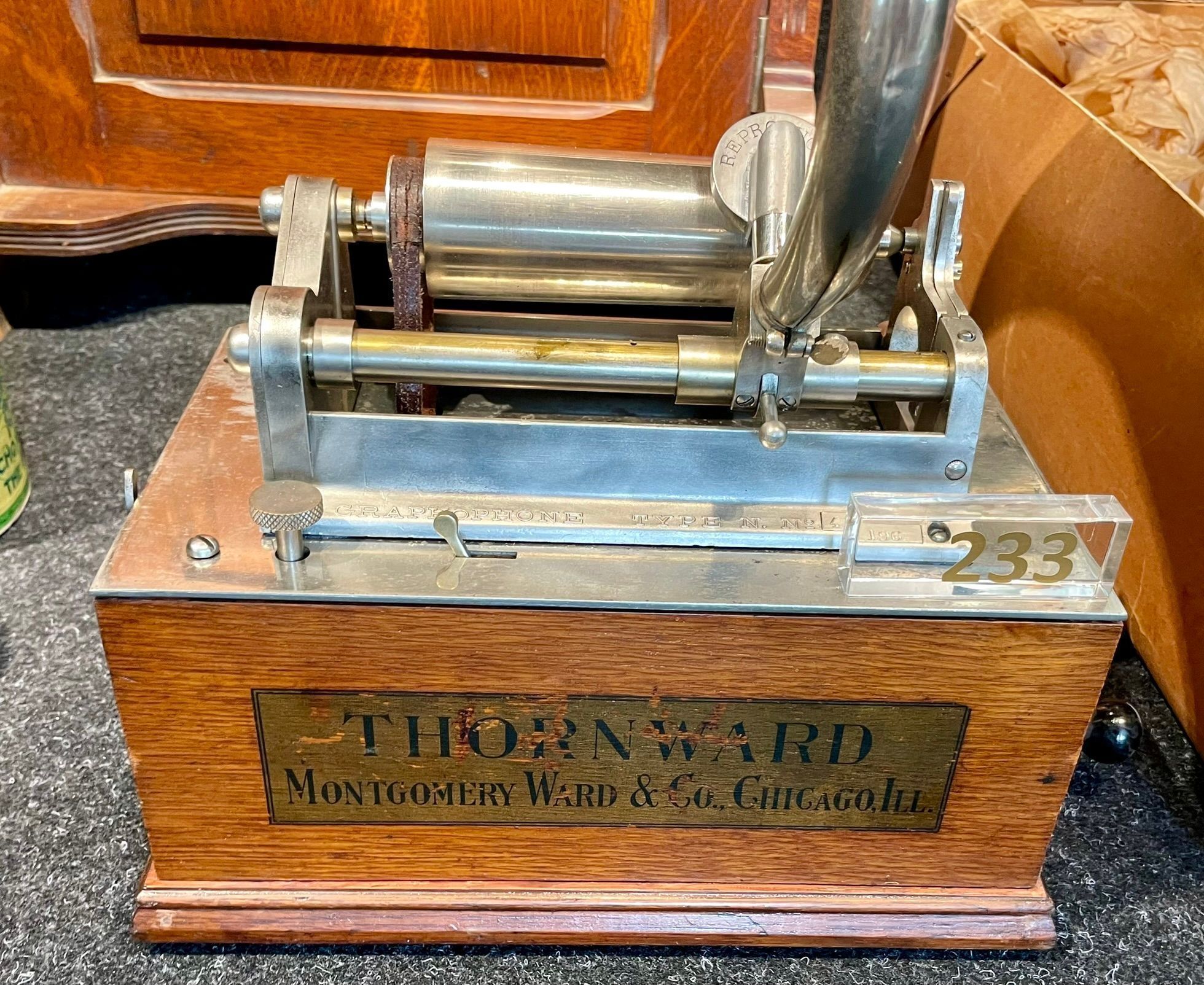 Like its competitor Sears, Montgomery Ward had an arrangement to sell Columbia Graphophones through its mail order catalogue. Thornward was Ward's house brand -- a man named Thorn had been a business partner of Montgomery Ward. This Thornward is a regular Graphophone Type N in all but with a different -- the bullet shaped mandrel reveals it to be a Columbia N, which was introduced ca. 1895.