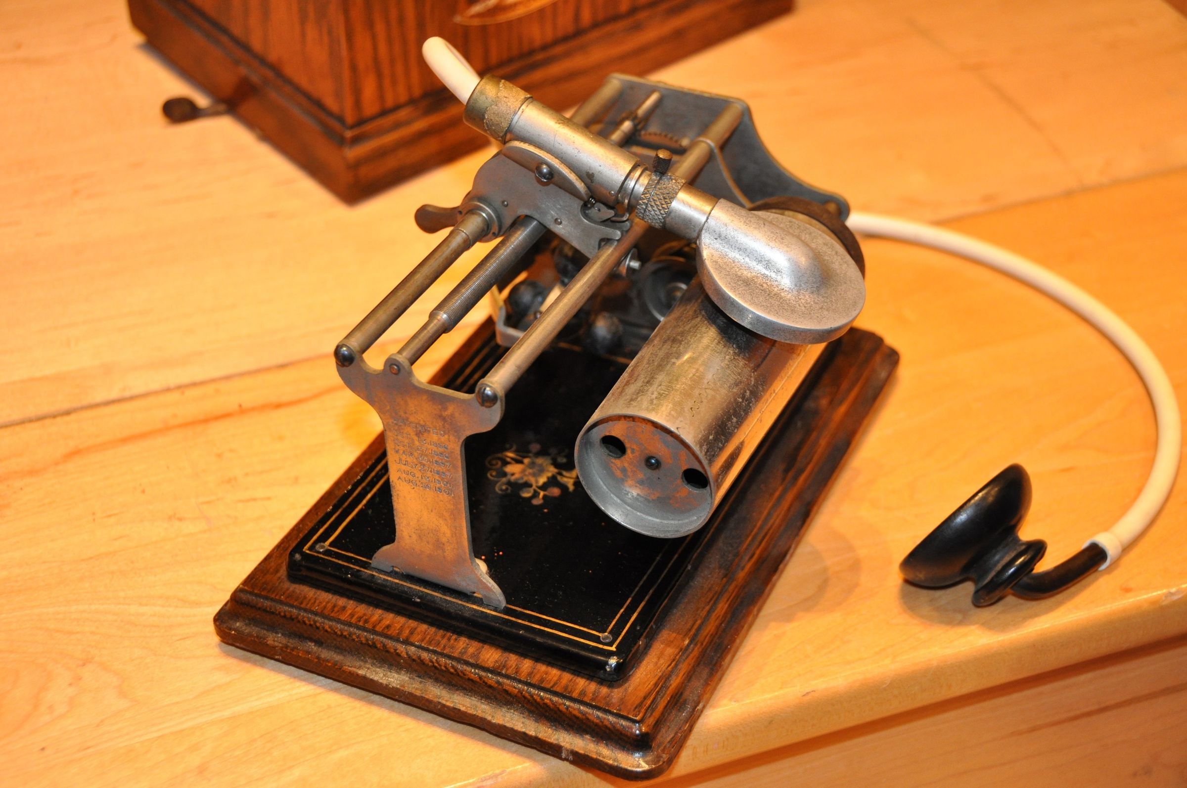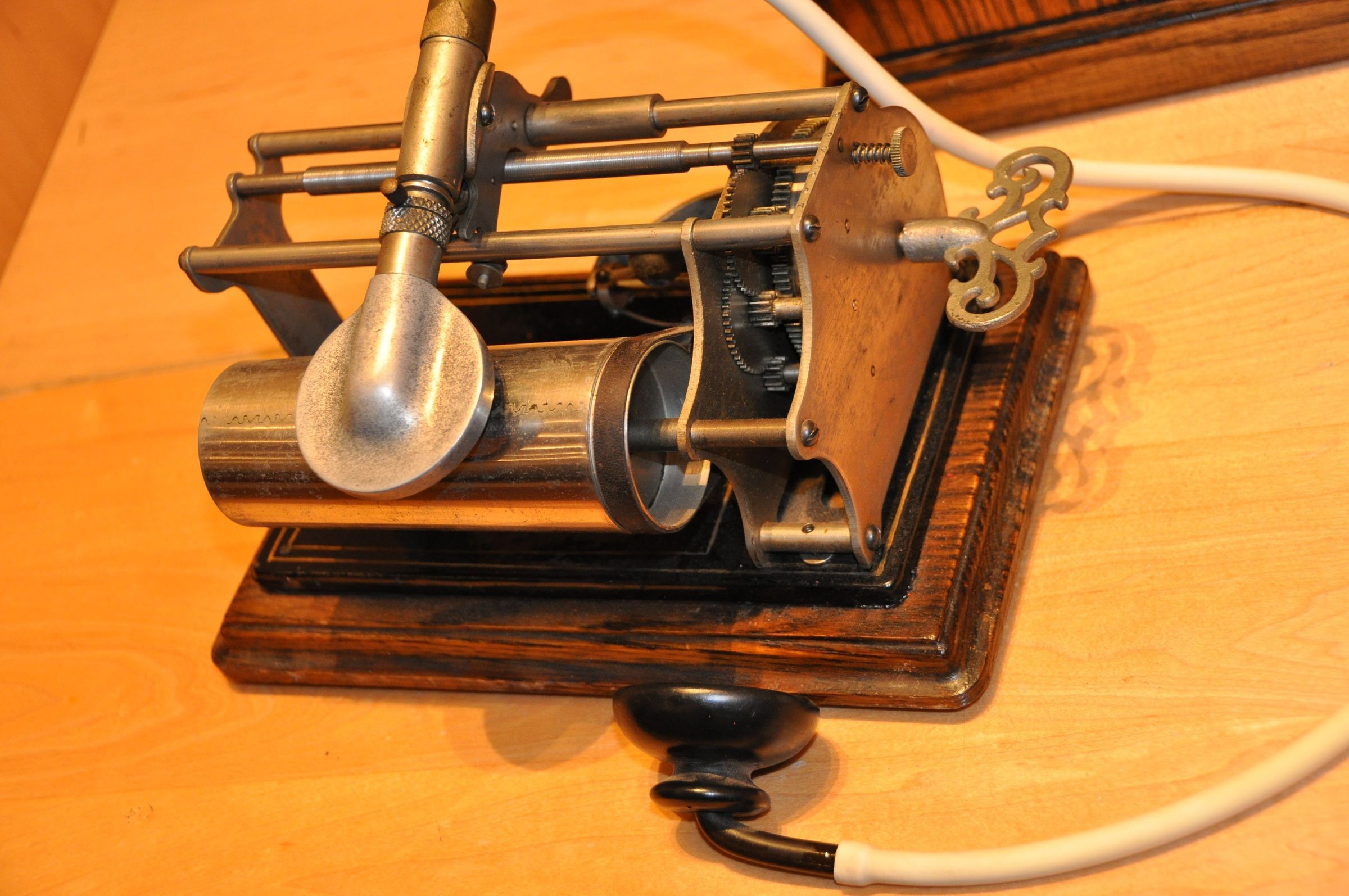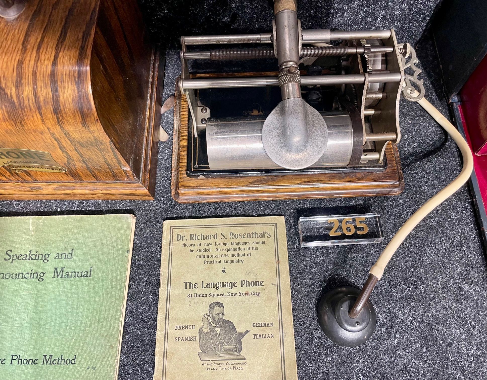 This rare language teaching device combines early sound recording technology with modern language education. It was developed by Dr. Richard S. Rosenthal, who, under the name "Language Phone", introduced one of the world's first commercial uses of the phonograph in the field of education.