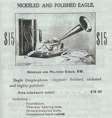 Its name derived from the American 10-dollar gold coin, commonly called an “Eagle.” Alongside Edison’s “Gem” (7.50 dollars), this model marked a turning point: phonographs were no longer exclusive luxury goods, but mass-market products.
