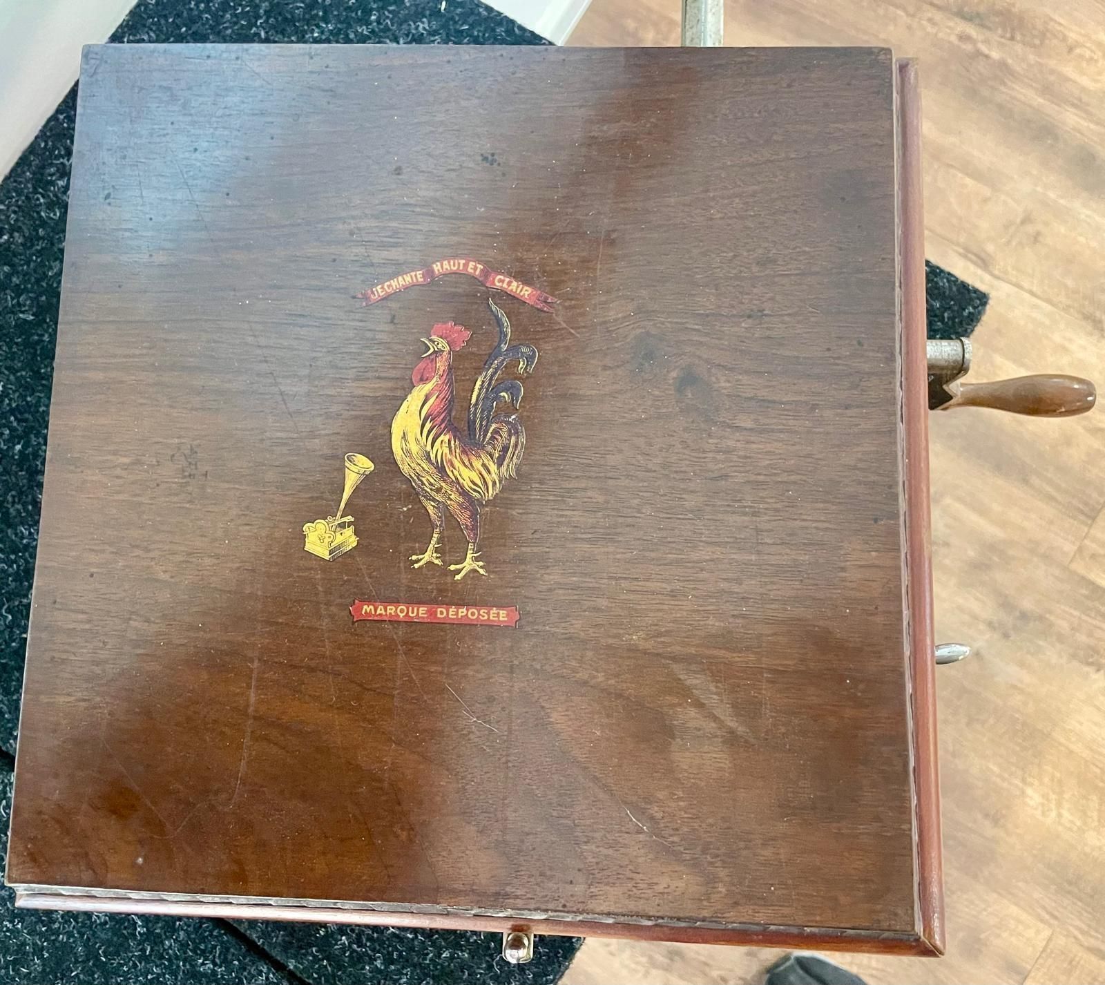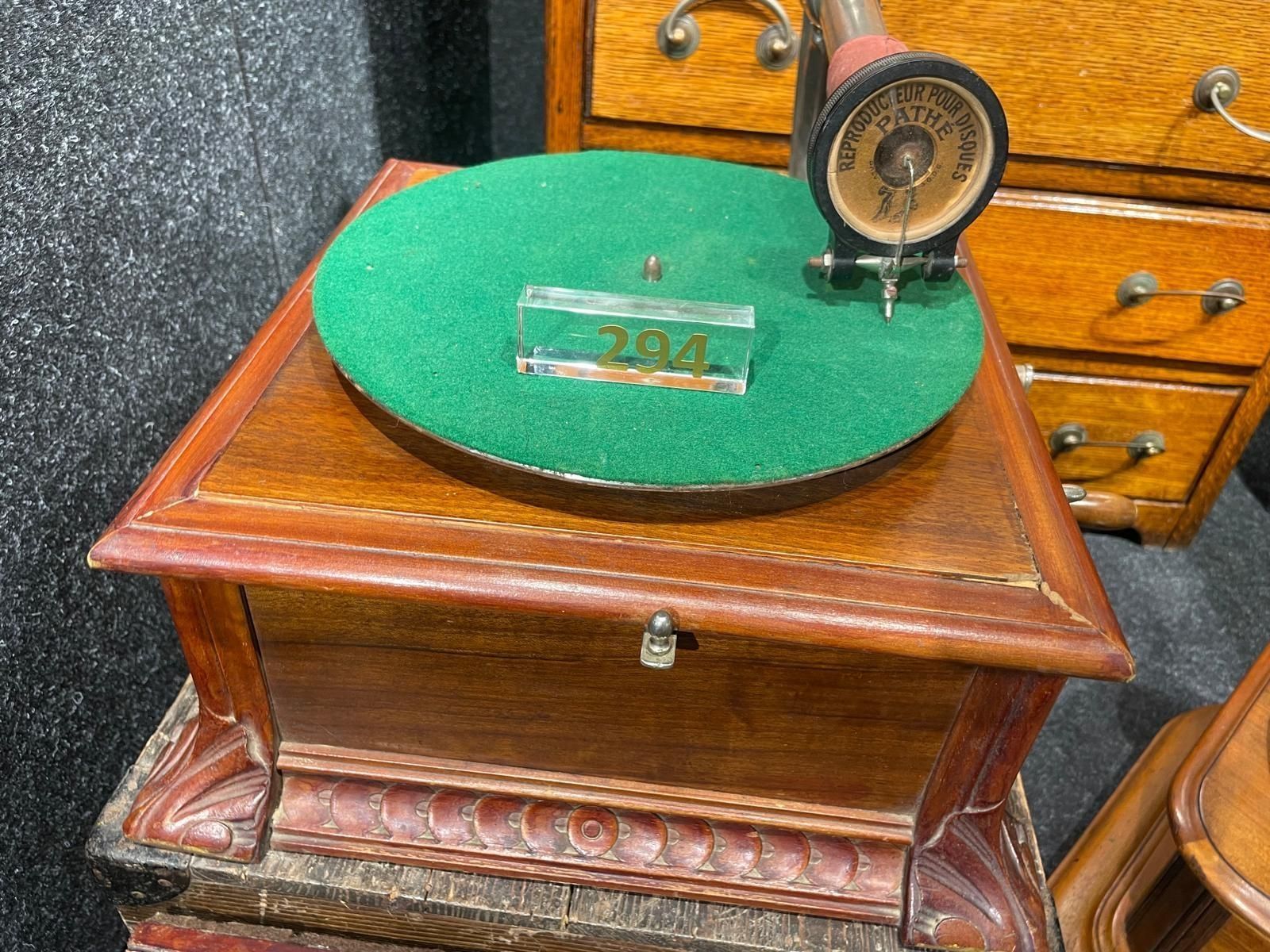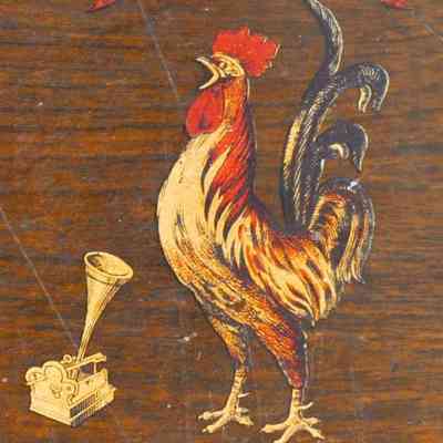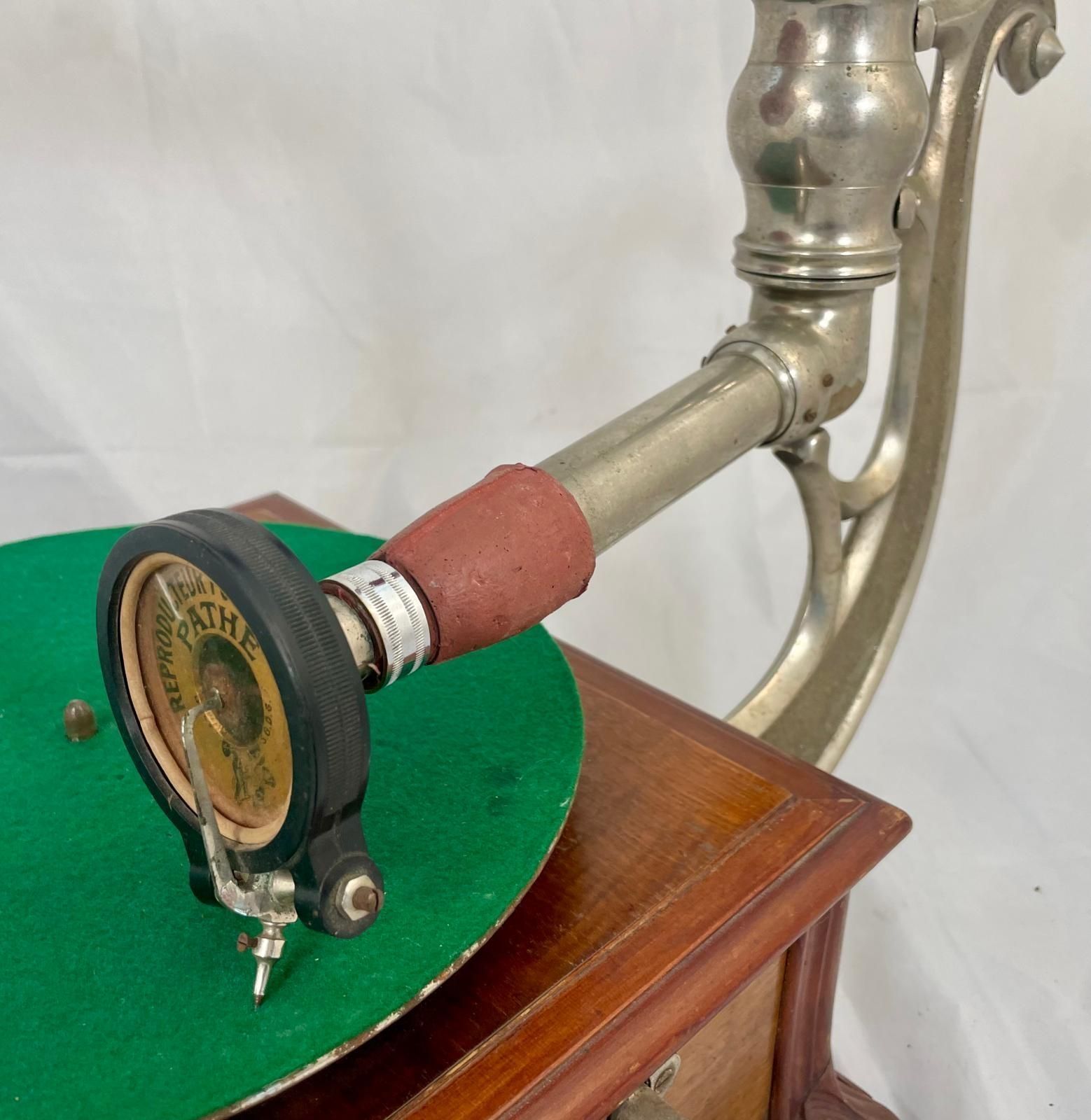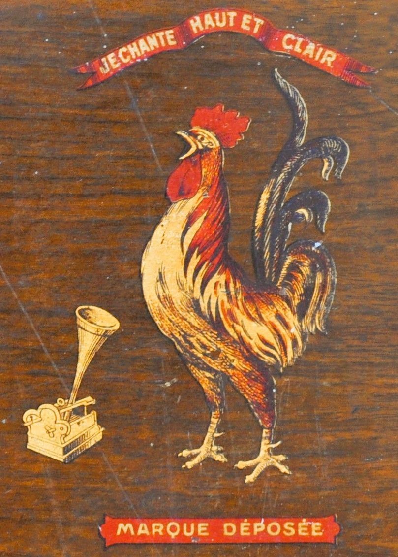 Cabinet: Solid wood construction with decorative front panel and partially carved base. The lid displays the famous Pathé rooster logo, with the slogan "Je chante haut et clair" ("I sing loud and clear").