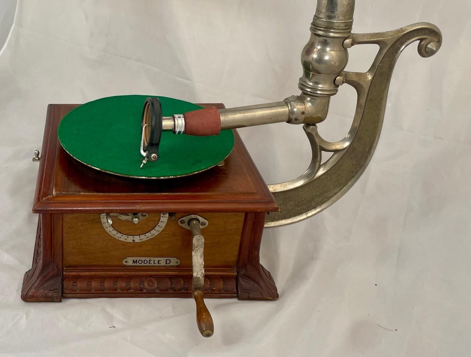 Phonographs of this type were advertised widely in France and abroad – often sold as complete kits, including accessory sets like the original compartmentalized transport box seen here (for horn, tonearm, reproducer, etc.).