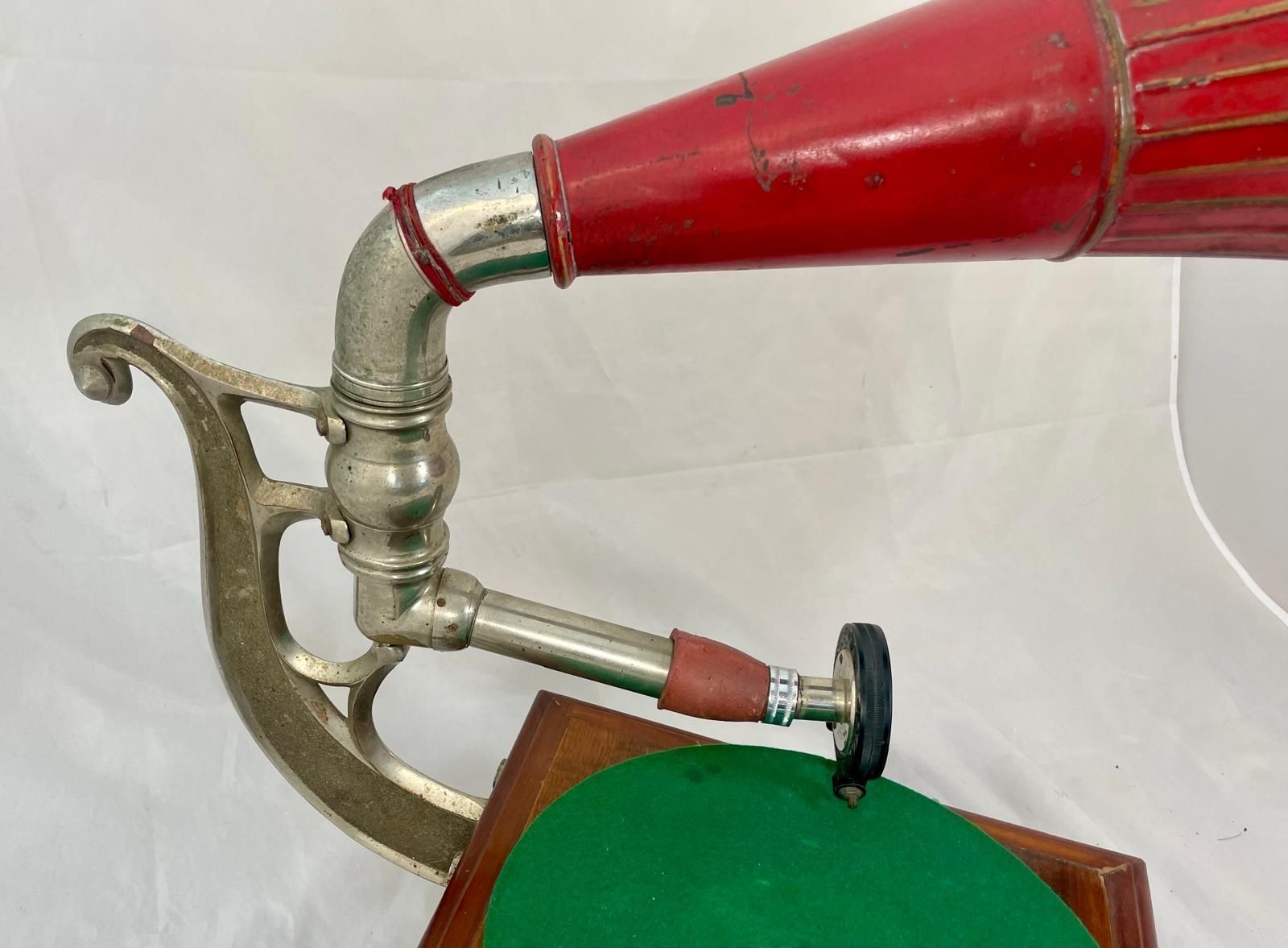Horn and tonearm: The large red-lacquered metal horn is guided by a cast-iron support arm – a signature feature of early French disc phonographs.