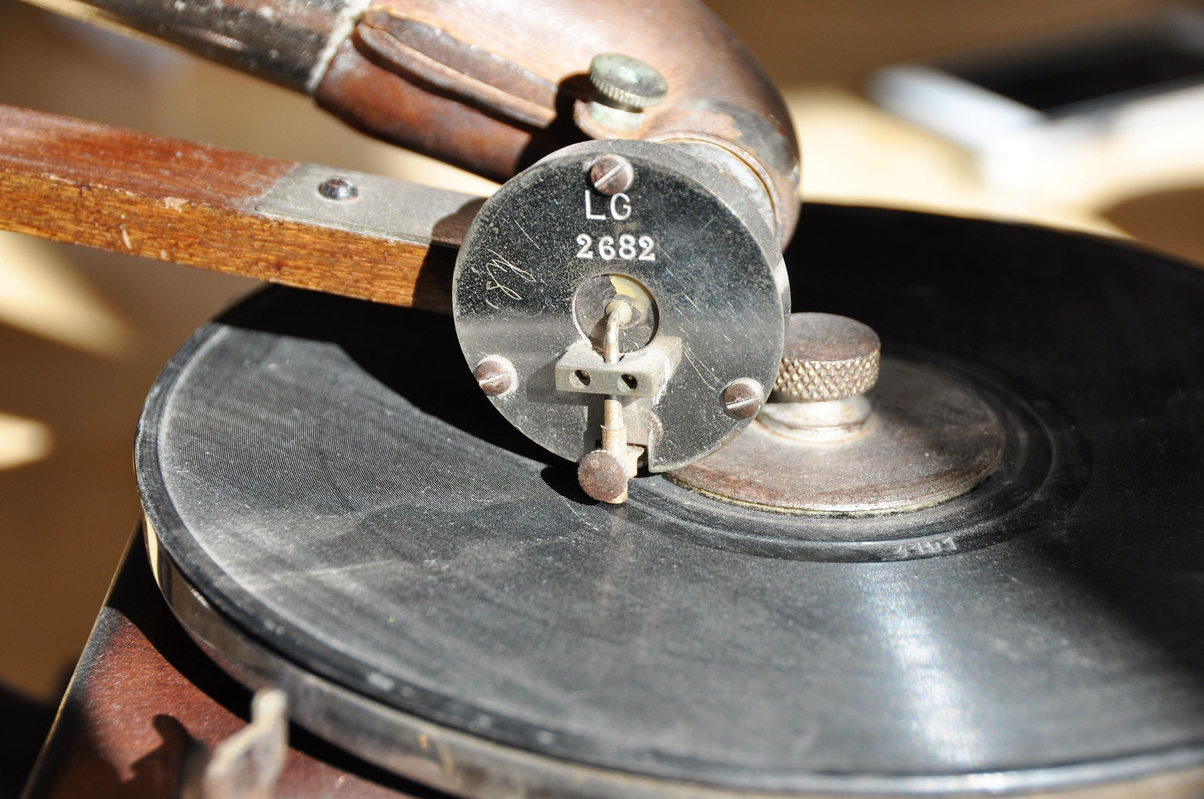 This machine is a classic side‑horn gramophone for disc records, featuring: