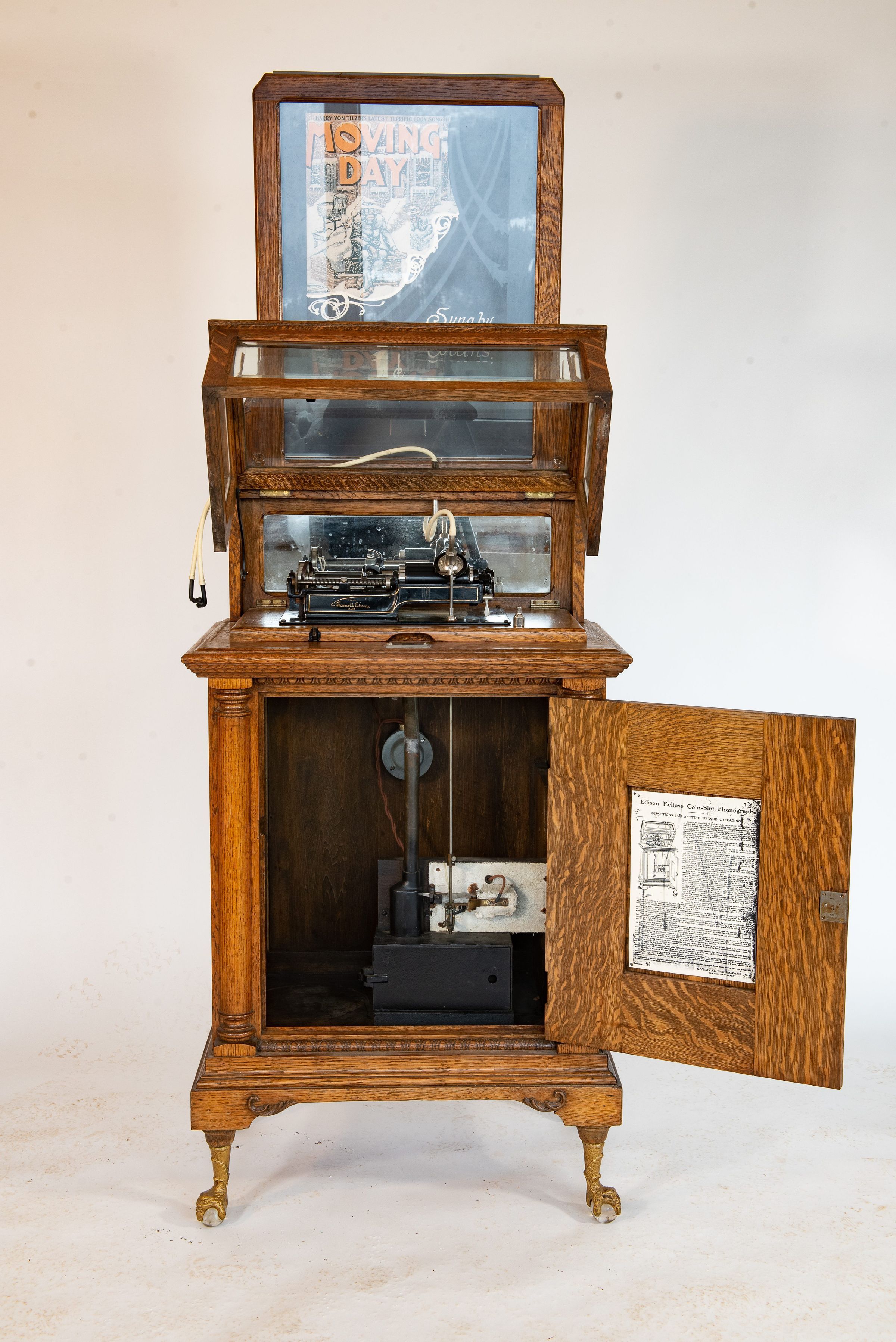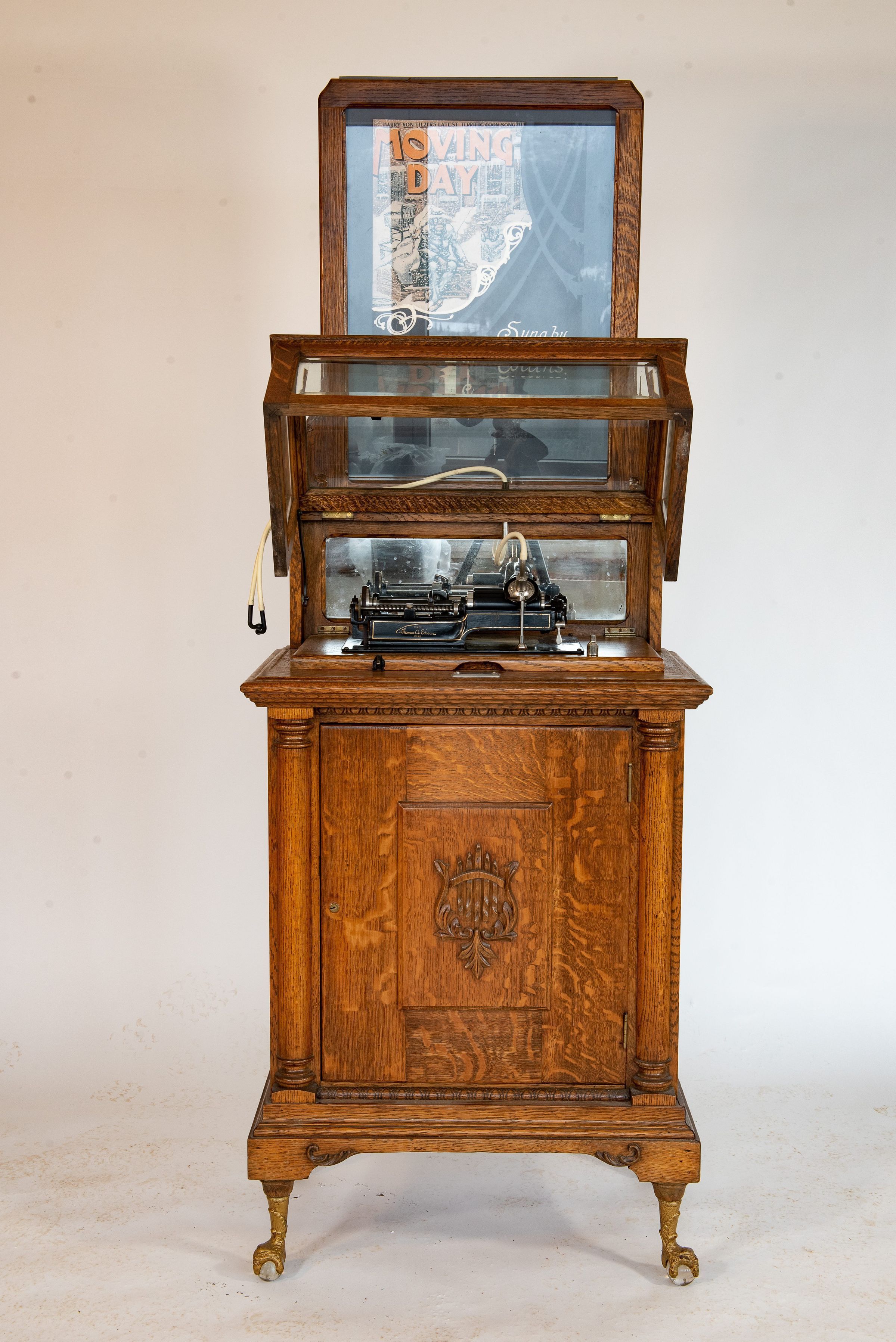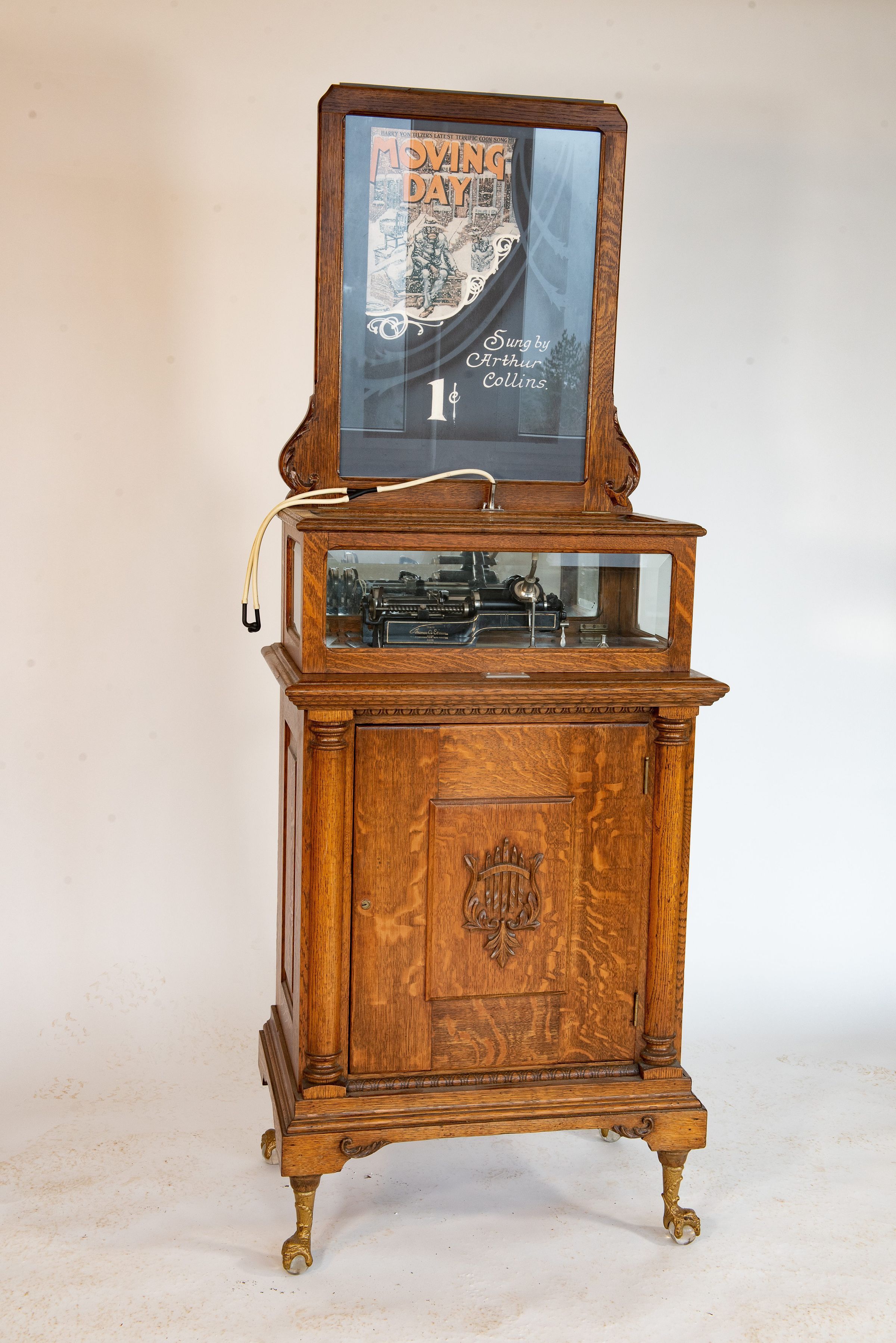 The decorative cabinet was typically made of solid oak and stood on claw-and-glass-ball feet. A color lithograph marquee above the horn often displayed the title of the currently featured cylinder, such as “Cuddle Up a Little Closer” or “Whistling Rufus”. Large glass windows on the front offered passersby a clear view of the moving mechanism, enhancing the visual and mechanical appeal of the performance.