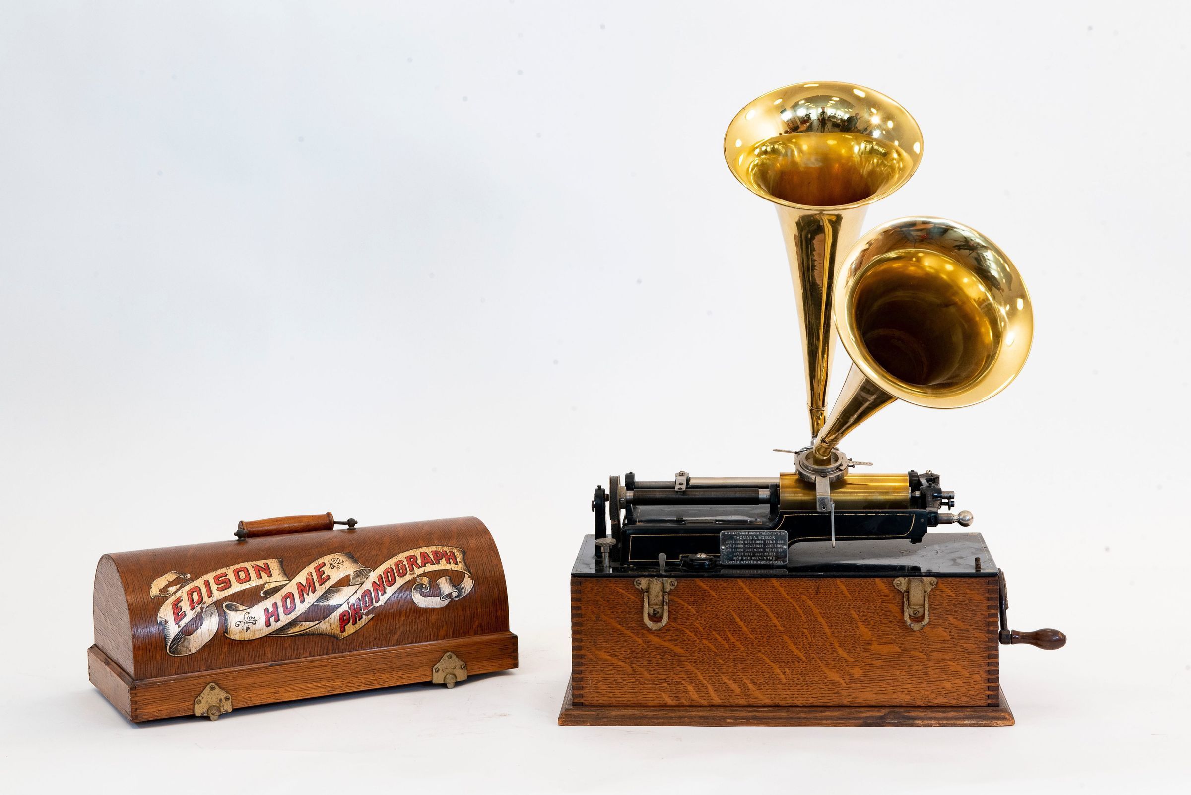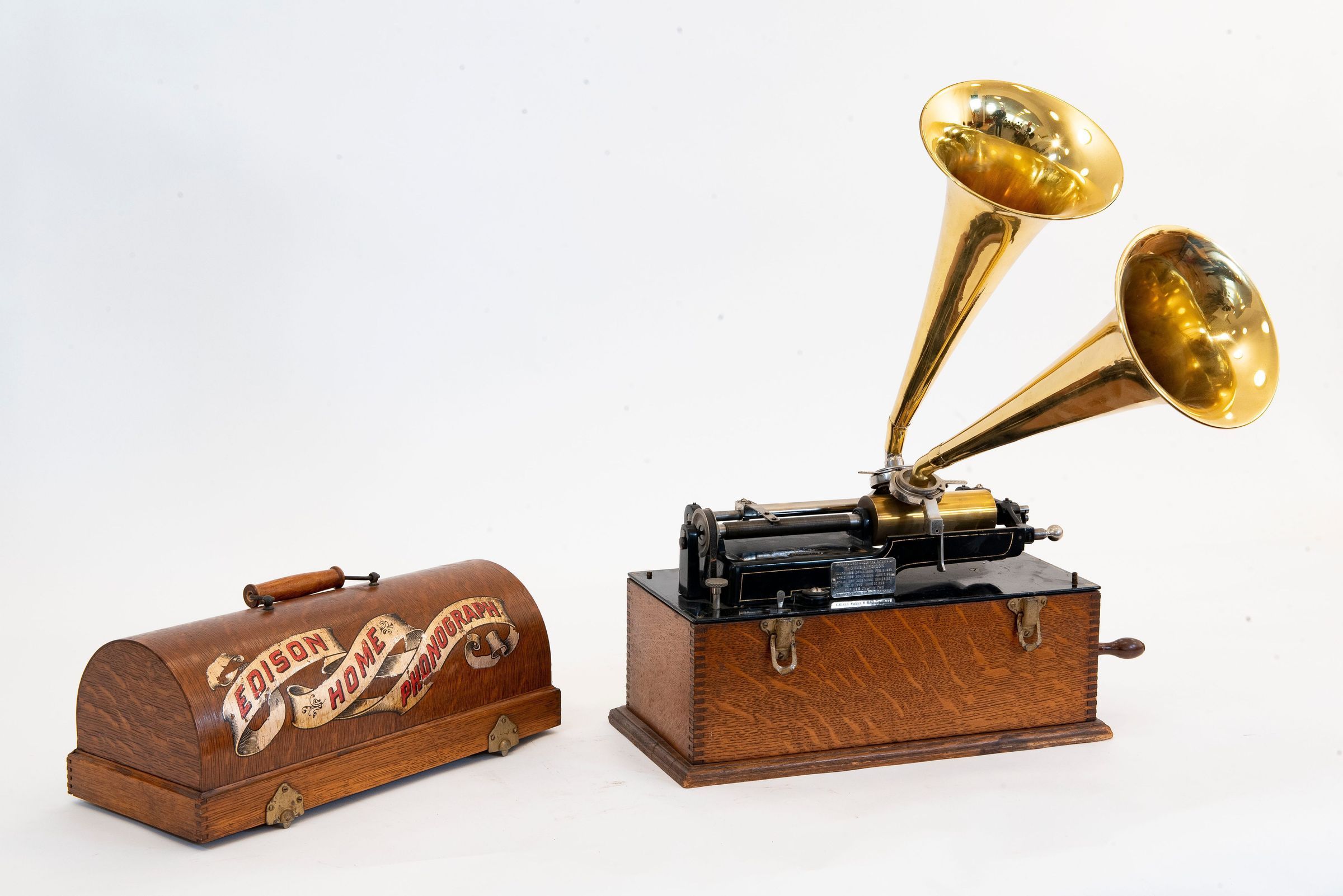 This rare phonograph system combines an Edison "Suitcase"-style Home model with the legendary Polyphone attachment, invented around 1898 by Leon F. Douglass. The goal was to achieve increased volume when playing brown wax cylinders by using two sound reproducers simultaneously.