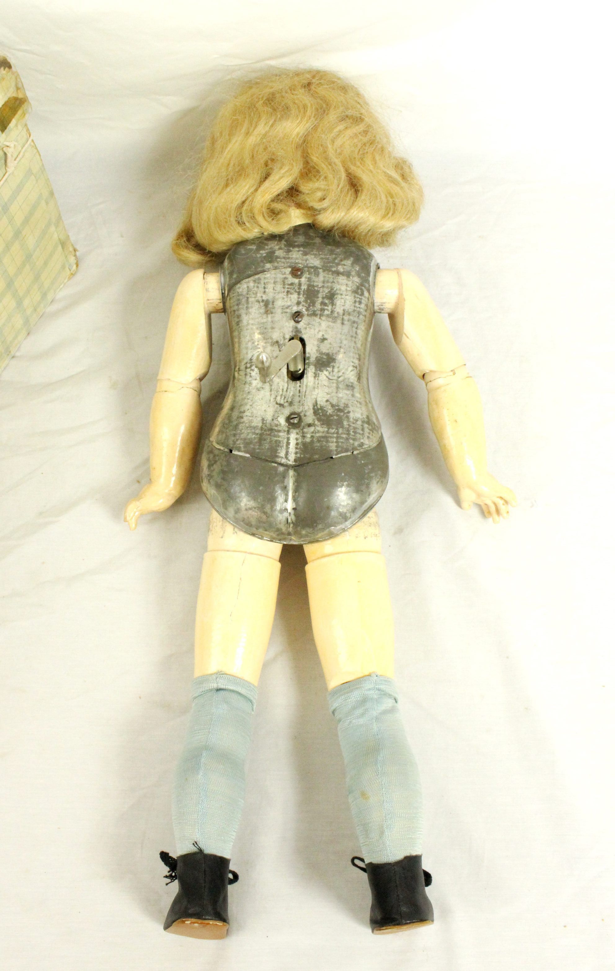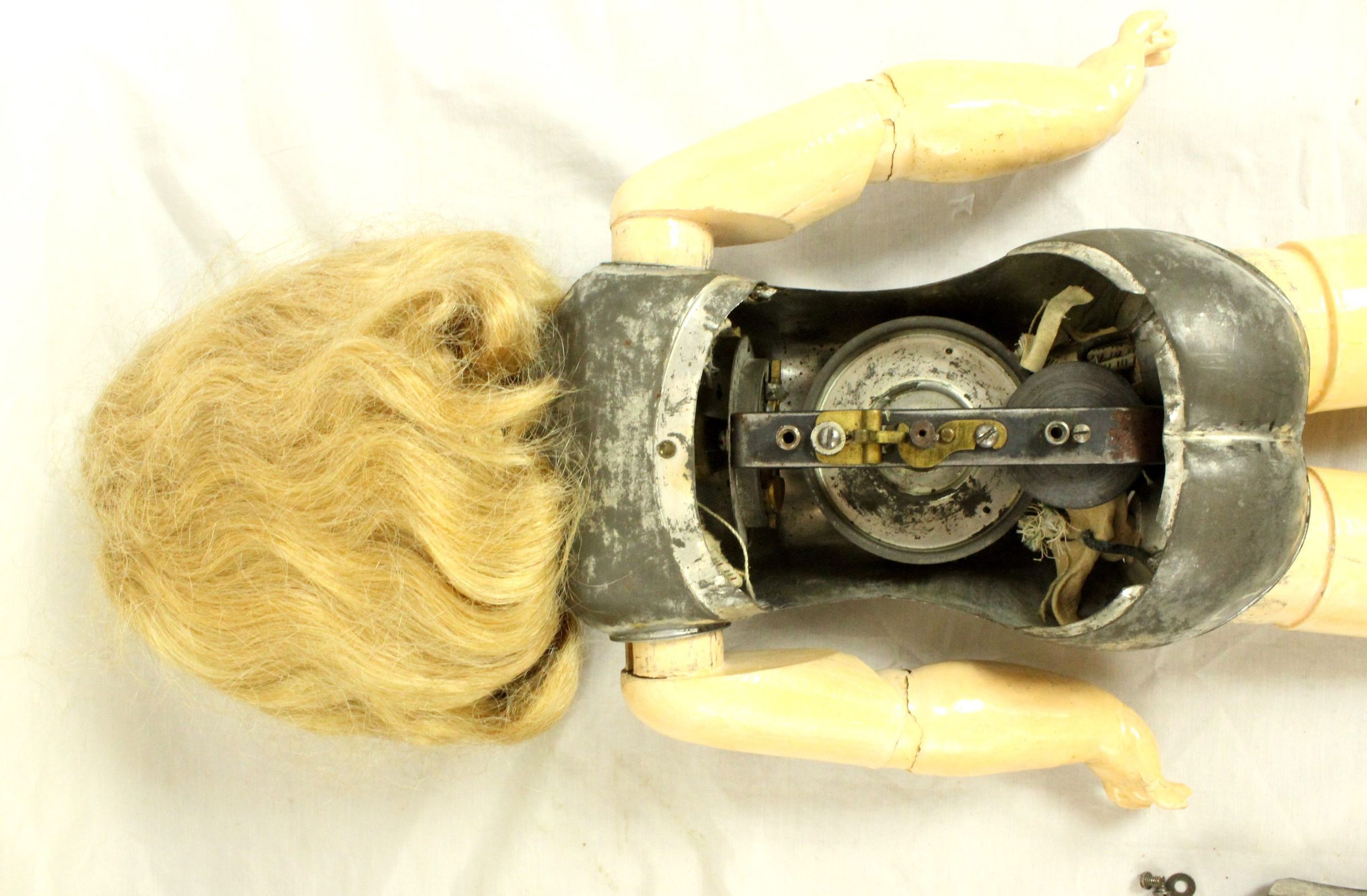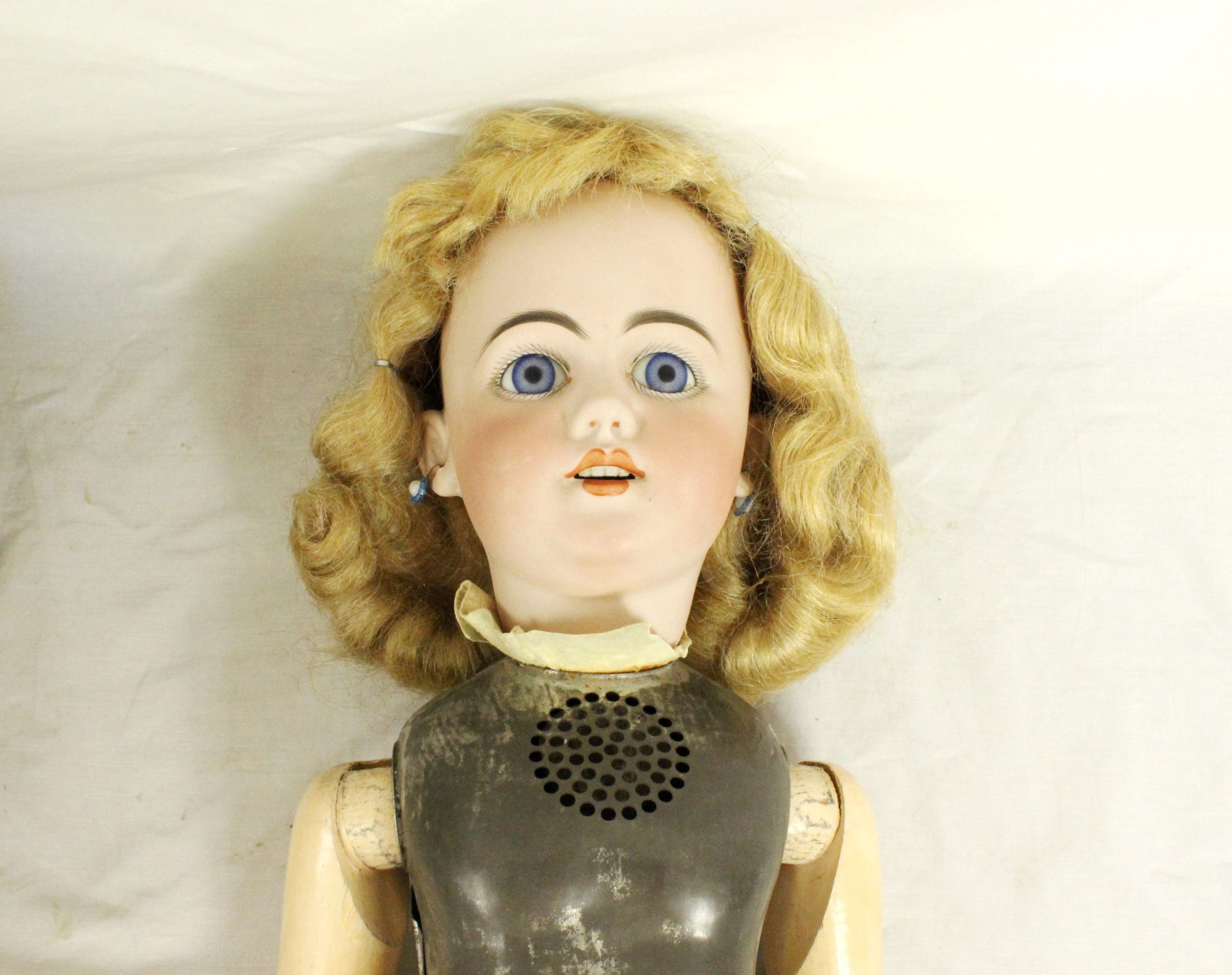 This small doll was a sensation in its time. Around 1890, Thomas Alva Edison introduced the world’s first talking toy doll. Measuring just 18 centimeters in height, it contained a miniature phonograph inside a metal torso. A hand crank protruded from the back, and the sound tube pointed toward holes in the doll’s belly – through which the voice was meant to emerge.