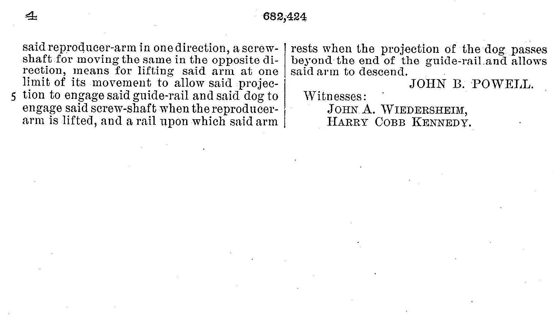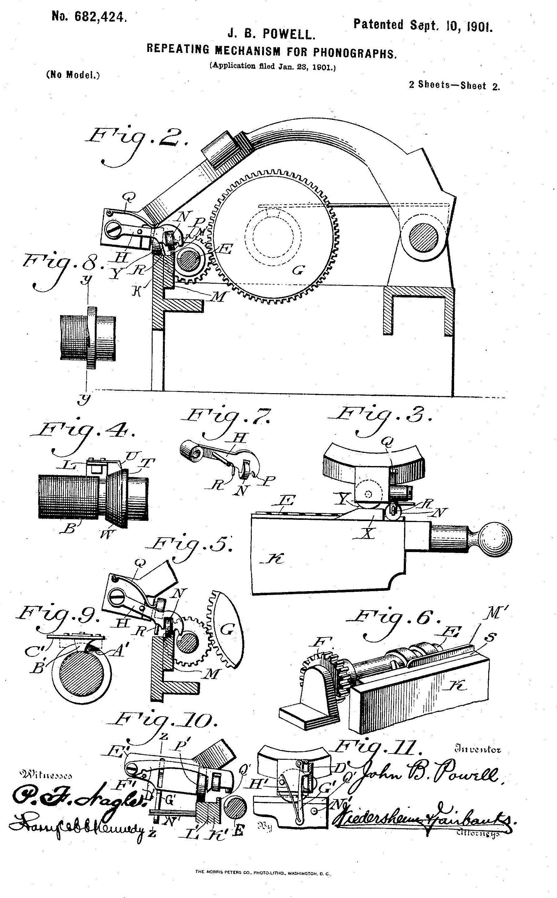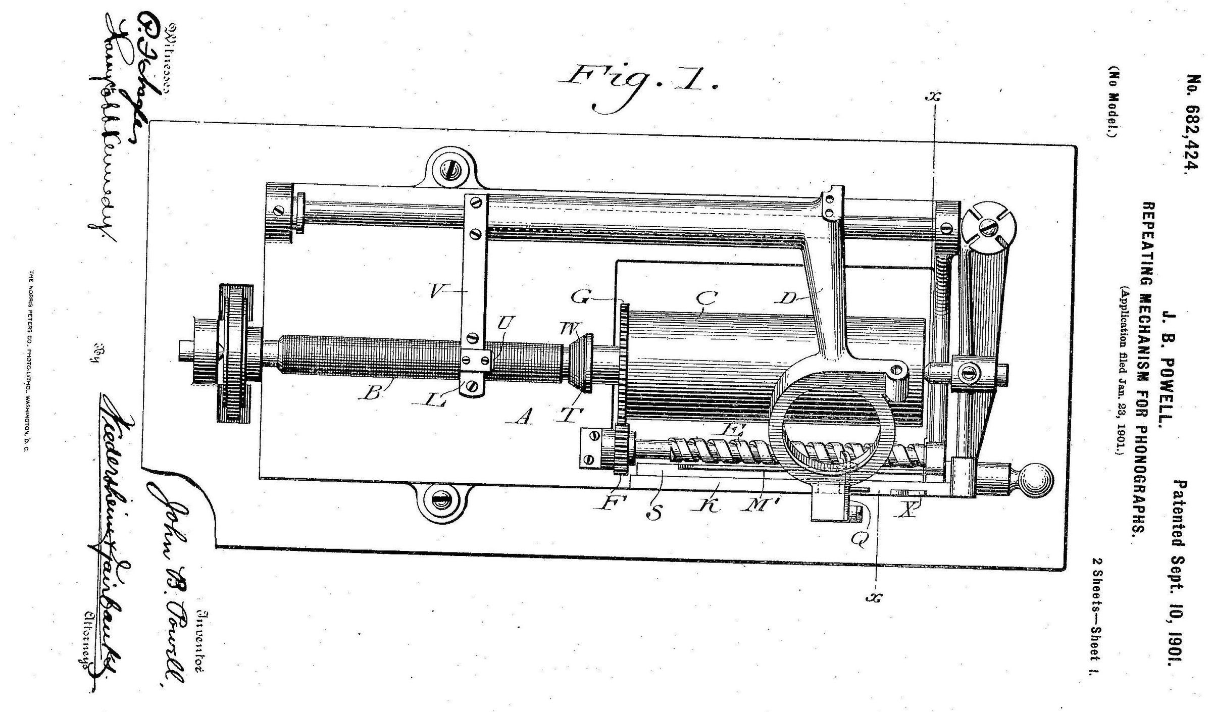 The Welsh-American inventor John Beamish Powell (1828–1911) developed numerous patents for spring motors and phonograph accessories. Most significant was U.S. Patent 682,424 of September 10, 1901 (“Repeating Mechanism for Phonographs”), which allowed a cylinder to be played back automatically in repetition. A corresponding British patent was GB 5778 of May 18, 1901 (“Improvements in Repeating Mechanism for Phonographs”).
