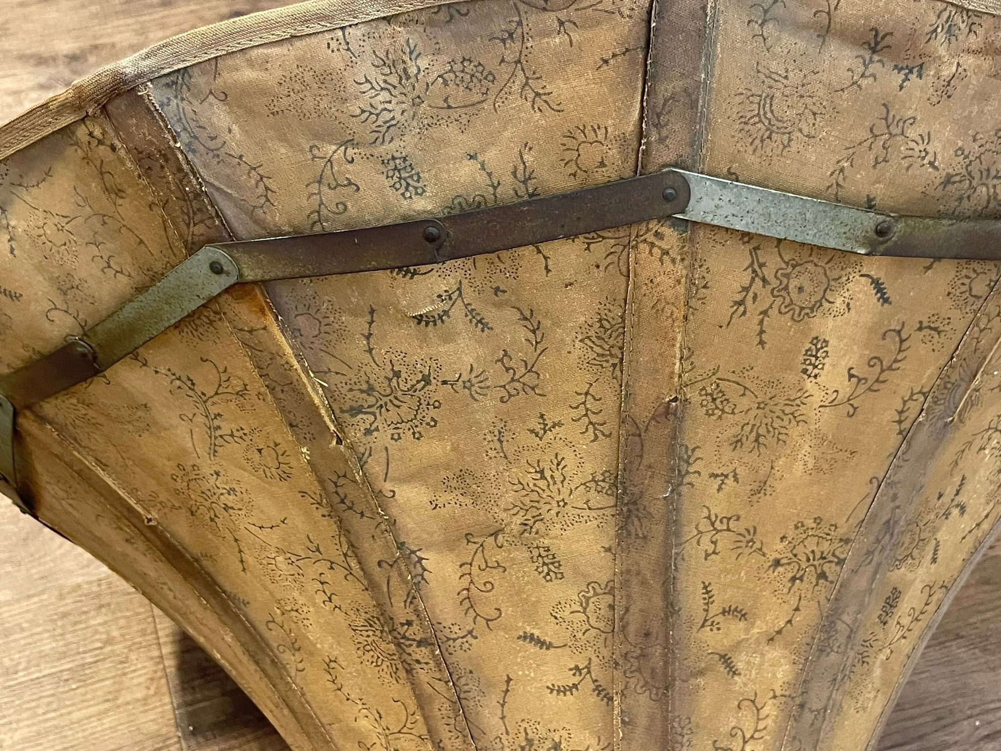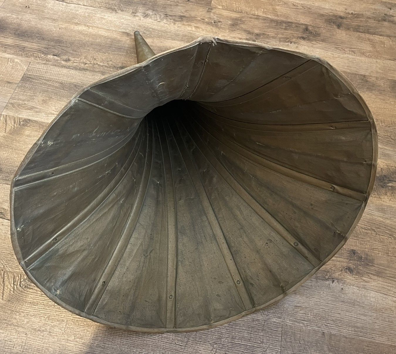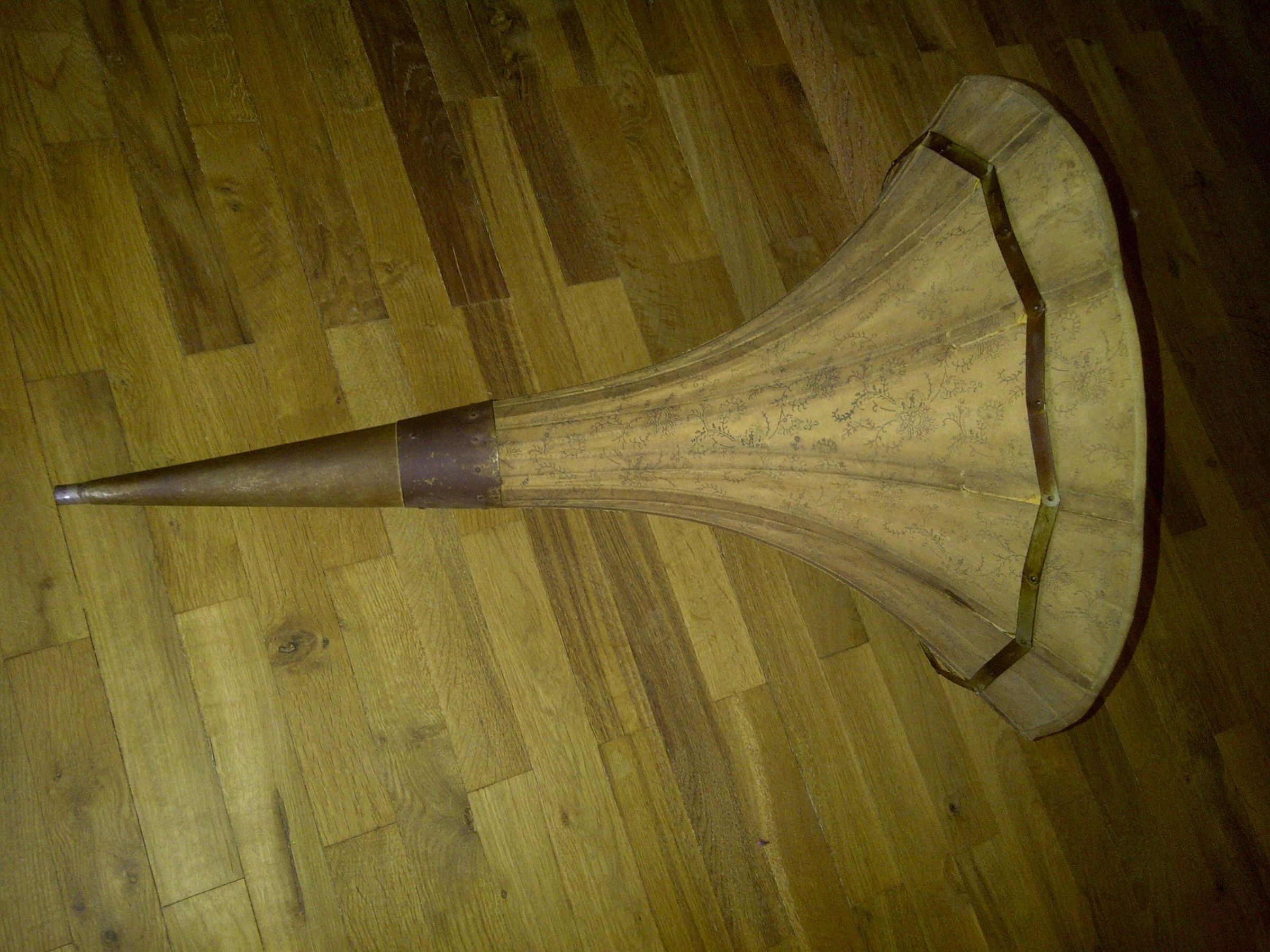 Around 1900, several manufacturers experimented with portable and space-saving solutions for phonographs. One of the most spectacular inventions was the foldable horn, which could collapse like an umbrella. These horns were covered with fabric, often printed with floral patterns on the inside, and stabilized by a system of metal struts and joints.