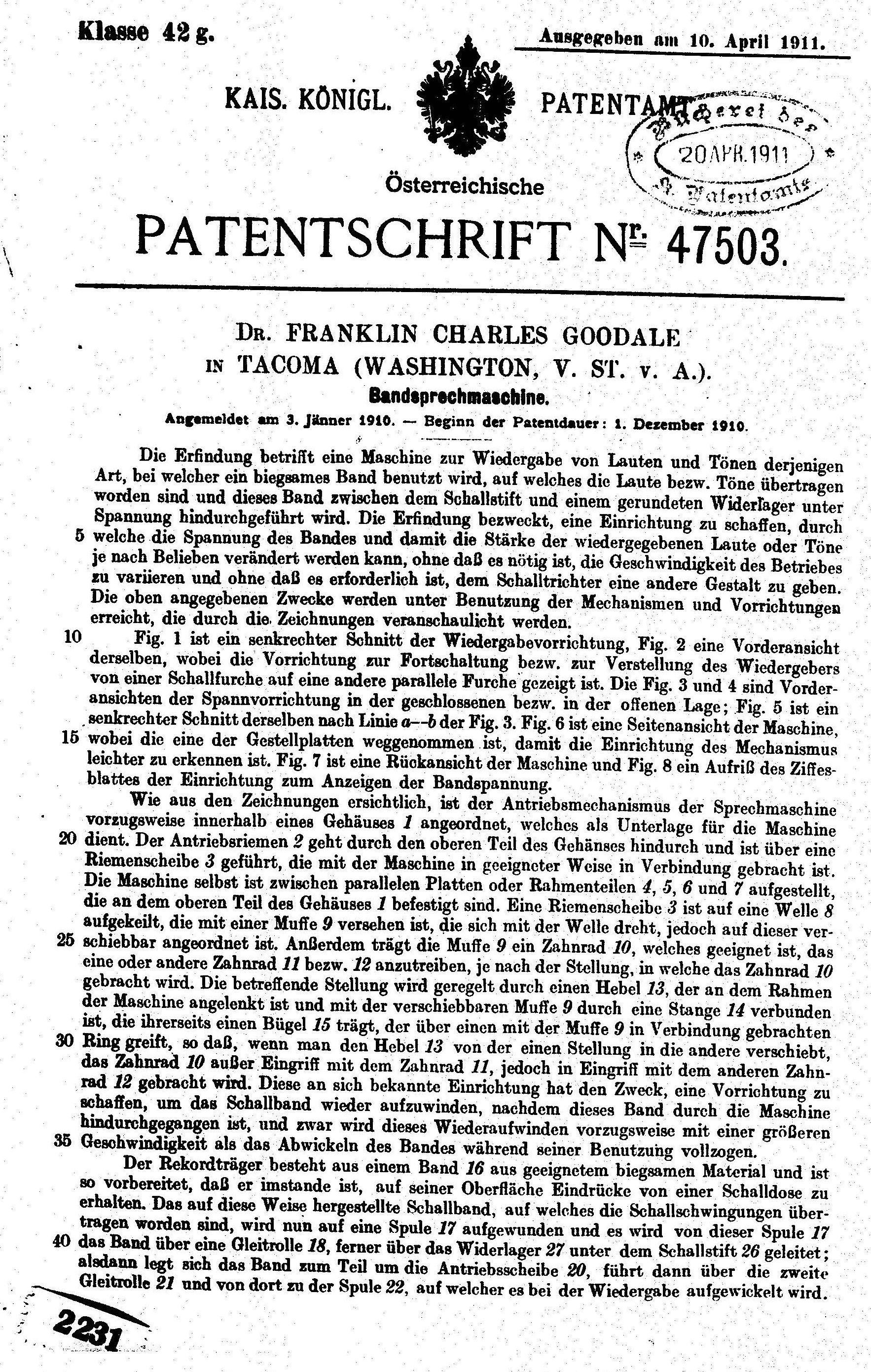 This made Goodale not only the inventor of the tape recorder, but also a pioneer of multitrack recording—long before magnetic tape recorders or multitrack studios existed.