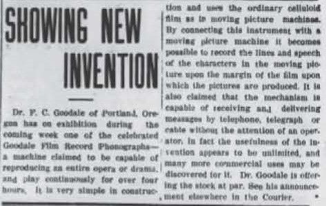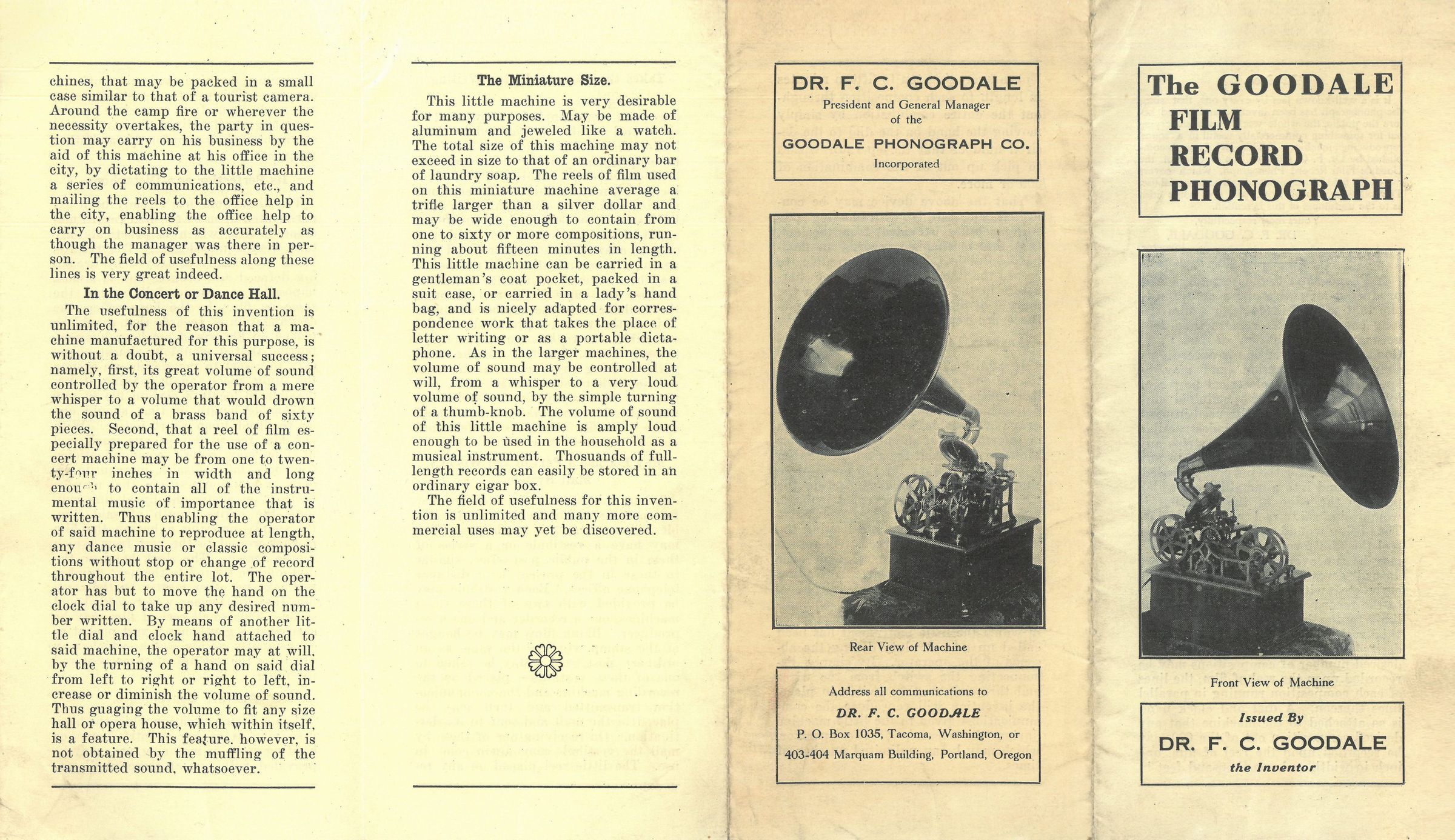 Around 1908, while all phonographs still relied on wax cylinders or shellac discs, American physician and entrepreneur Dr. Franklin Charles Goodale devised an entirely new recording method. His machine recorded sound on a continuous strip of celluloid film—similar to motion picture film, but instead of images, the surface carried a fine, laterally‑cut sound track.