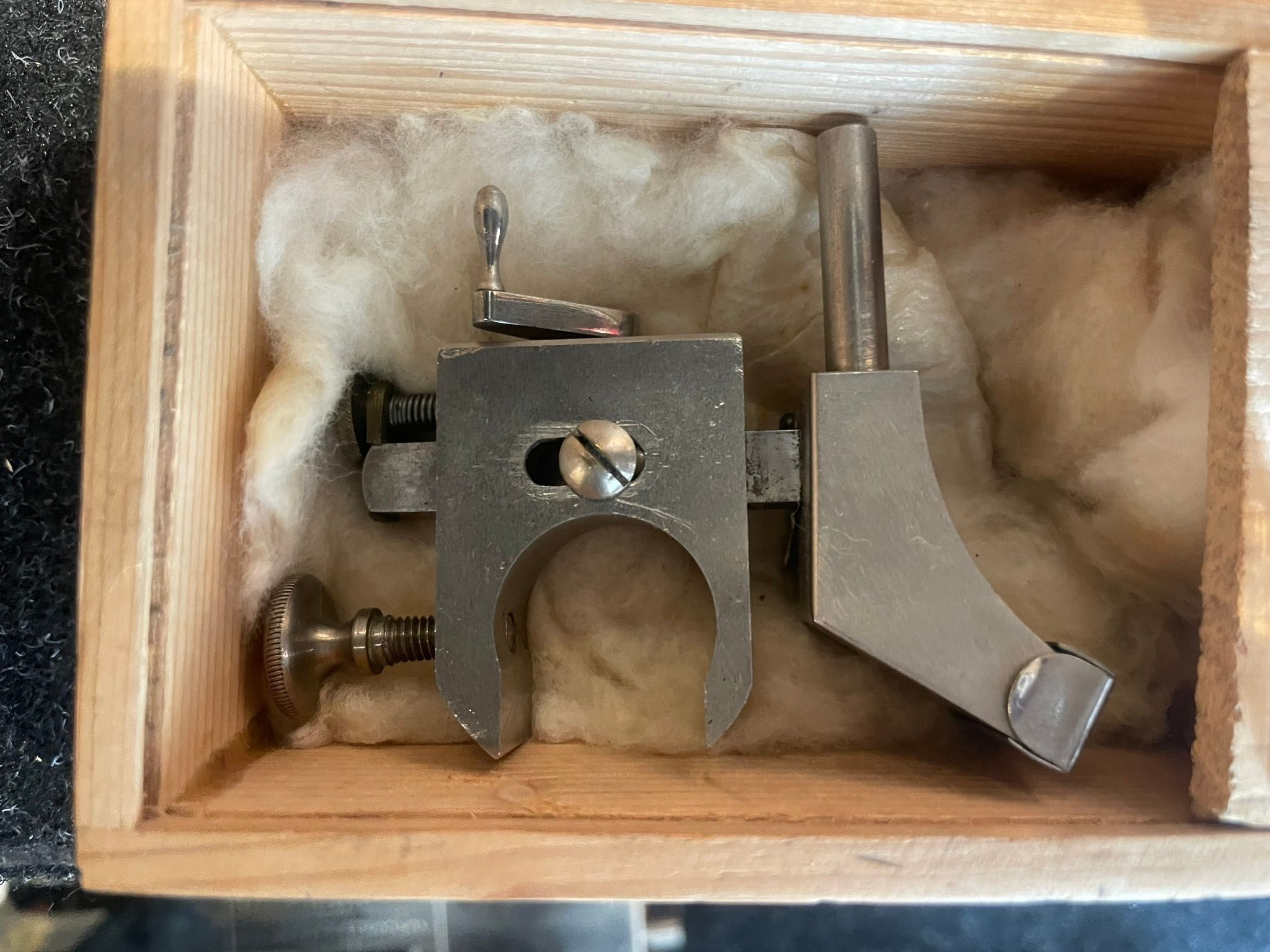 The Simplex shaver is mounted directly onto the Graphophone carriage in place of the reproducer. As the cylinder rotates, a fixed steel blade glides over the surface, removing a fine layer of wax. A side-mounted hand crank with a worm gear ensures steady and even movement across the cylinder.