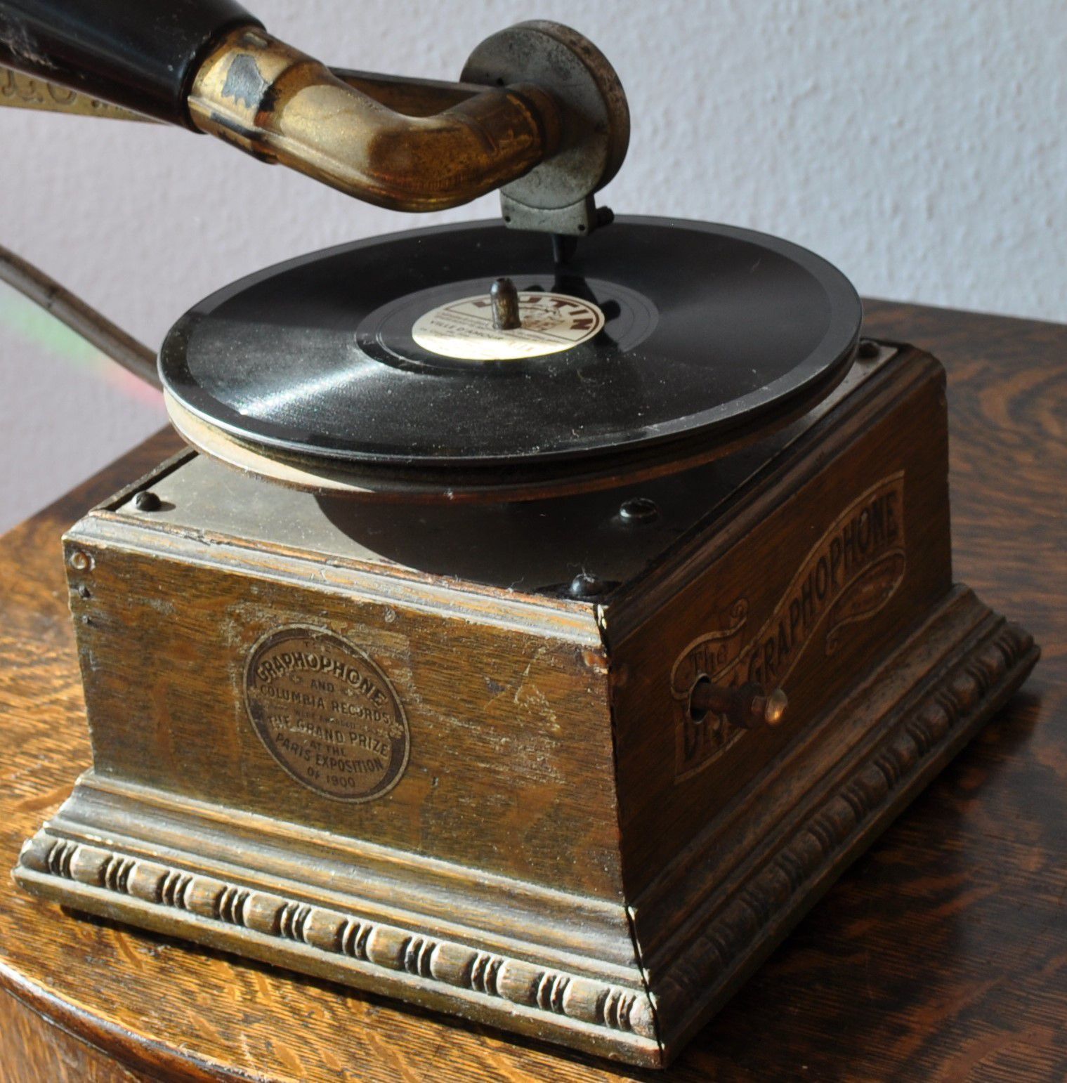Cabinet: oak case with decorative moulding and large “Disc Graphophone” banner