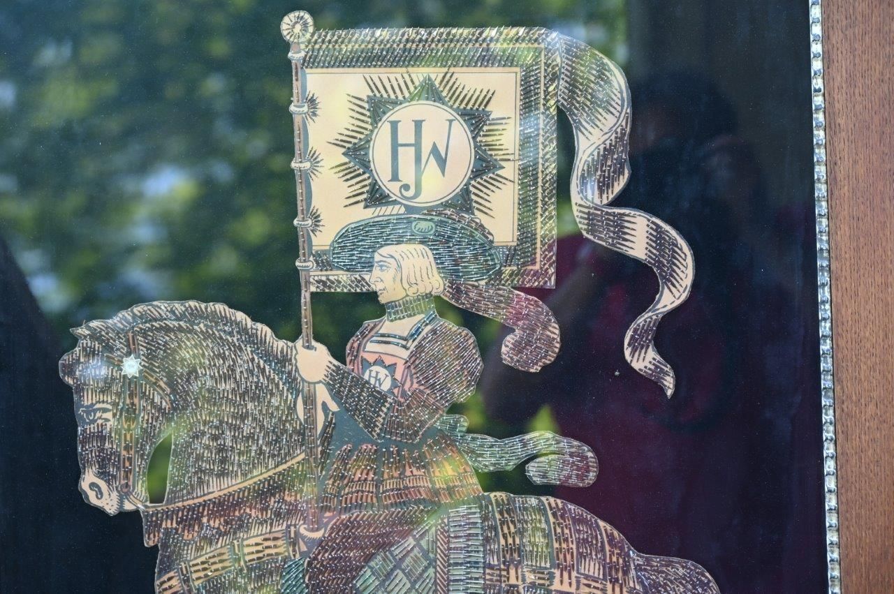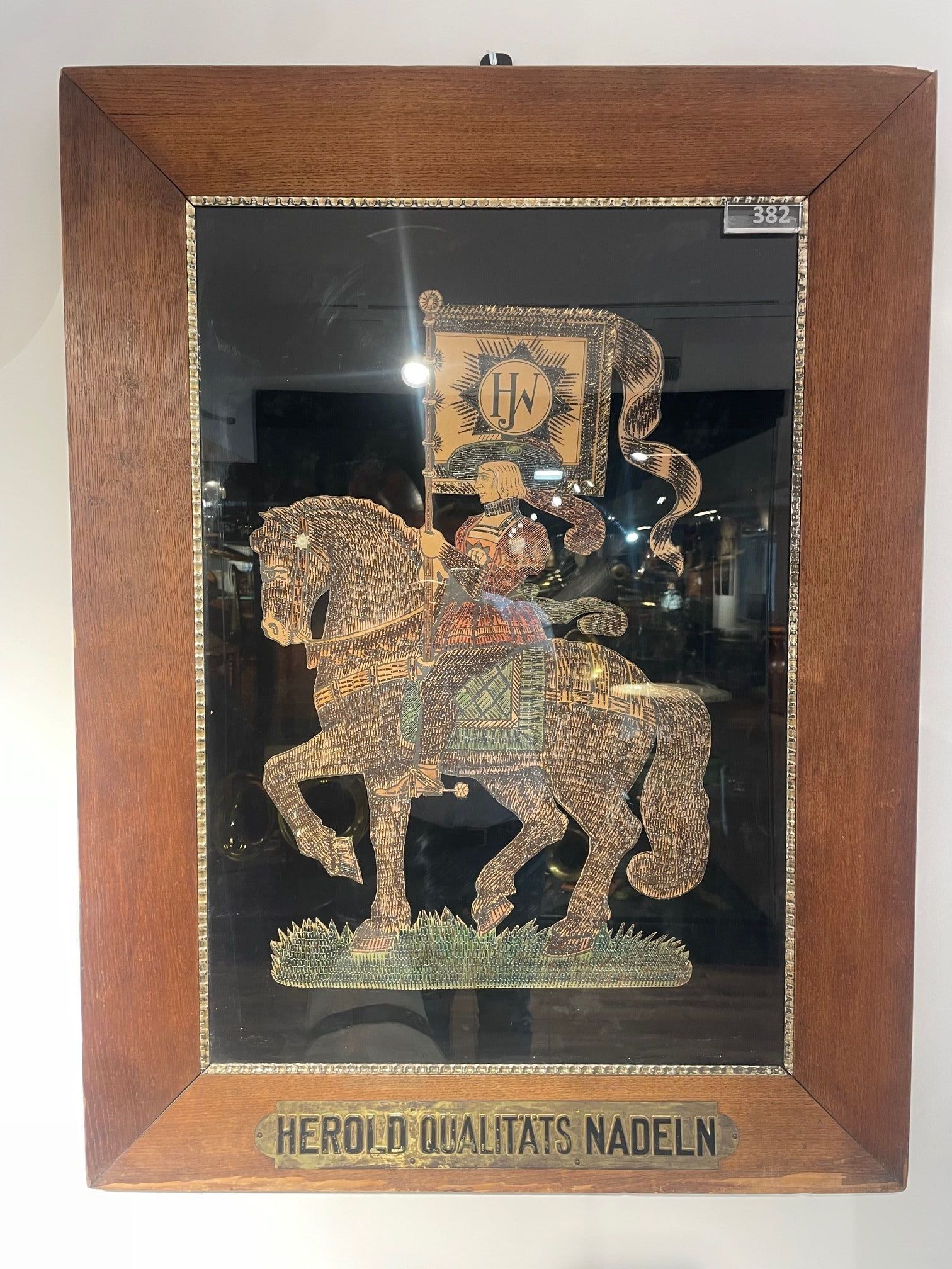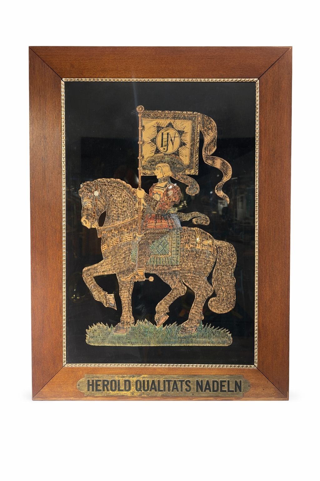 This large-scale picture – a knight on horseback carrying a banner – was meticulously assembled from thousands of gramophone needles. It represents an extremely rare showpiece produced by the company Herold Quality Needles. According to the reference book Herold Qualitäts Nadeln, Square and Rectangular Tins (Linz, pp. 146–147), only a handful of these “Herold Knights” are known to exist: three made from gramophone needles and two from other types of needles.