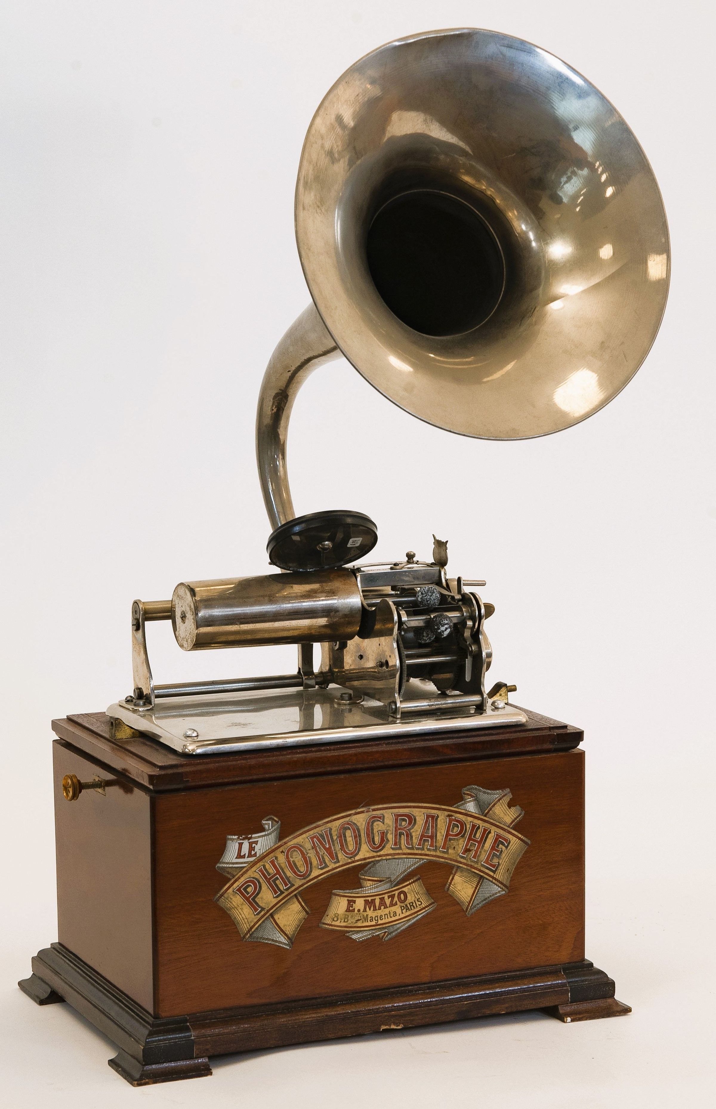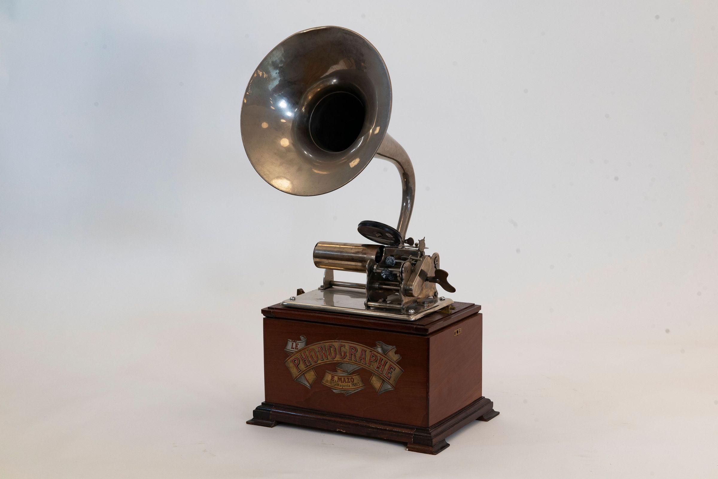 Original Mazo school phonographs are extremely rare today. Particularly sought after are examples with complete, original decals and their original hunting horn. The example displayed here in the Edisonium remains in exceptionally fine original condition and reflects the high craftsmanship and design quality of French phonograph production around 1900.