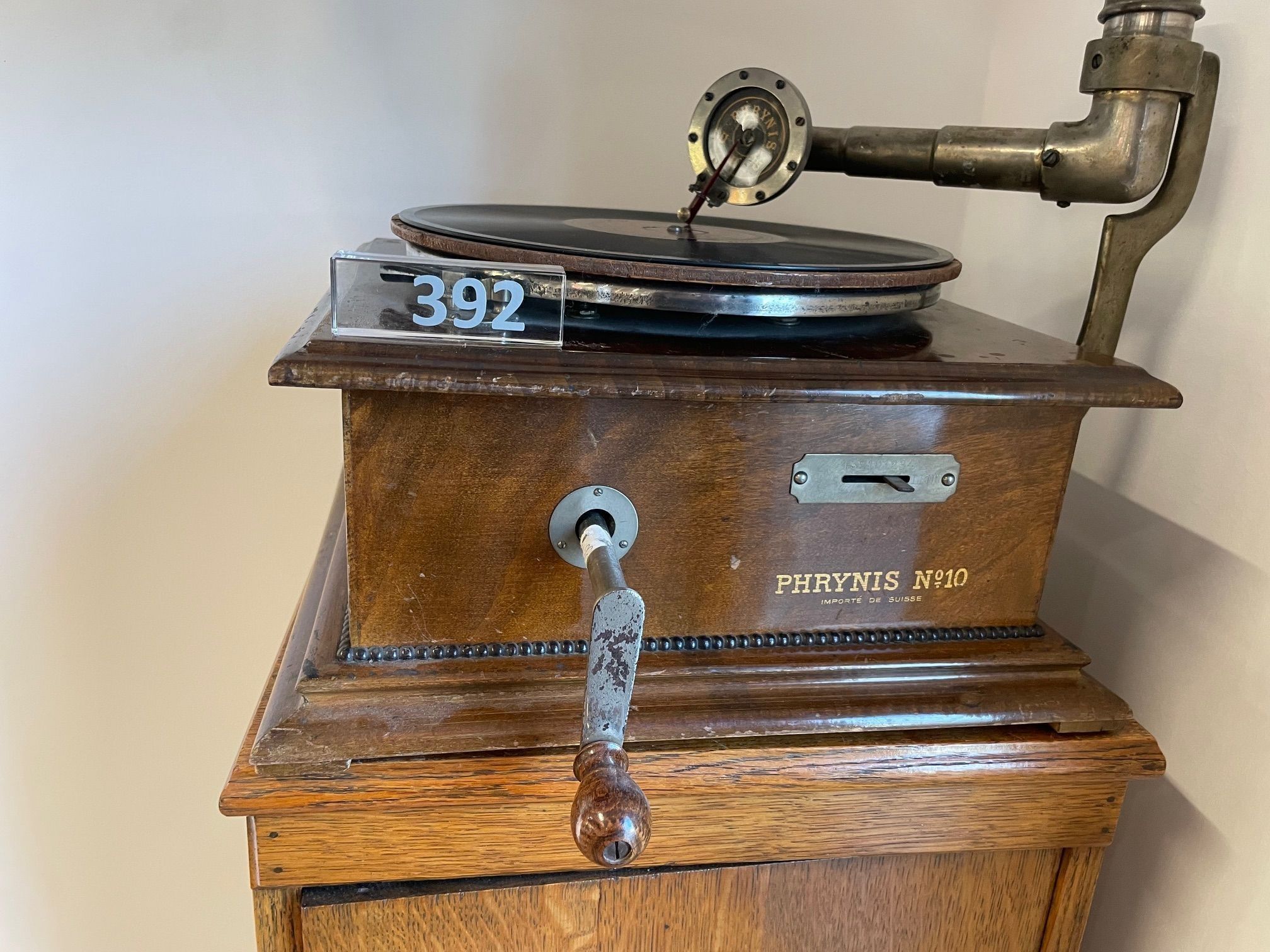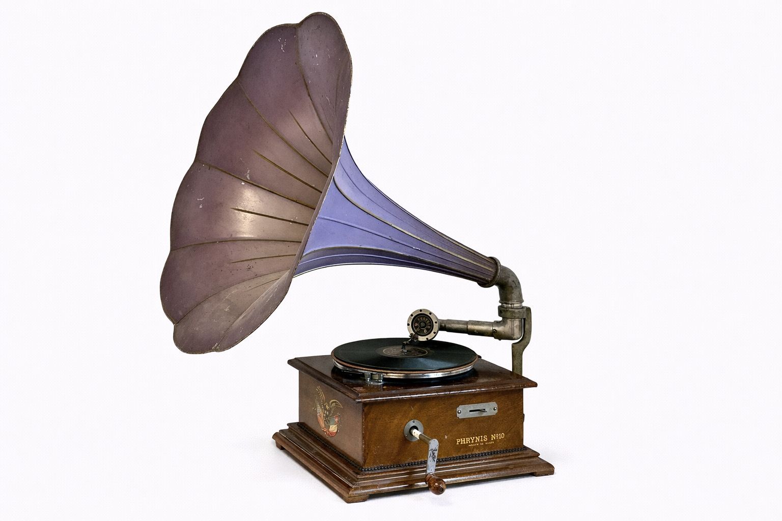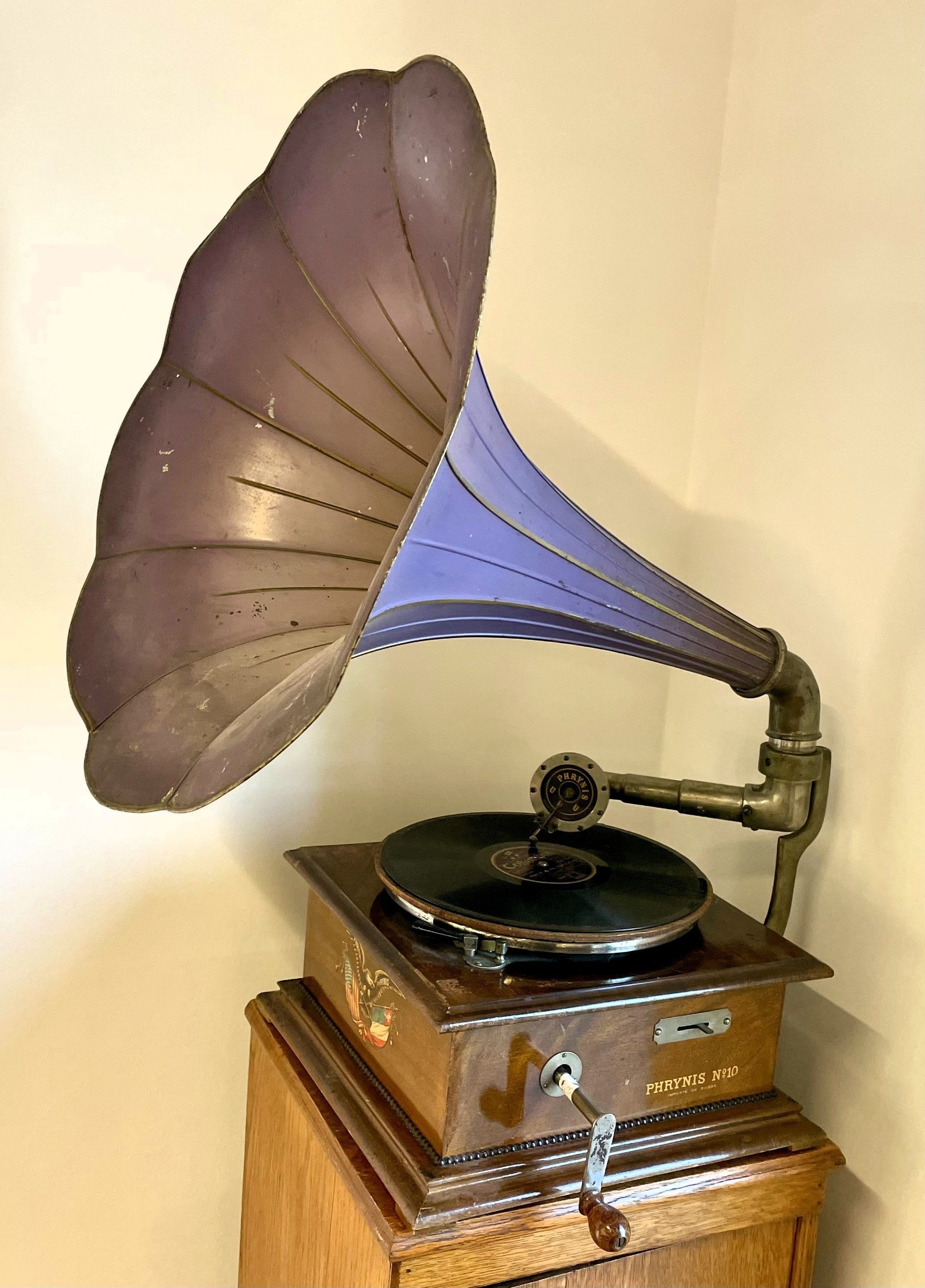 The machine is equipped with a spring-driven motor operated by hand crank, typical of high-quality continental European gramophones of this period. Despite its compact construction, the Phrynis No. 10 delivers a clear and assertive acoustic performance, the result of careful coordination between motor, tonearm, soundbox, and horn.