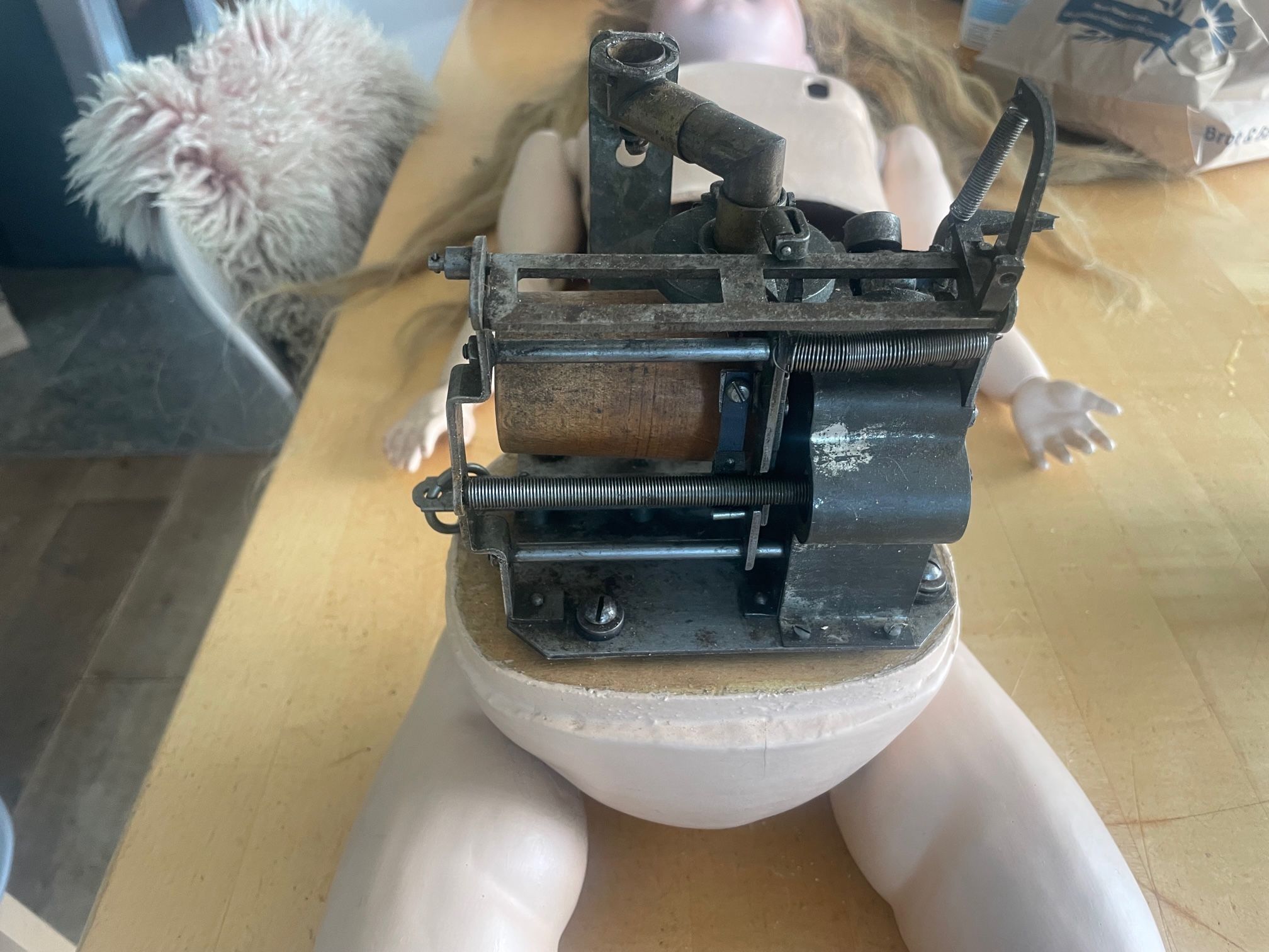 Inside the Arnoldia is a fully functional mechanical cylinder phonograph, specifically designed for installation within a doll’s body. Despite the relatively small size of this version, the mechanism is technically complete, enabling clear speech and singing reproduction.