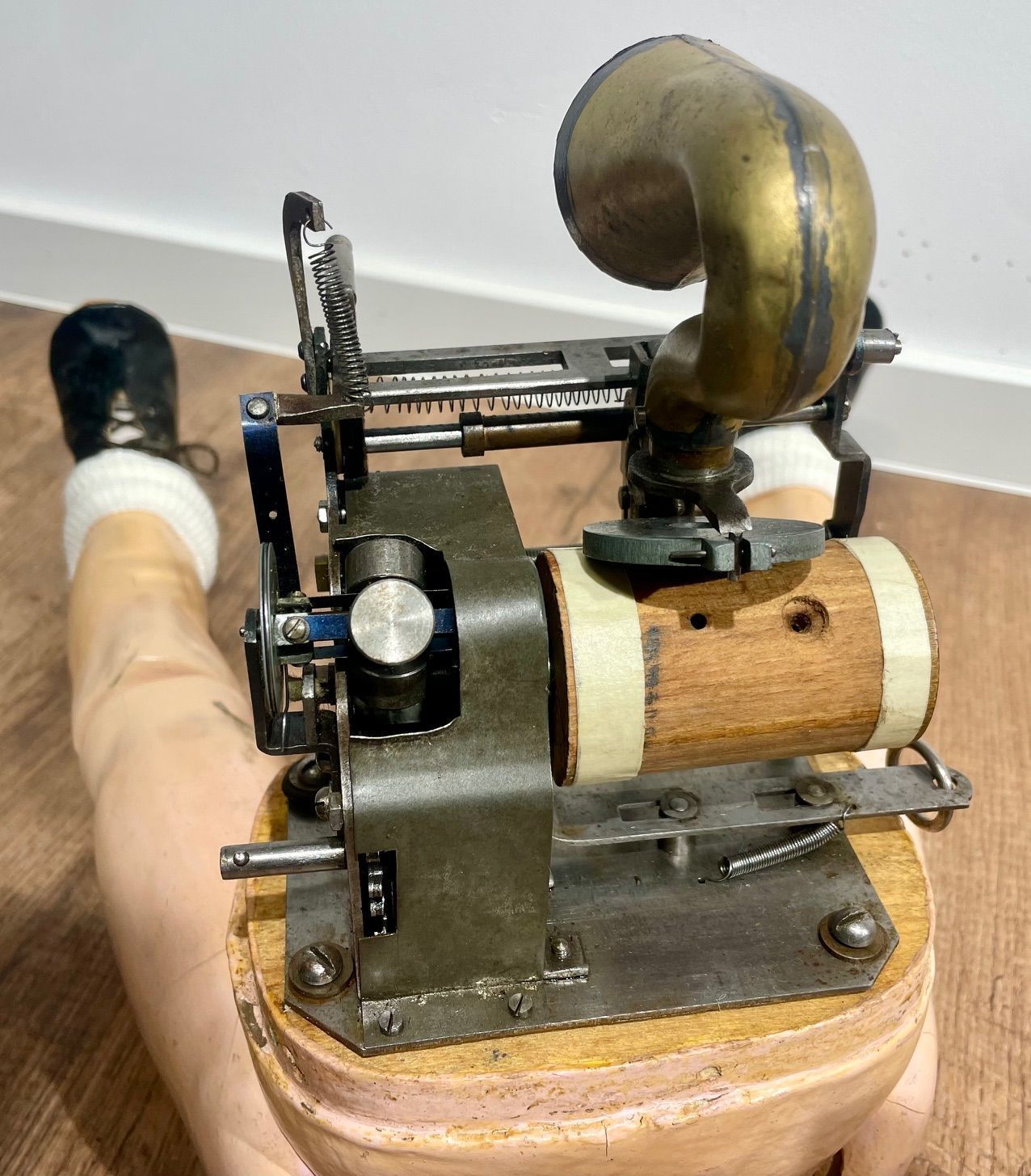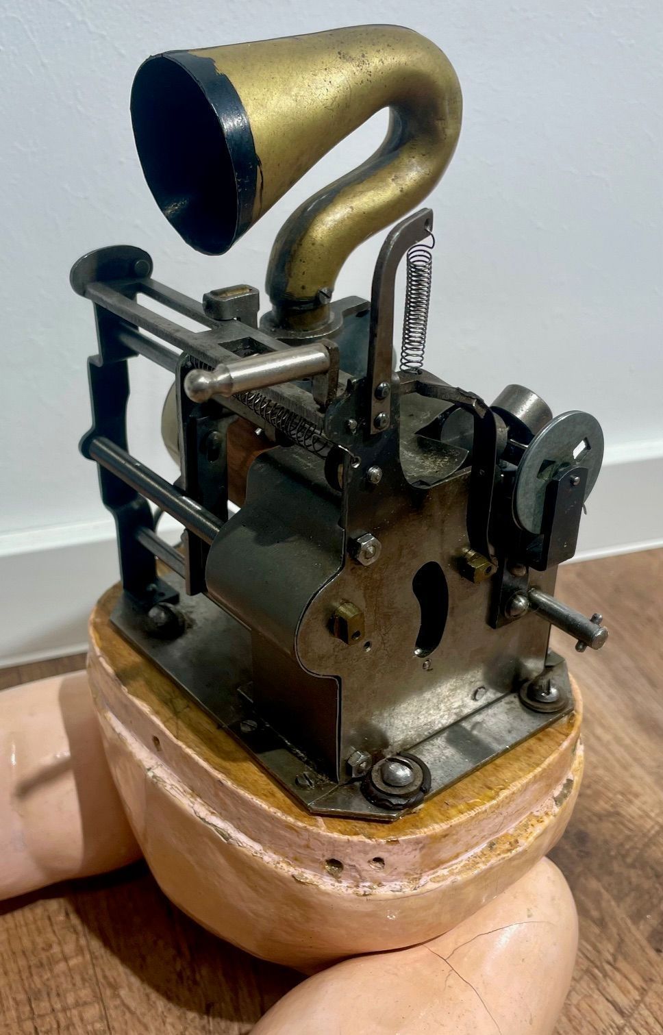 Inside the Arnoldia is a fully functional mechanical cylinder phonograph, specifically designed to fit within a doll’s body. Despite the limited internal space, the mechanism is relatively large in scale in order to achieve clear and sufficiently loud speech and singing reproduction.