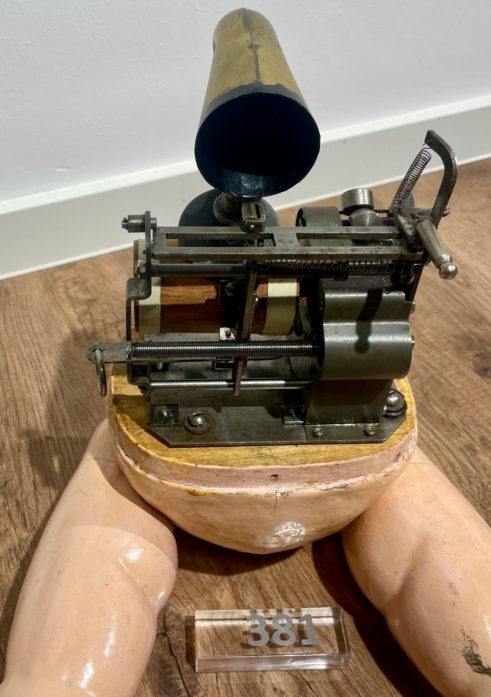 In contrast to the Arnoldia with exhibition number 137, in which the sound is guided through a tube system into the head, this example (no. 381) features a forward-directed horn that projects the sound directly from the upper torso.