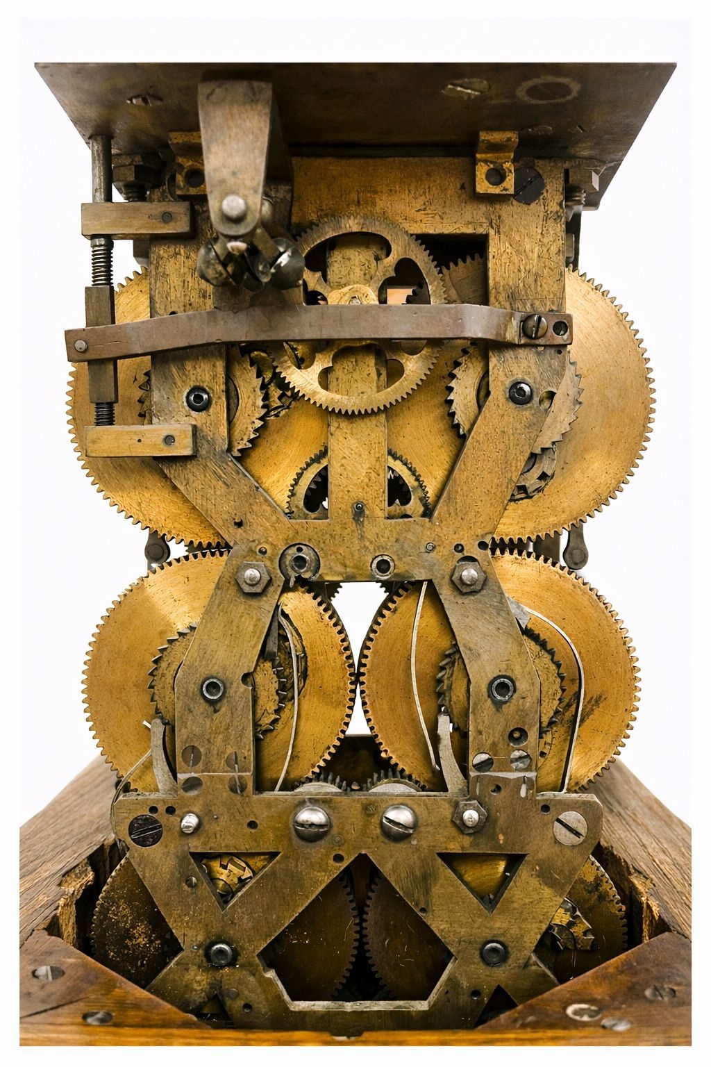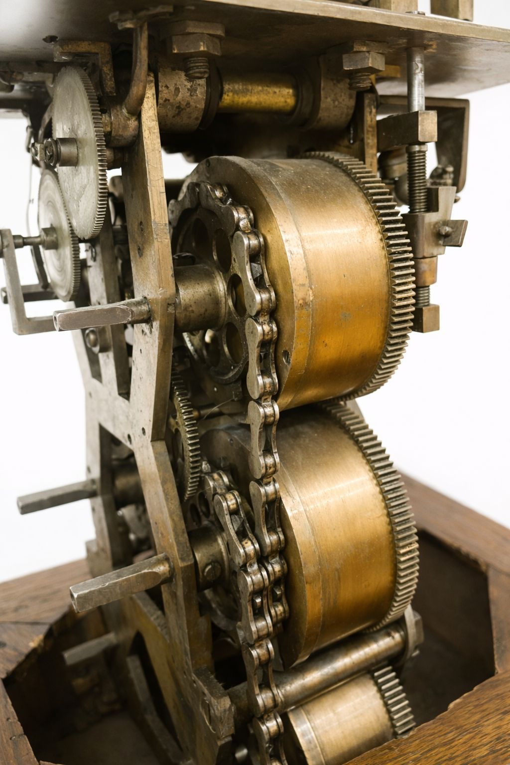 Cabinet: Elaborately crafted oak housing, designed to slide downward to provide full access to the spring motor for maintenance