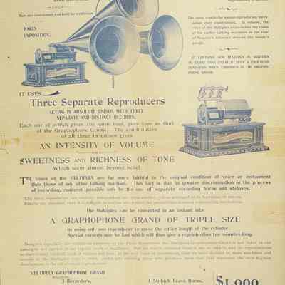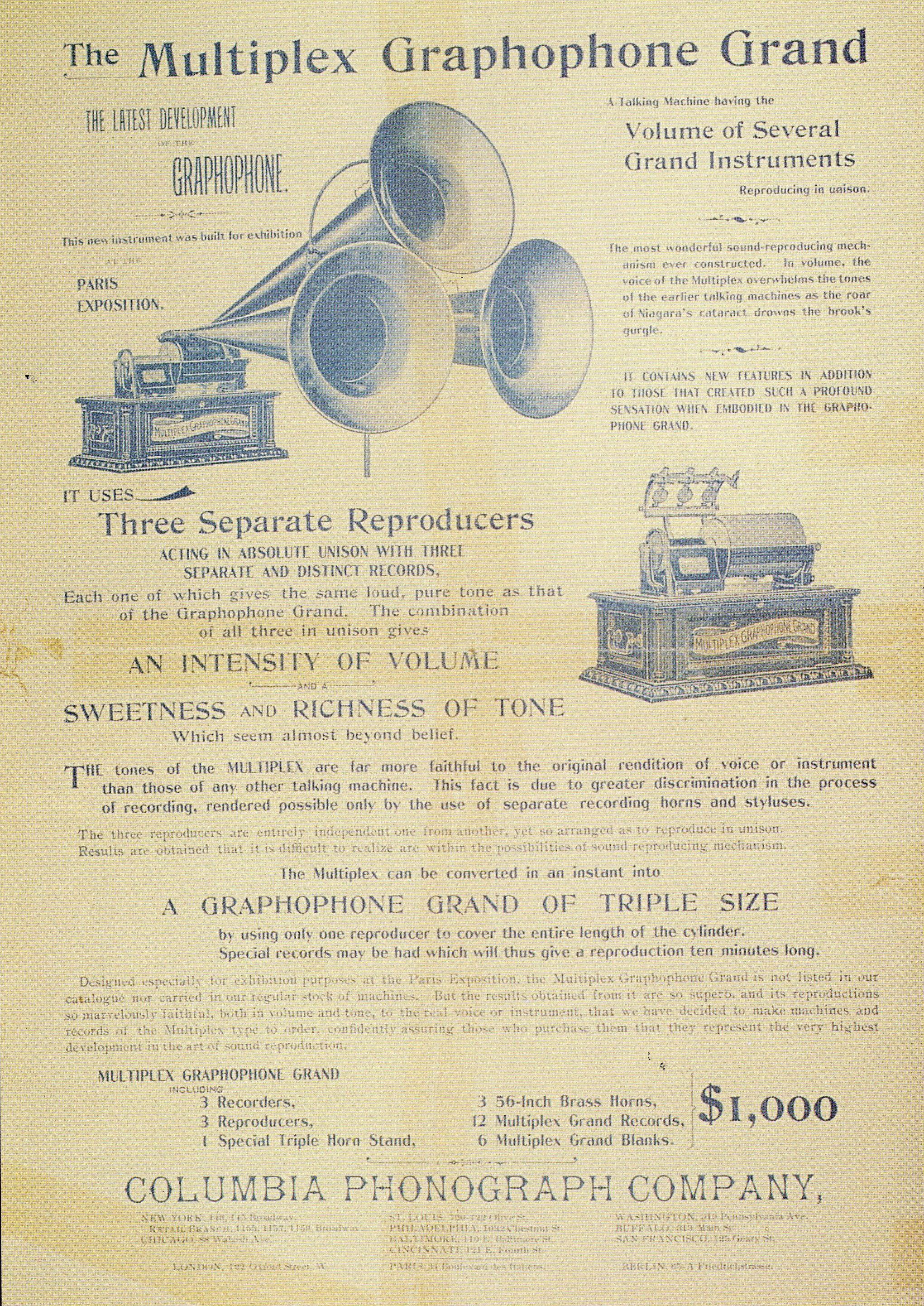At a cost of $1,000, the Multiplex Grand was one of the most expensive phonographs ever sold. Adjusted for inflation, that amount is roughly equivalent to $150,000 today.