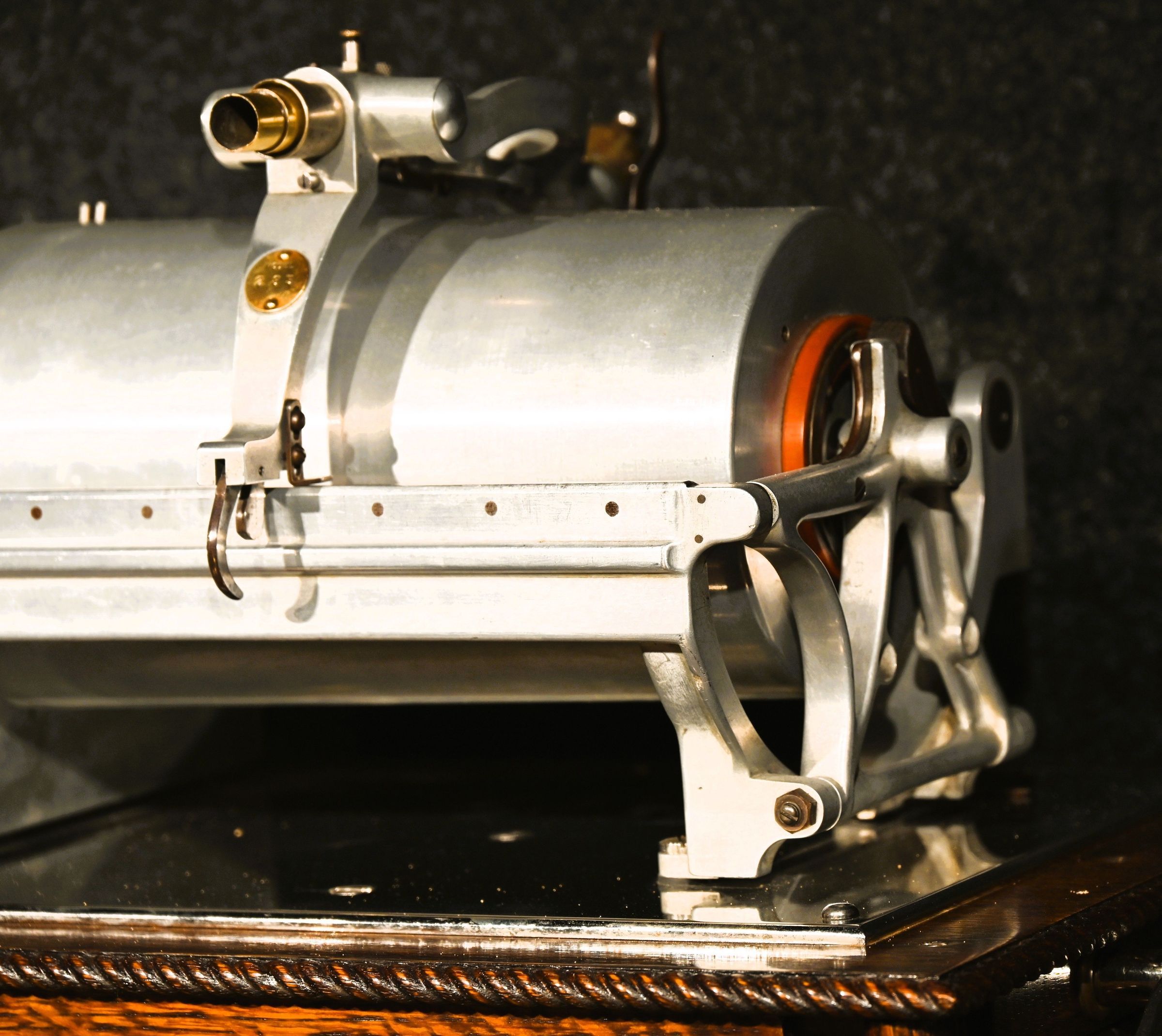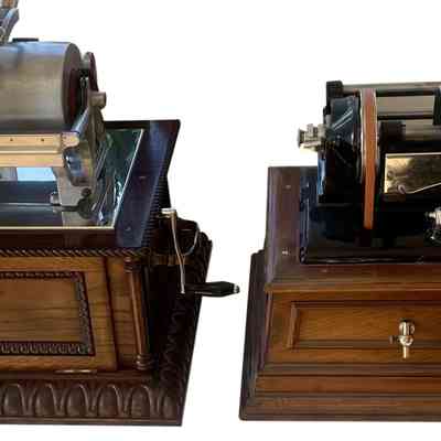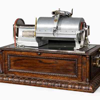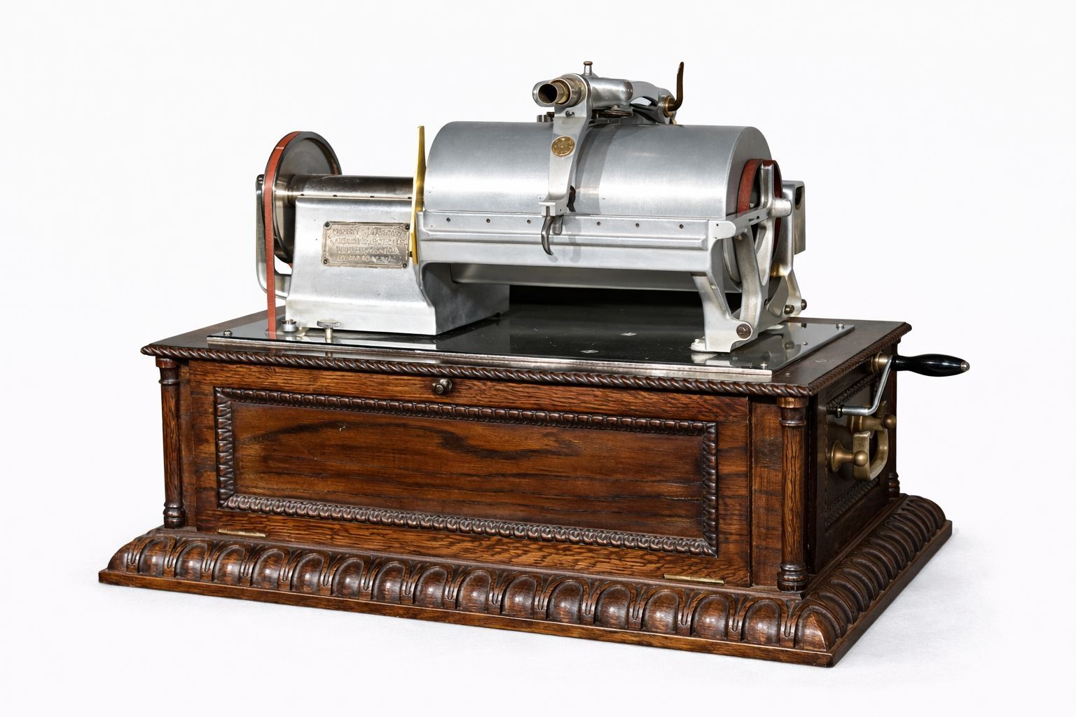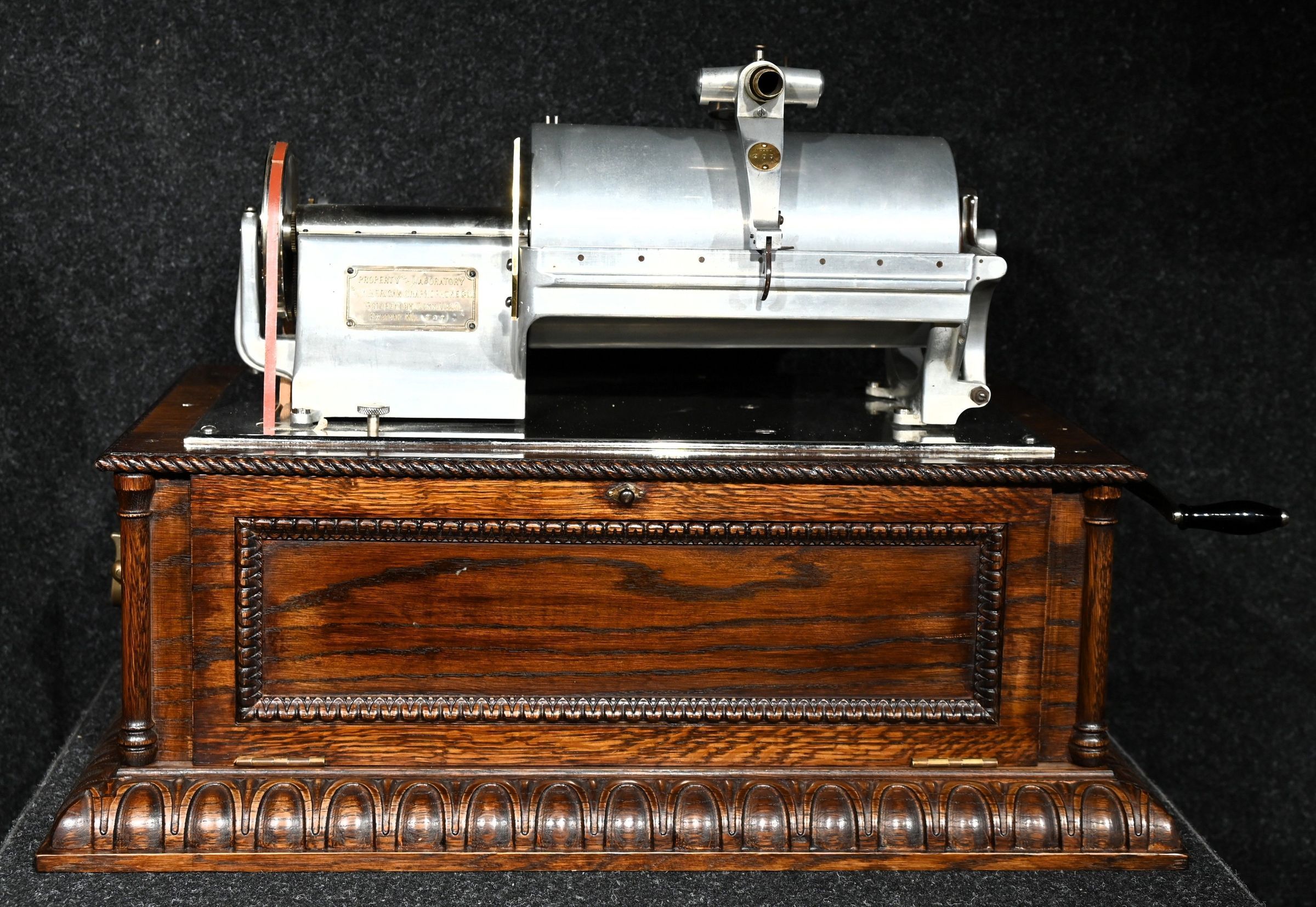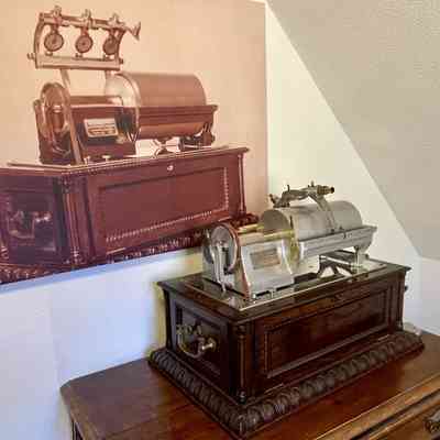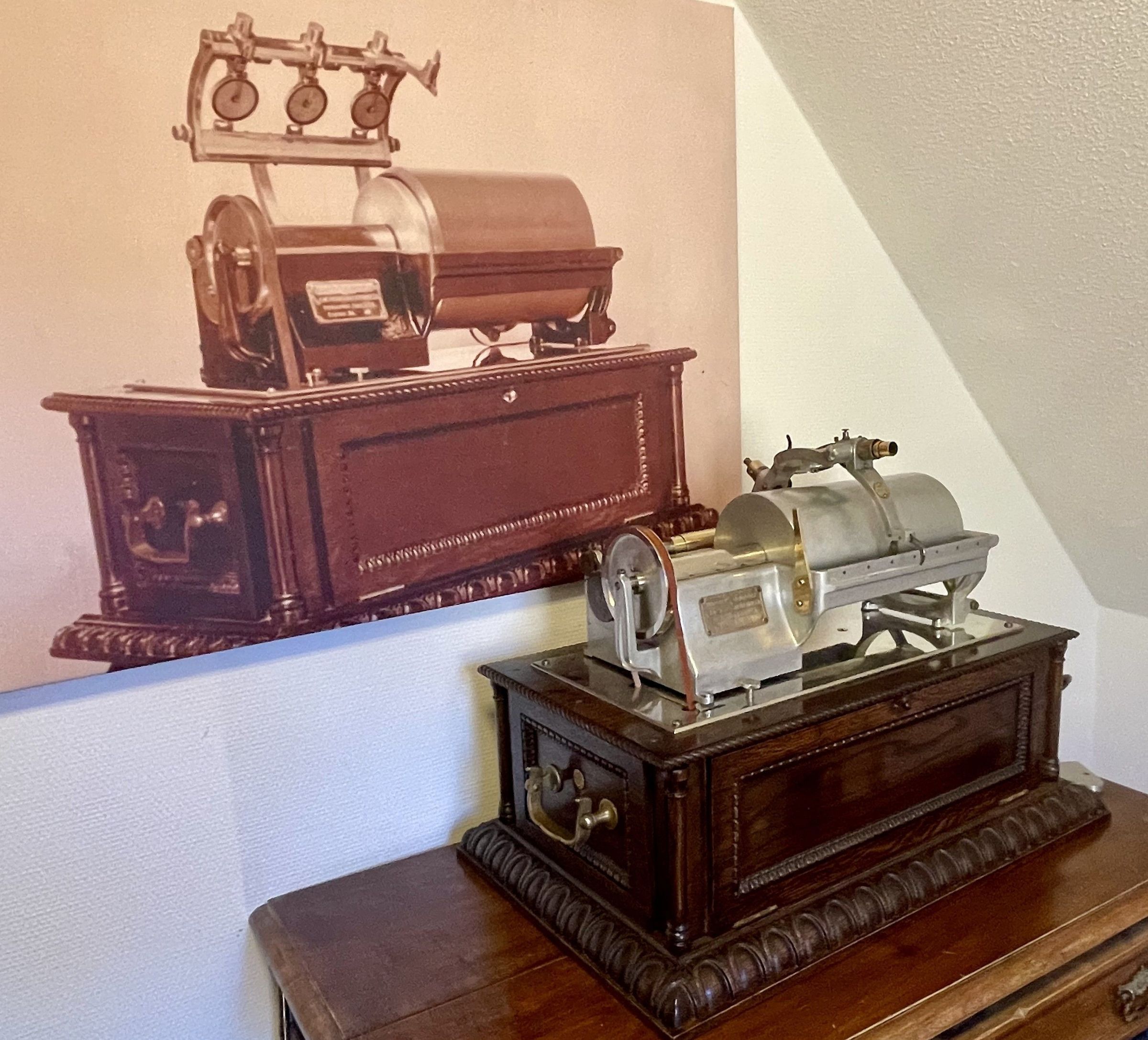 The displayed machine comes from the renowned collection of Charles Hummel, one of the world’s foremost collectors of early talking machines. It is believed to be the only surviving original example of this type worldwide – complete with its original brass “Graphophone Laboratory Exhibit” plate, functioning reproducer, and preserved cylinder.