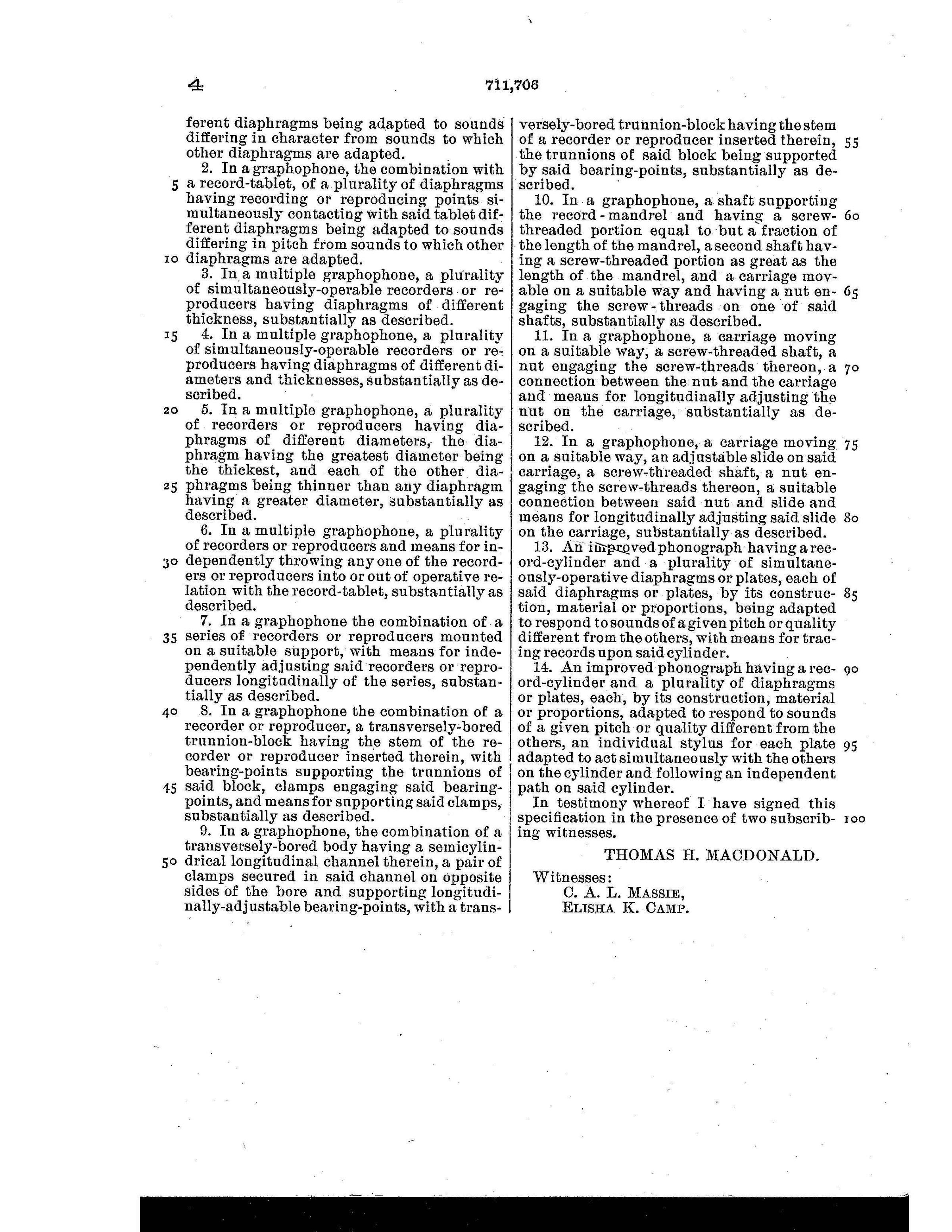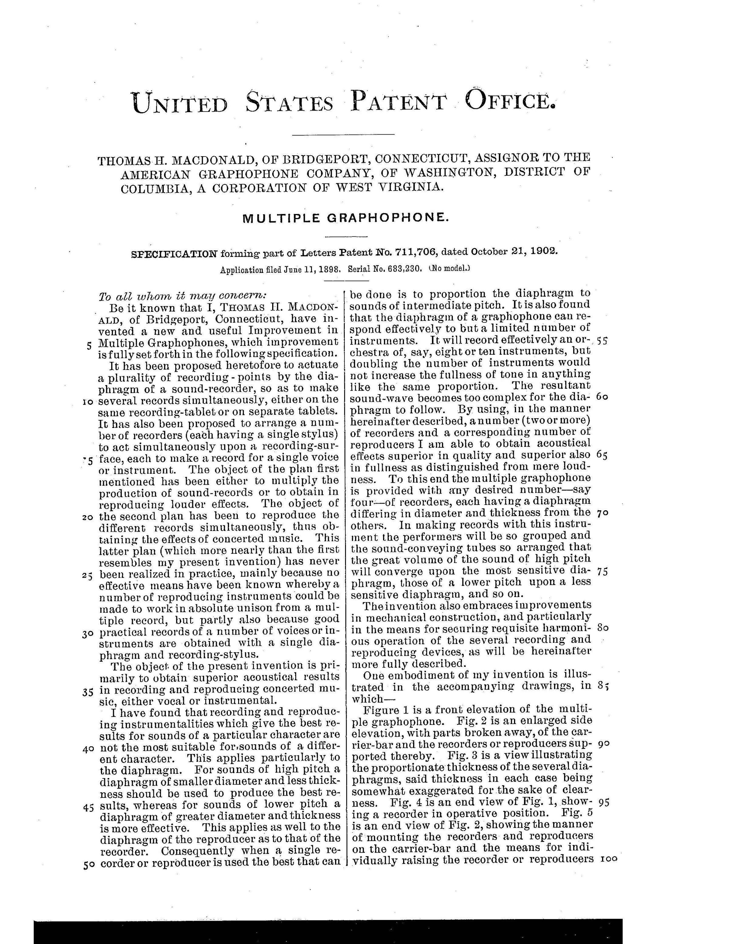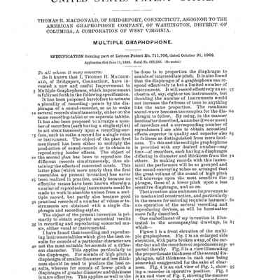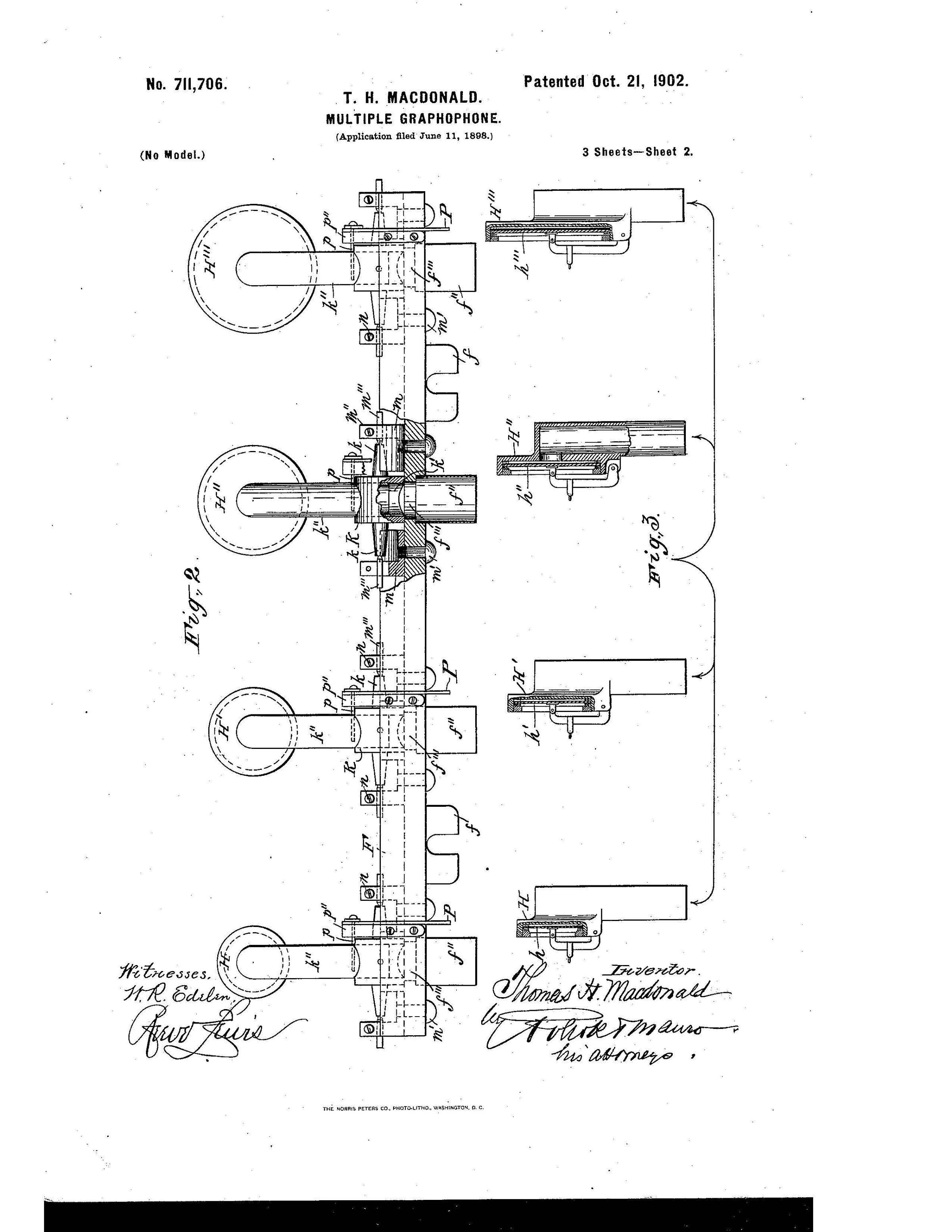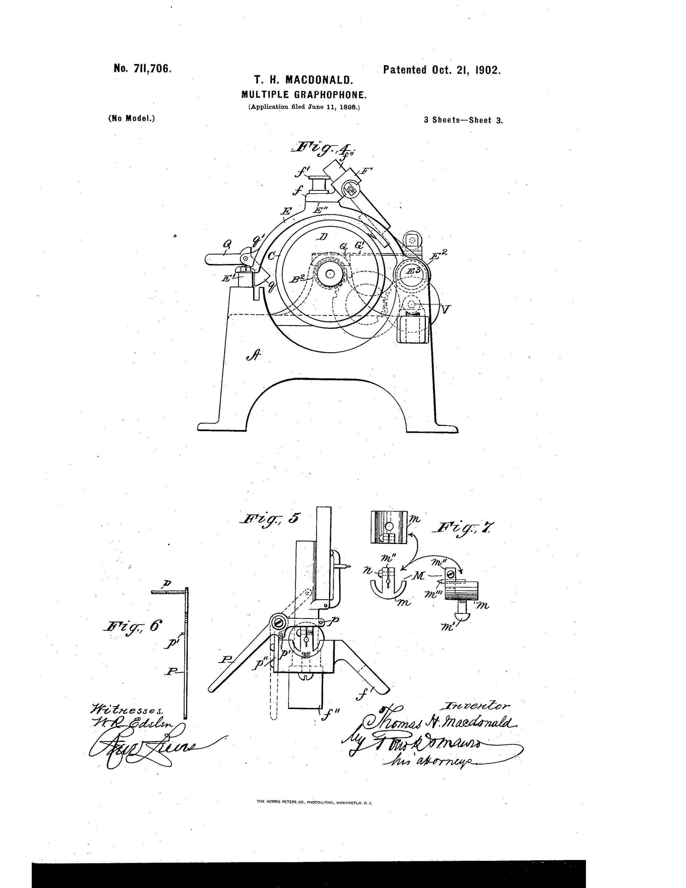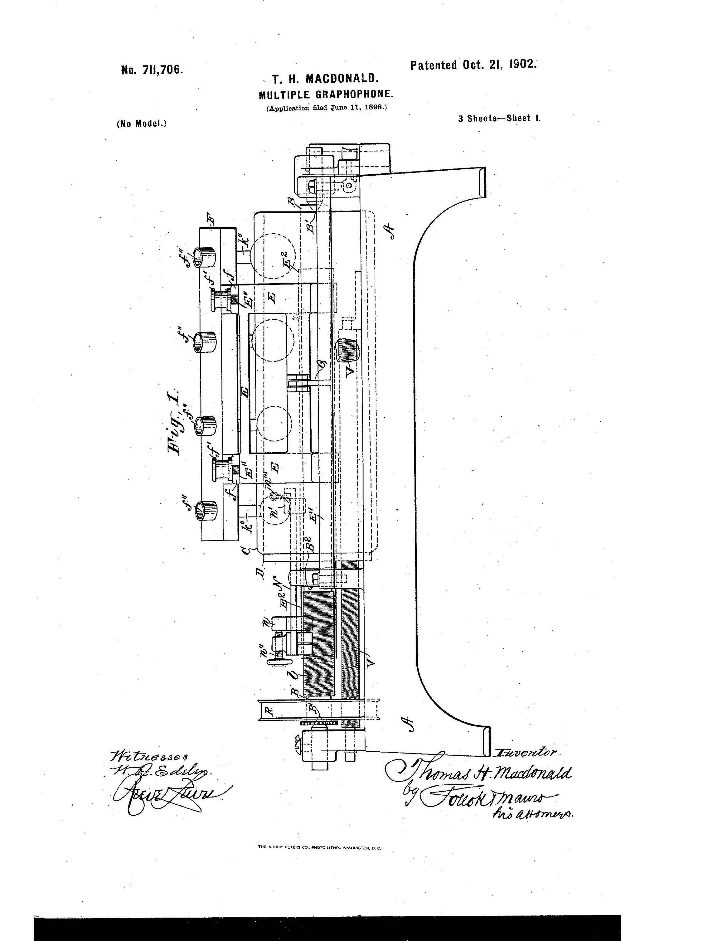 This monumental sound reproduction device, developed by Thomas H. Macdonald, was the largest and most technically ambitious talking machine of its time. It marks a milestone in the history of recorded sound and is considered the first multi-track playback device ever built. The underlying U.S. Patent No. 711,706, filed by Macdonald, describes a complex mechanical system for the simultaneous playback of multiple audio tracks on an oversized wax cylinder.