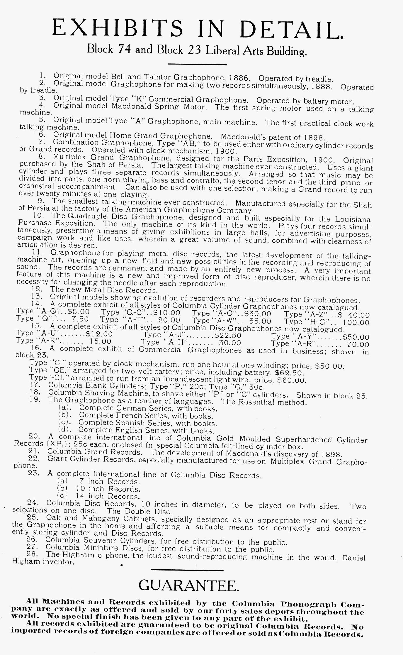 The Multiplex Graphophone Grand was designed for the 1900 Paris Exposition Universelle, where it caused a sensation. In 1904, an enlarged and refined version was showcased at the St. Louis World’s Fair, listed as Exhibit No. 8. A copy of the St. Louis exhibit list is preserved alongside the machine. The Multiplex used three parallel tracks on a massive wax cylinder, each playable simultaneously or individually.