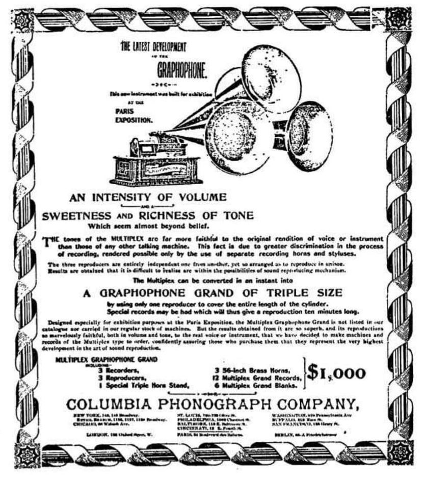 The Columbia Phonograph Company promoted the Multiplex as a technical showpiece rather than a commercial product. In catalogs and trade press, the company highlighted its acoustic superiority: