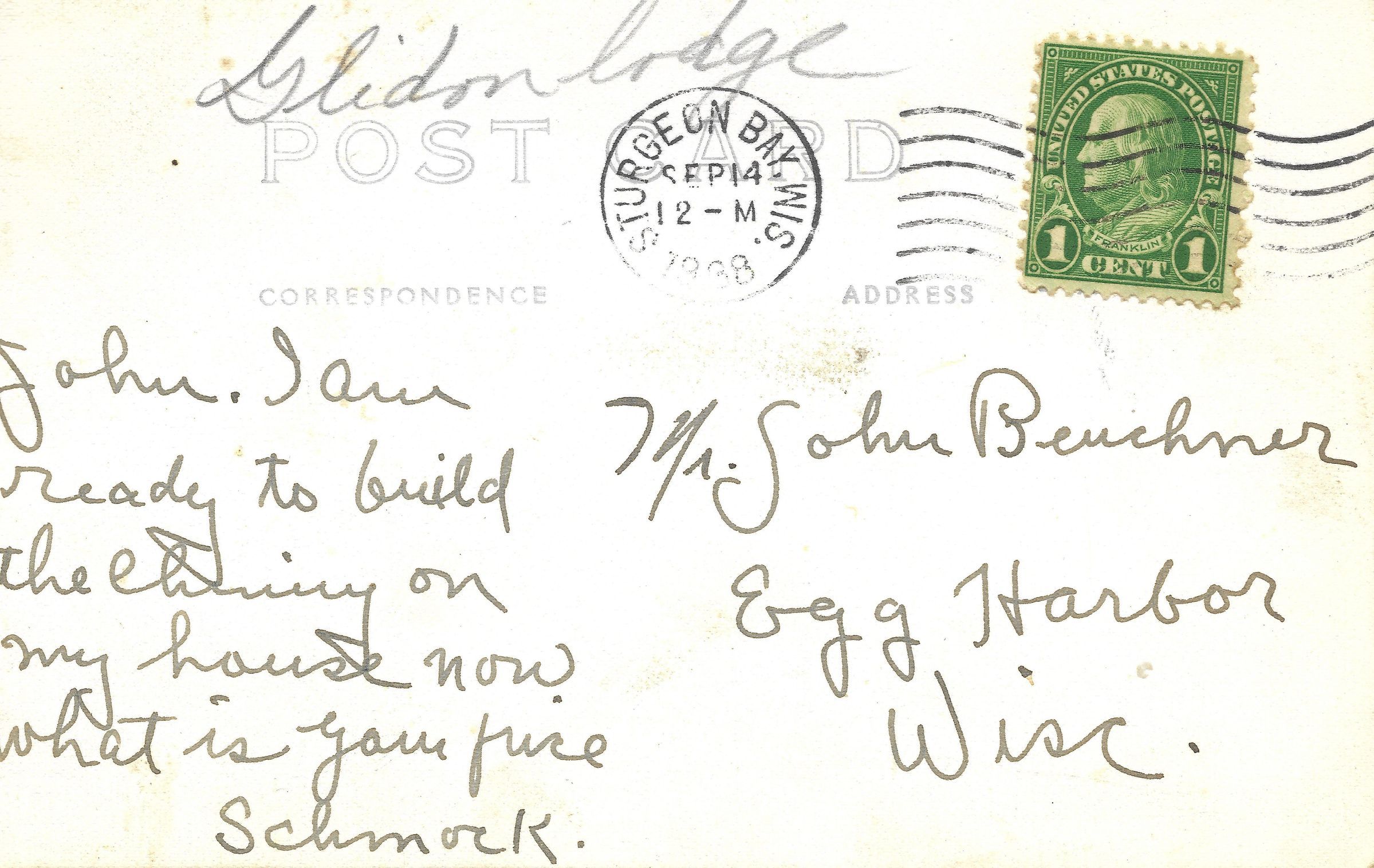 9-14-38 Glidden Lodge Postcard to John Buechner.Cataloged By