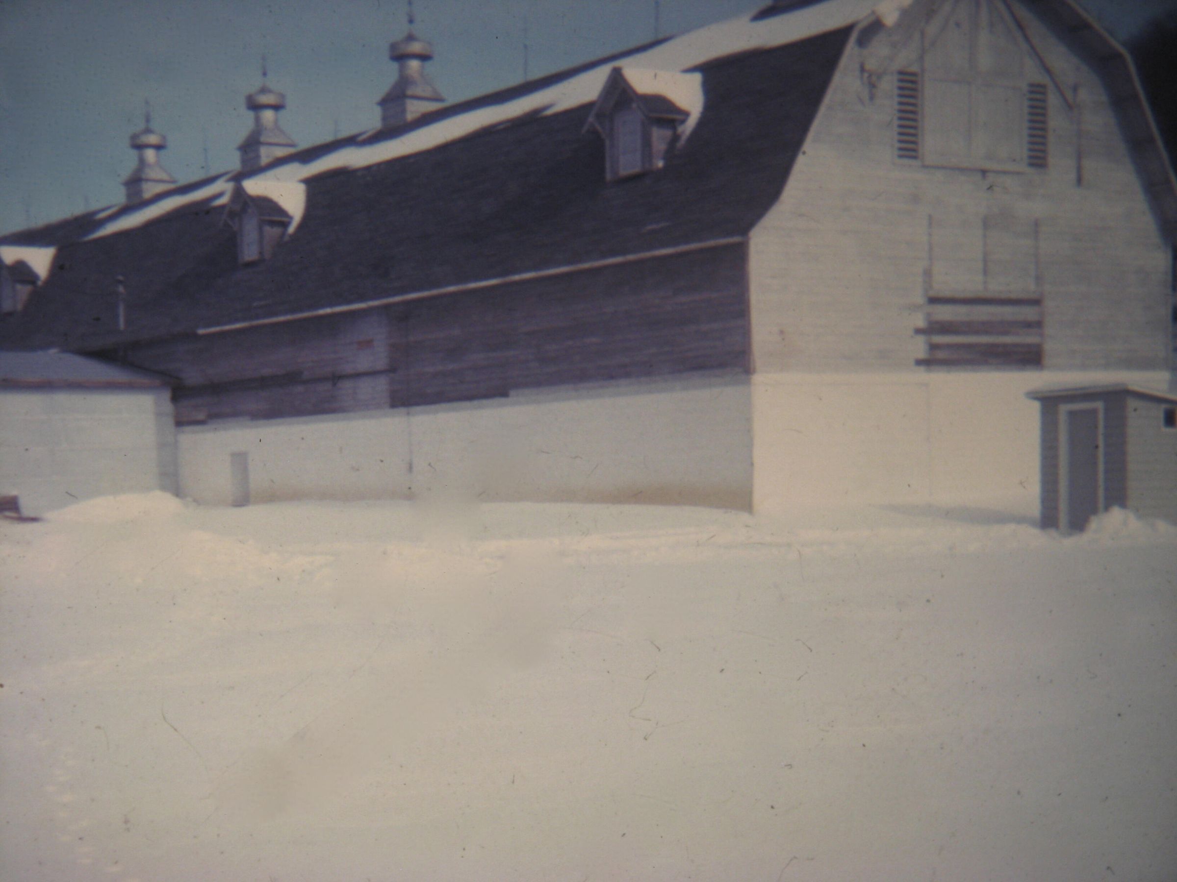 One of the many large barns in winter at Horseshoe Bay Farms, unknown date.Photograph Details