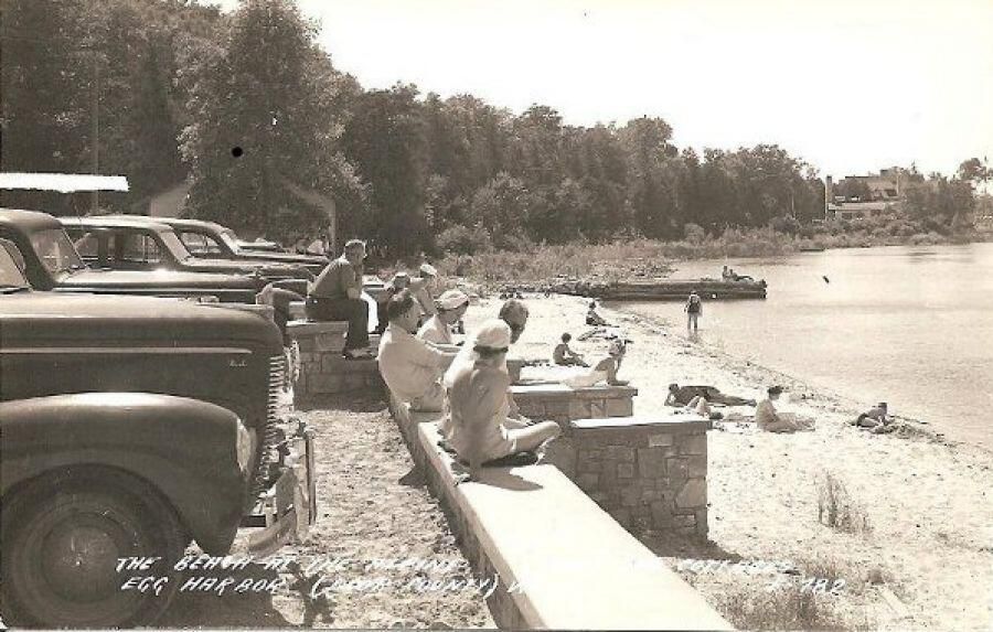 Group of people on the wall at the Alpine Resort's beach; autos appear to be from the 1940s.Photograph Details