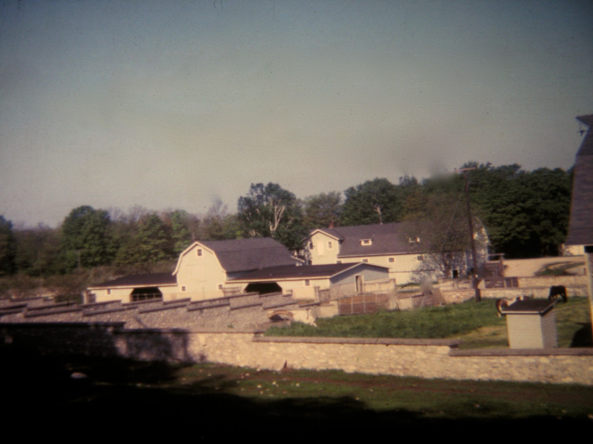 Barns, sheds, and stone fences are seen at Horseshoe Bay Farms in summer, unknown date.Photograph Details