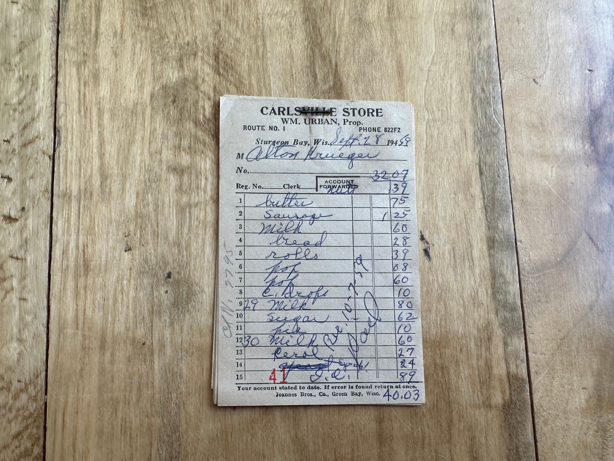 Receipts from Carlsville Store detailing purchases made in September of 1959. Items purchased by Alton Krueger included butter, sausage, milk, bread, and other foodstuffs.Cataloged By