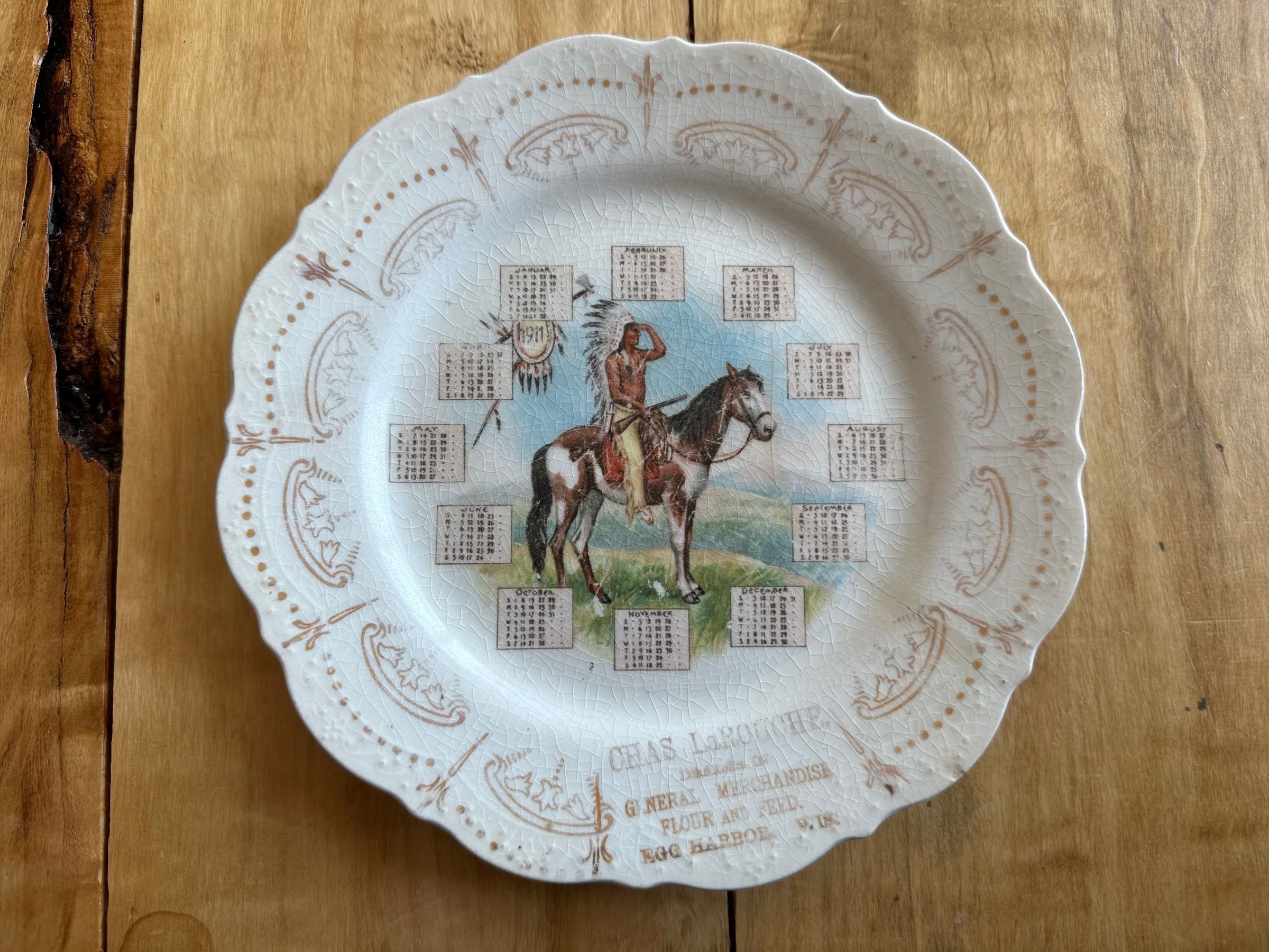 Porcelain plate with "Chas LaRouche Dealer in General Merchandise Flour and Feed. Egg Harbor, Wis." and a monthly calendar of 1911 surrounding an indigenous man on a horse.Cataloged By